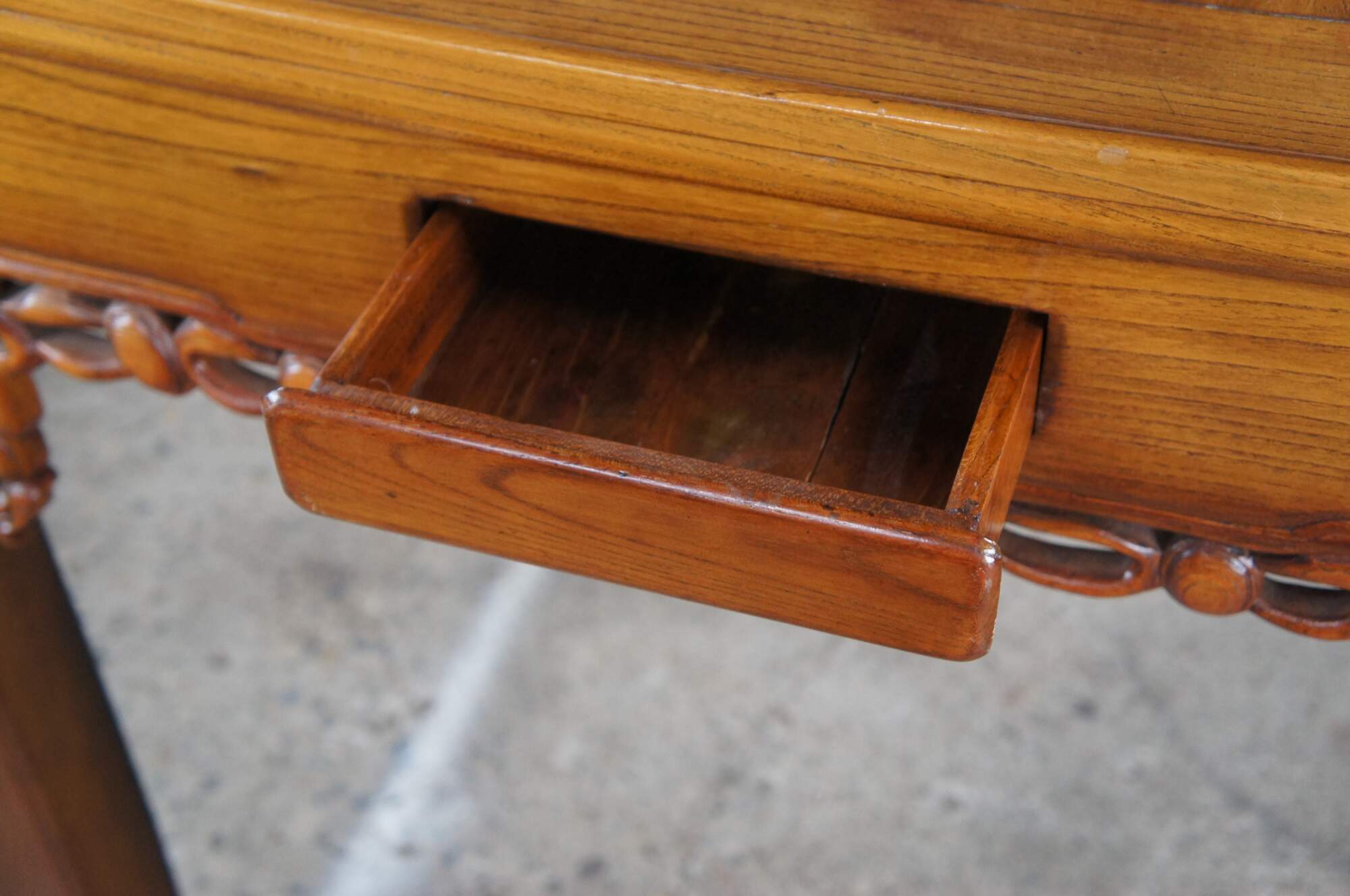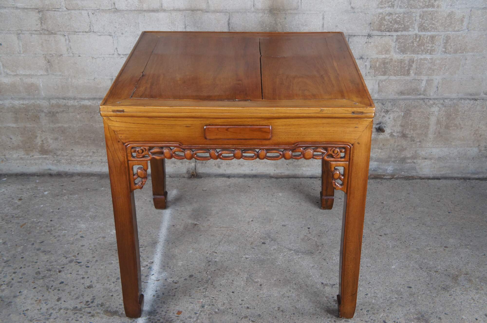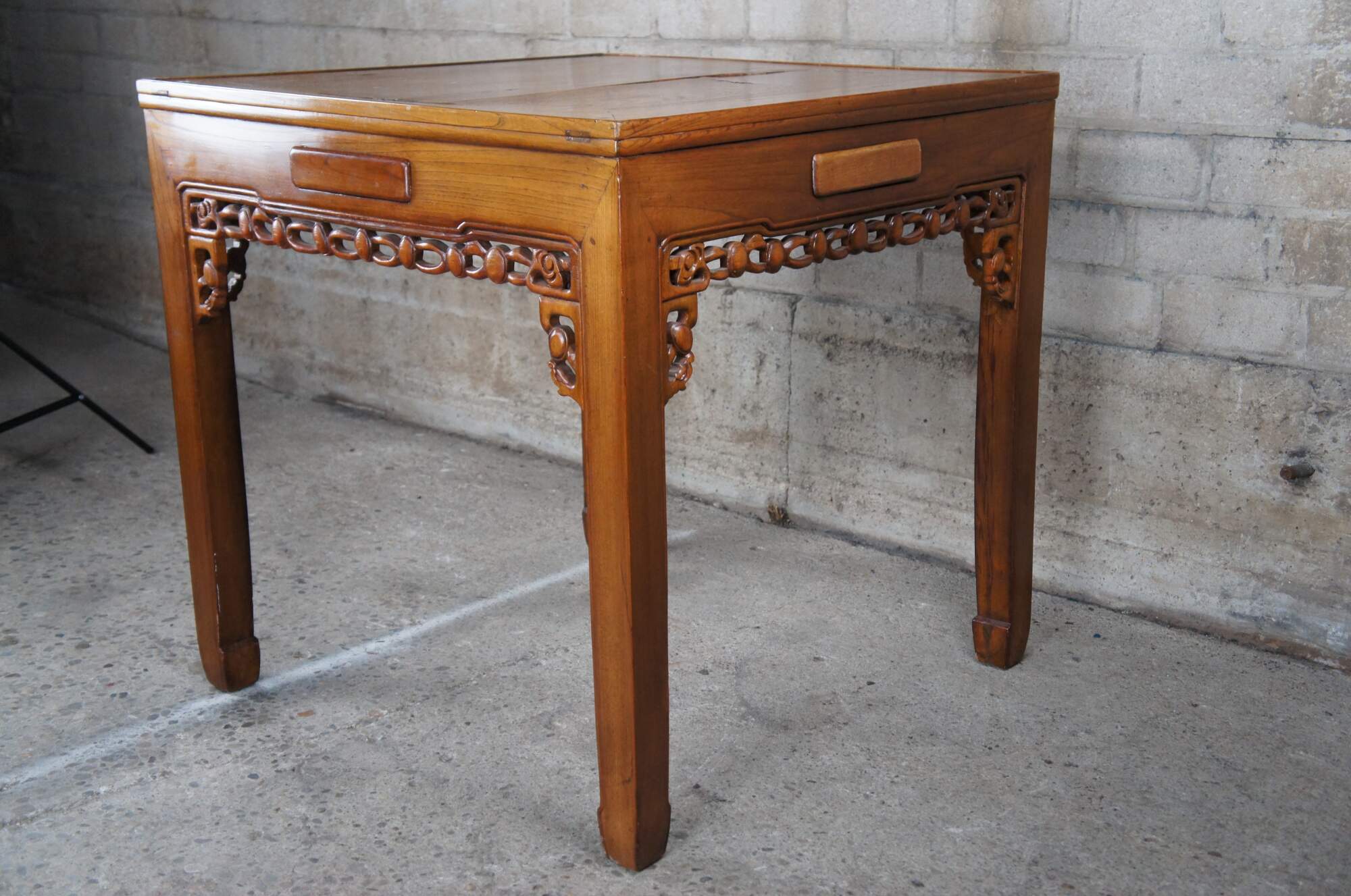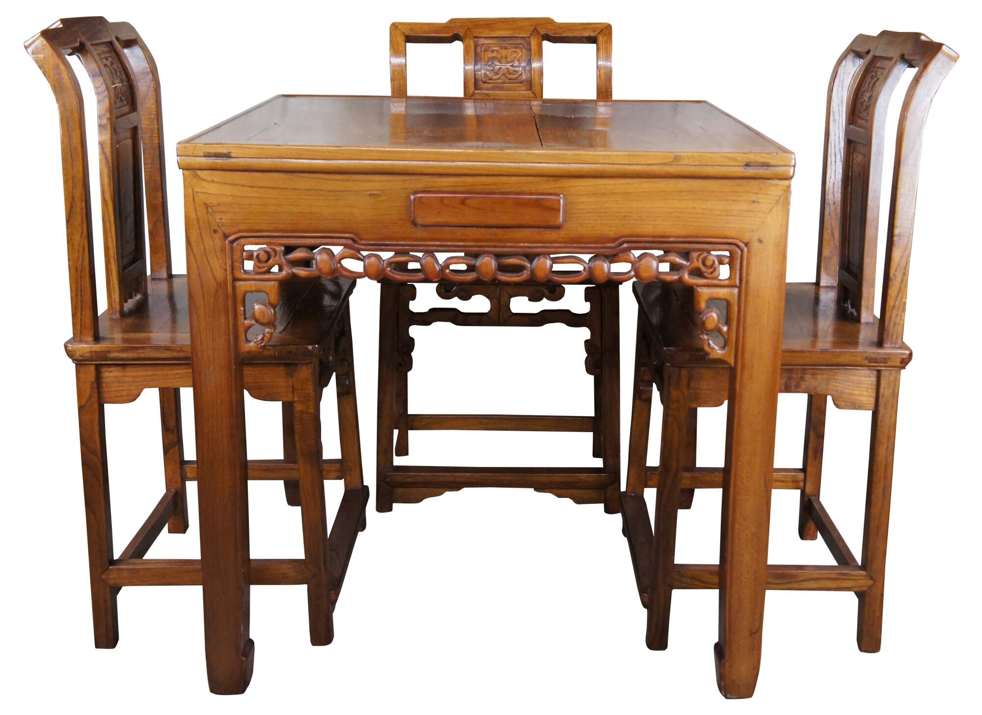 A beautiful Japanese solid elm Mahjong table and 4 chairs.. Purchased in Japan during the last quarter of the 20th century. Table features Square form with carved and pierced apron. Includes a dovetailed drawer along each side and a glass top. Chairs have a carved back and scrolling front apron. Built via Mortise and Tenon joinery.