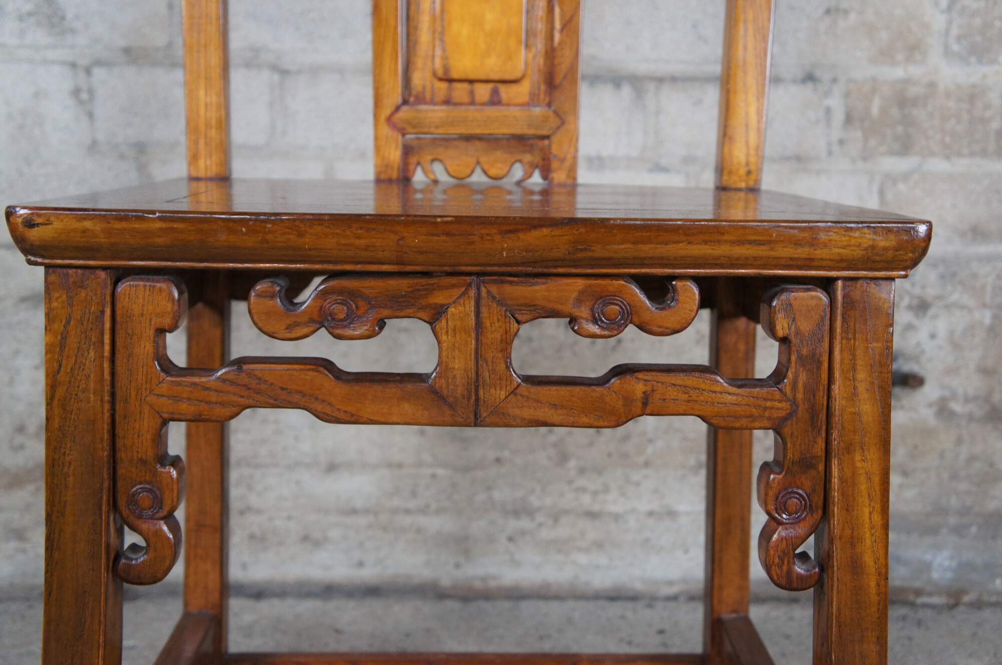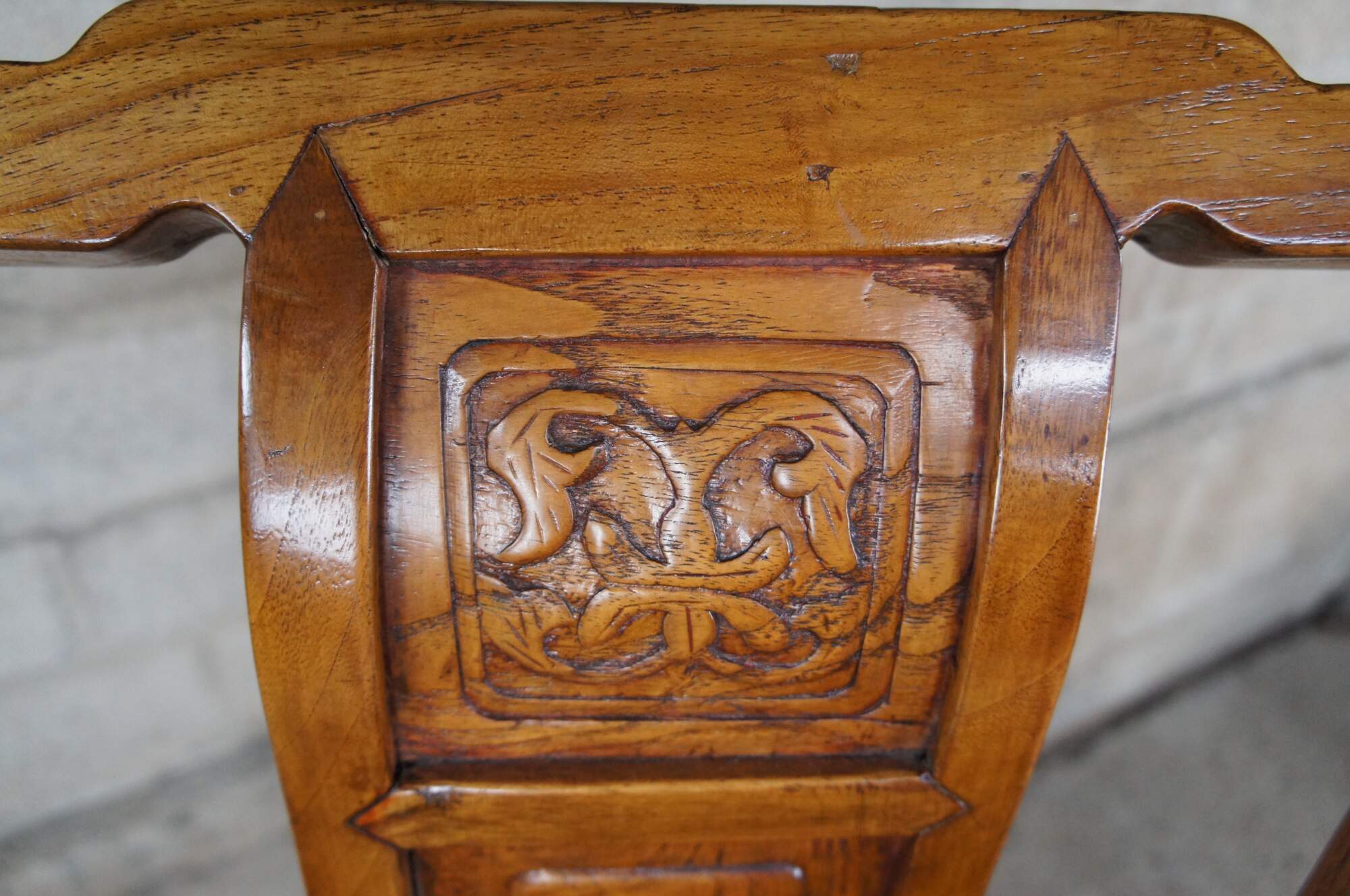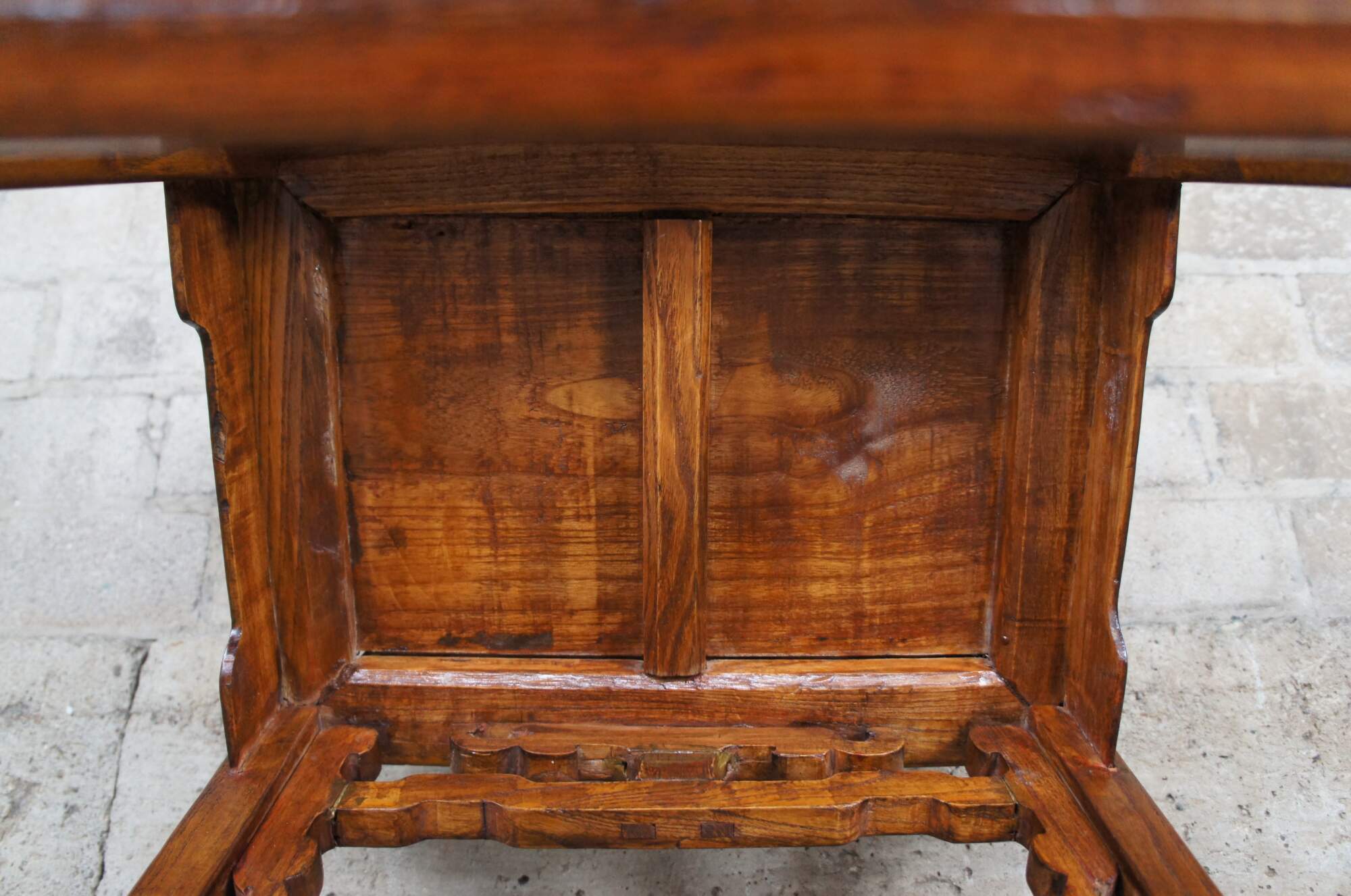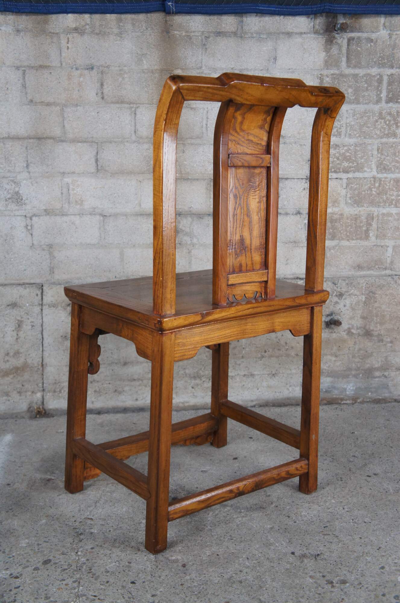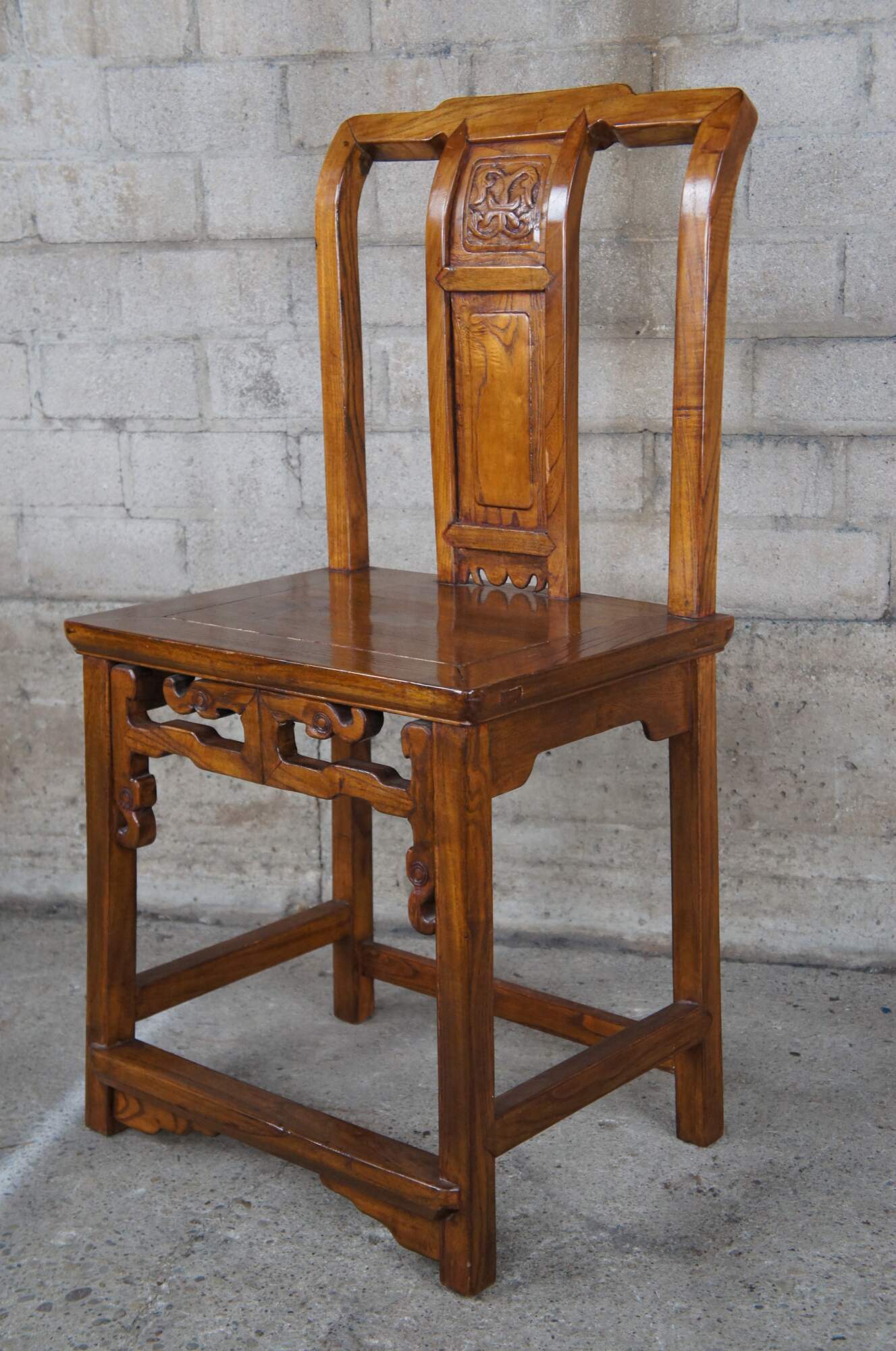 A beautiful Japanese solid elm Mahjong table and 4 chairs.. Purchased in Japan during the last quarter of the 20th century. Table features Square form with carved and pierced apron. Includes a dovetailed drawer along each side and a glass top. Chairs have a carved back and scrolling front apron. Built via Mortise and Tenon joinery.