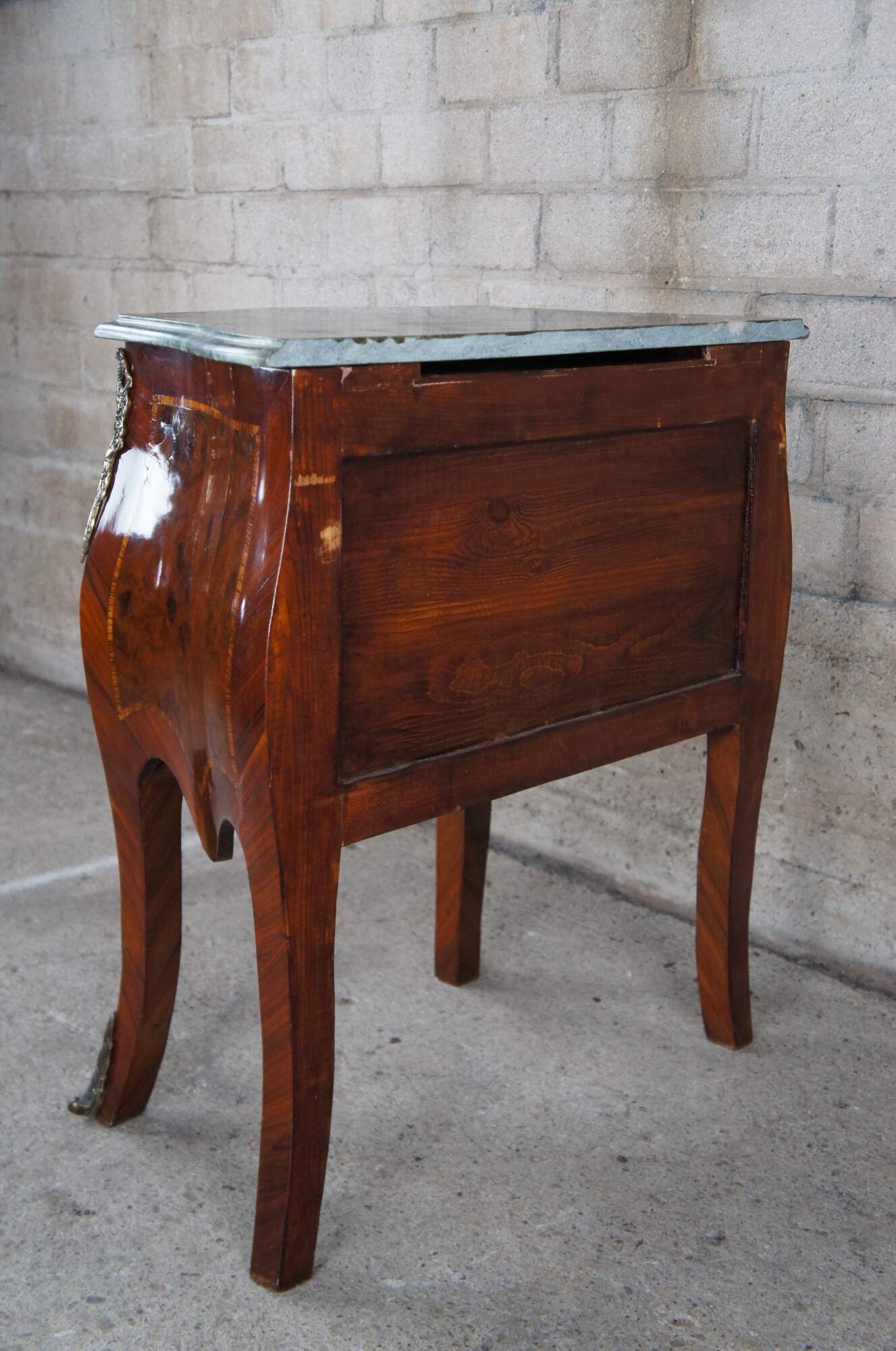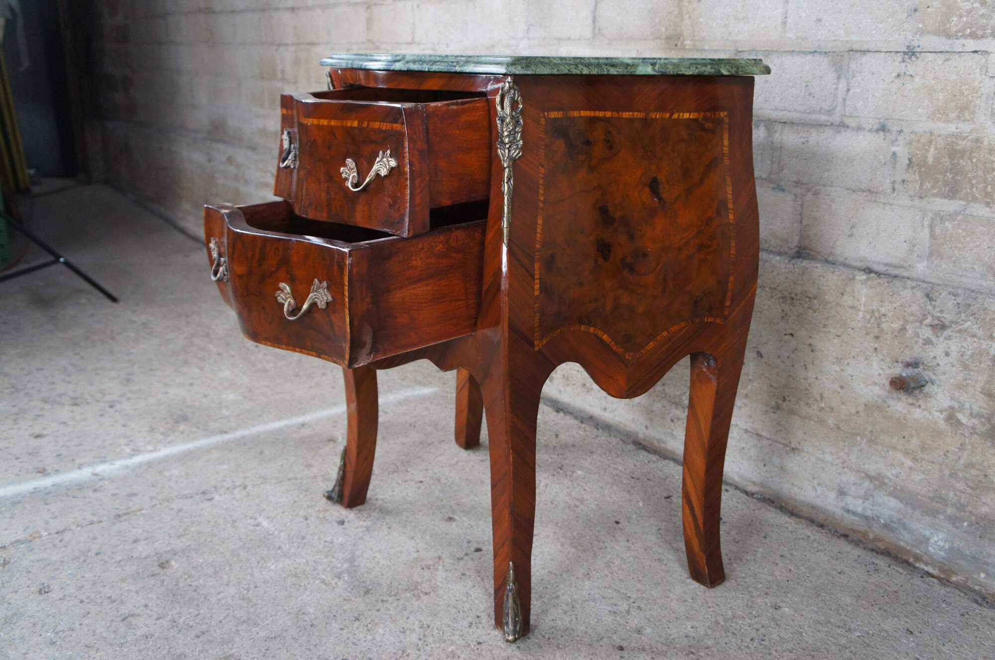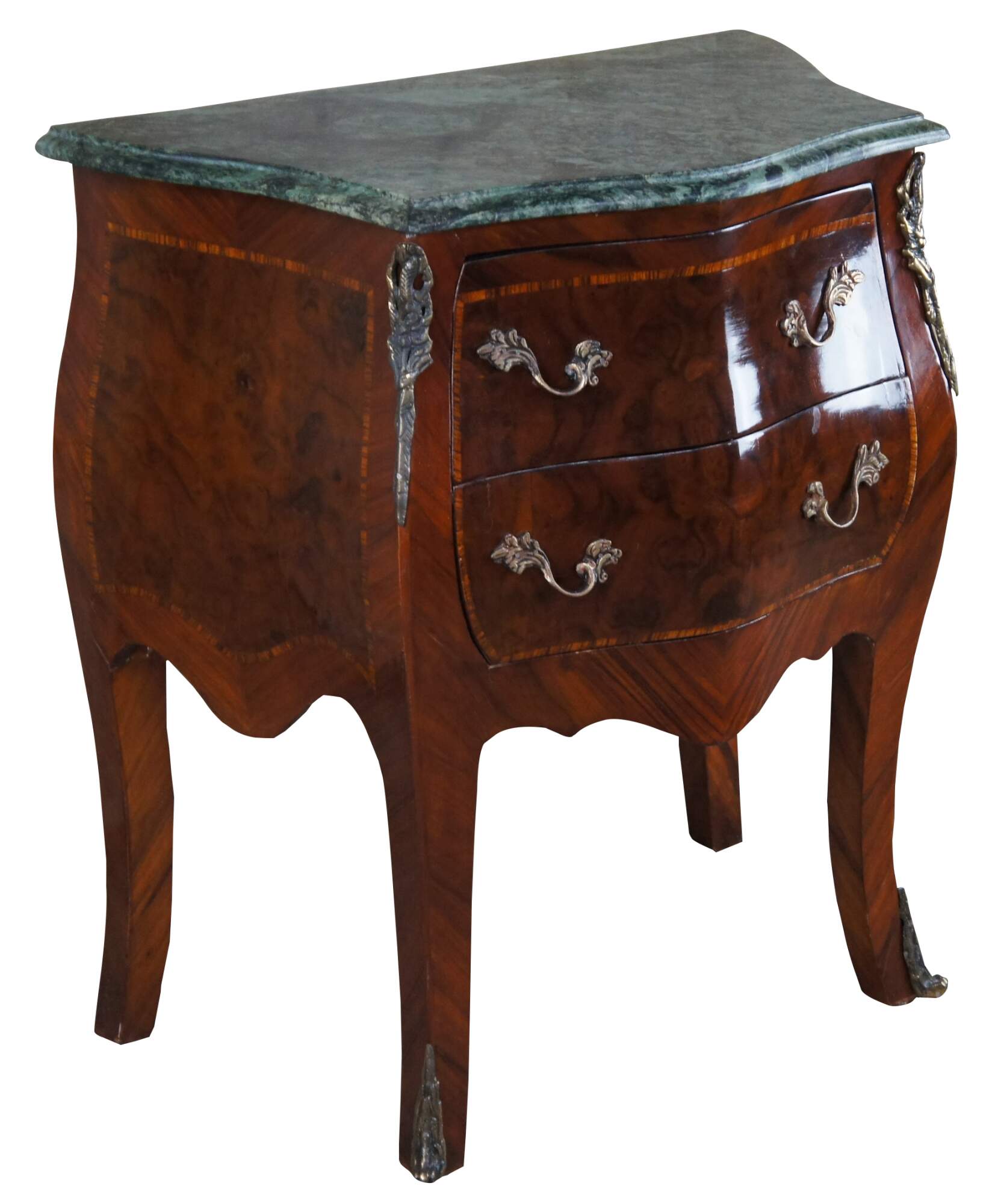 A beautiful 20th century Italian Louis XV serpentine bombe chest of drawers. Made from mahogany with matchbook veneer and banded burled panels. Features a green marble top and ormolu mounts. Great for use as a nighstand, bedside, and accent table, hallway or entry console.