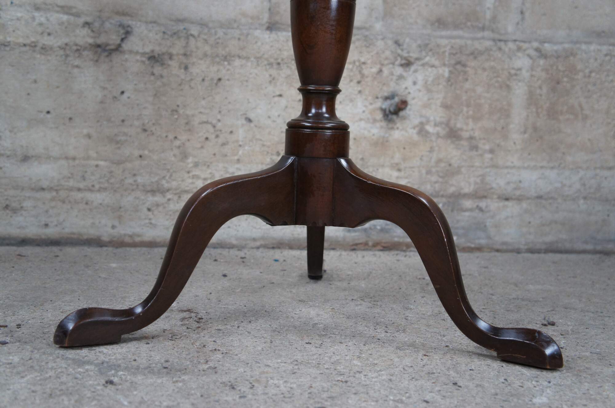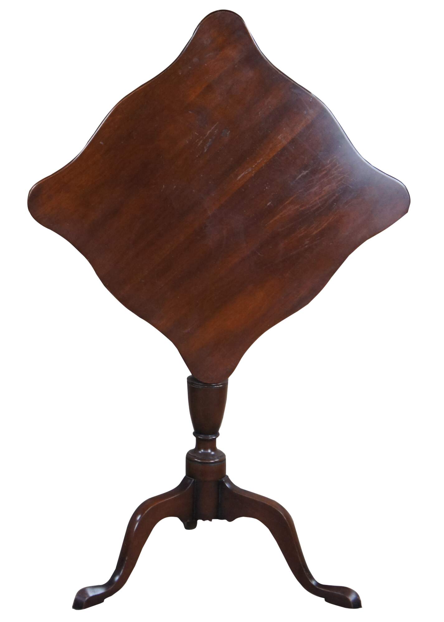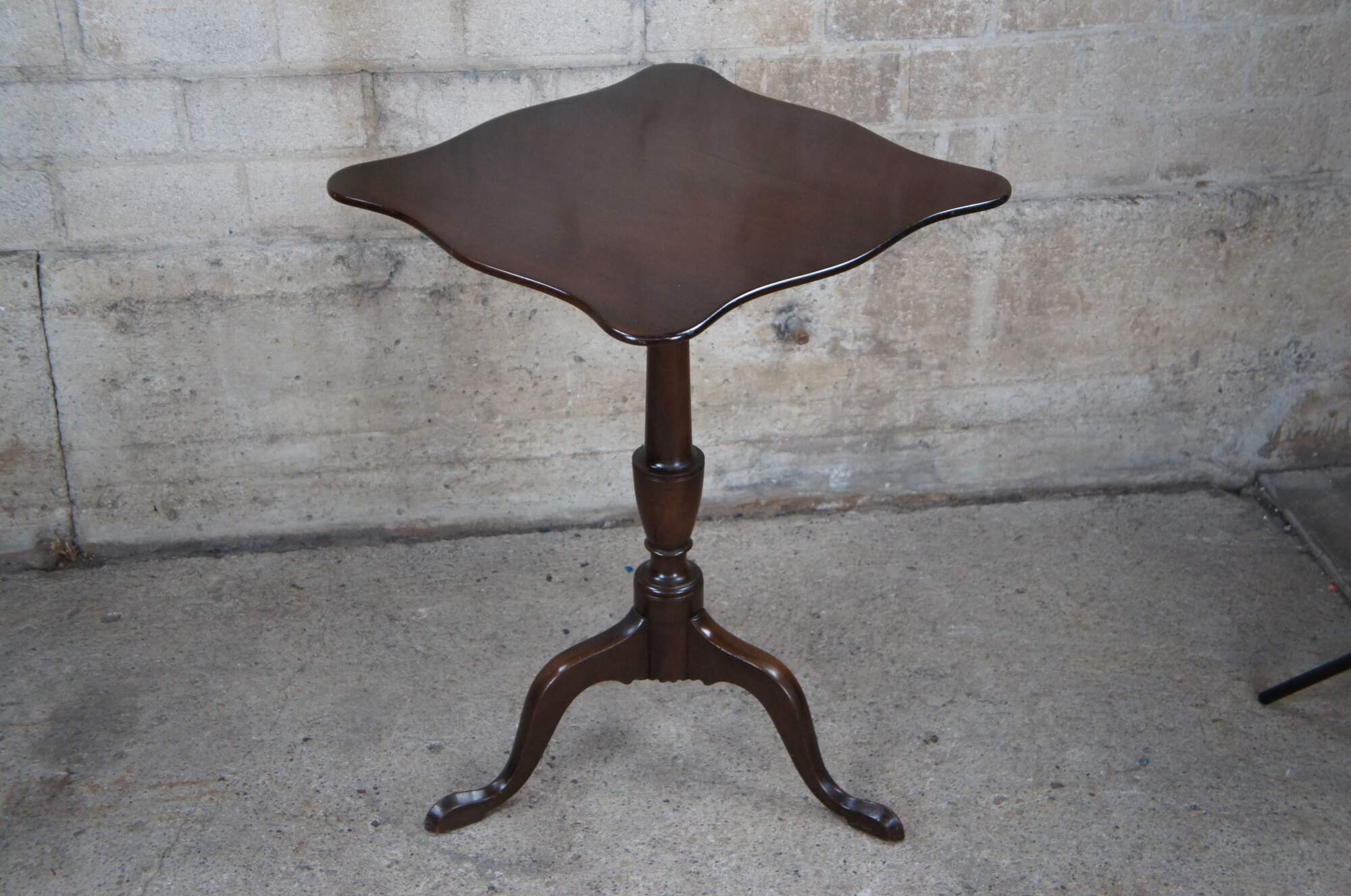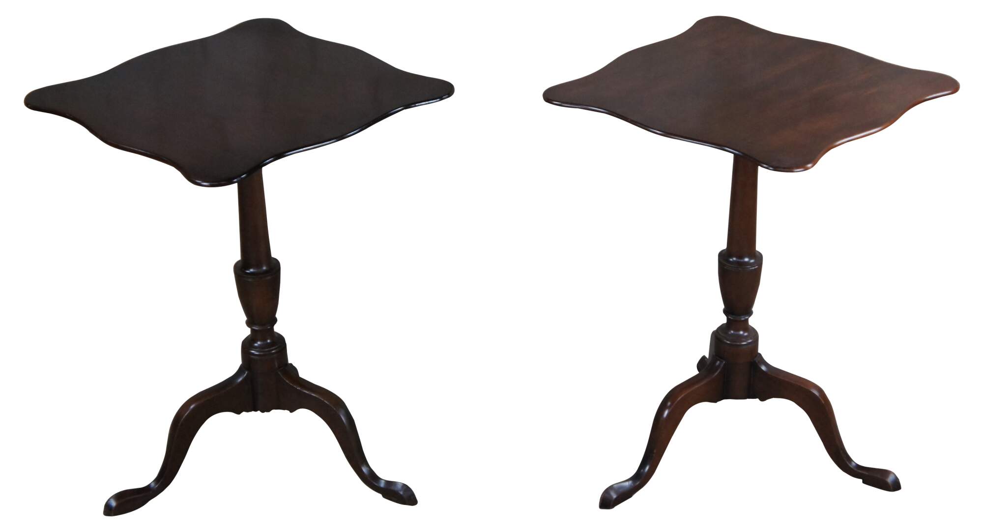 Pair of Federal style mahogany candlestand by Kittinger, circa 1960s. Williamburg Restoration Line. Features a rectangular top with serpentine edge over a baluster turned base with cabriole legs leading to pad feet.