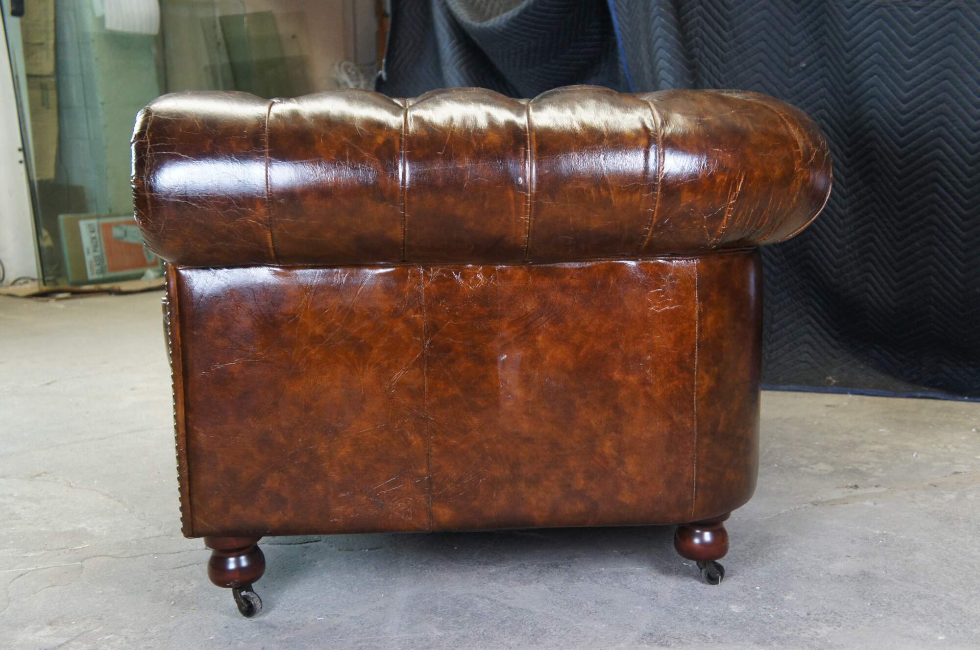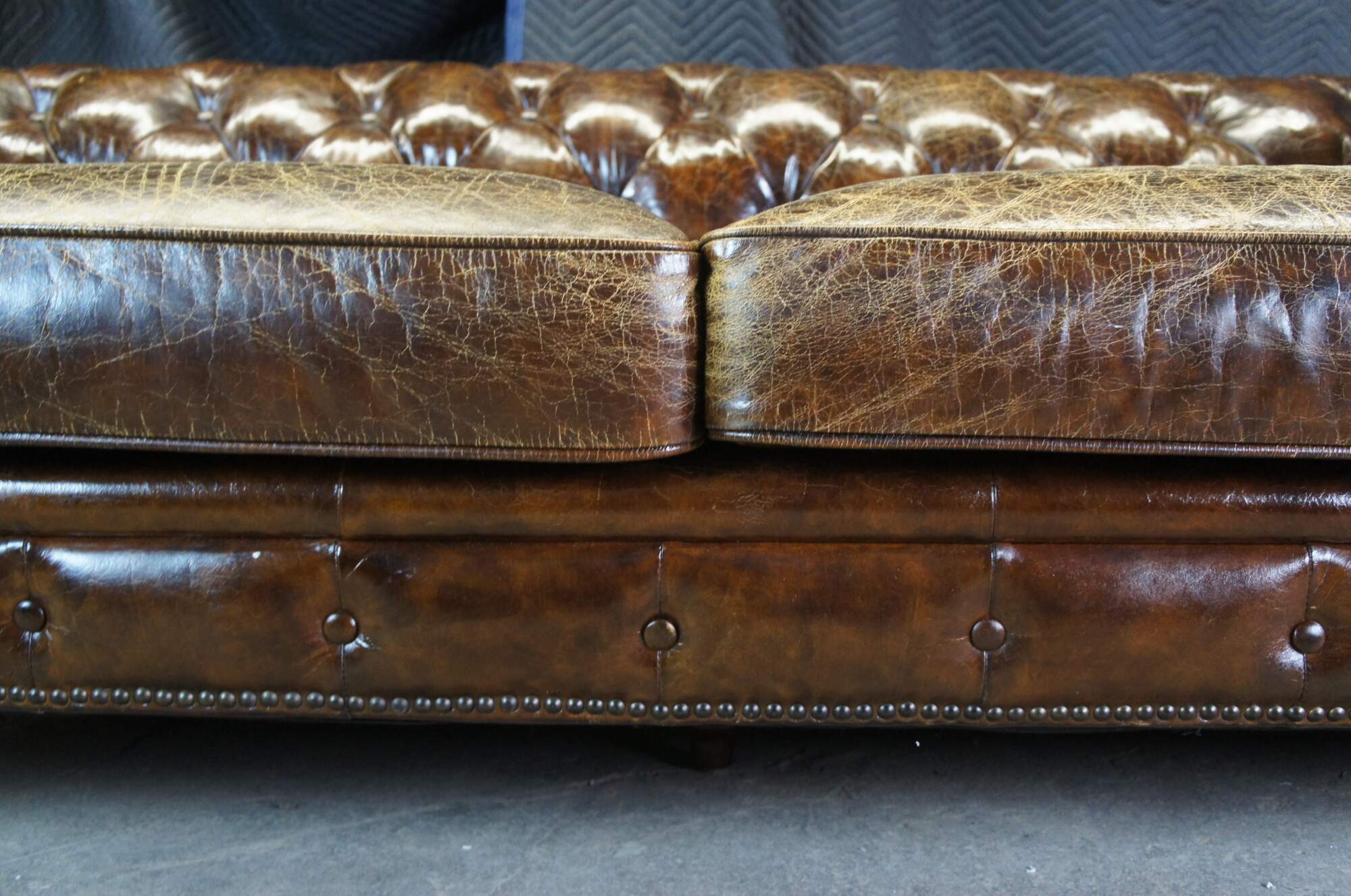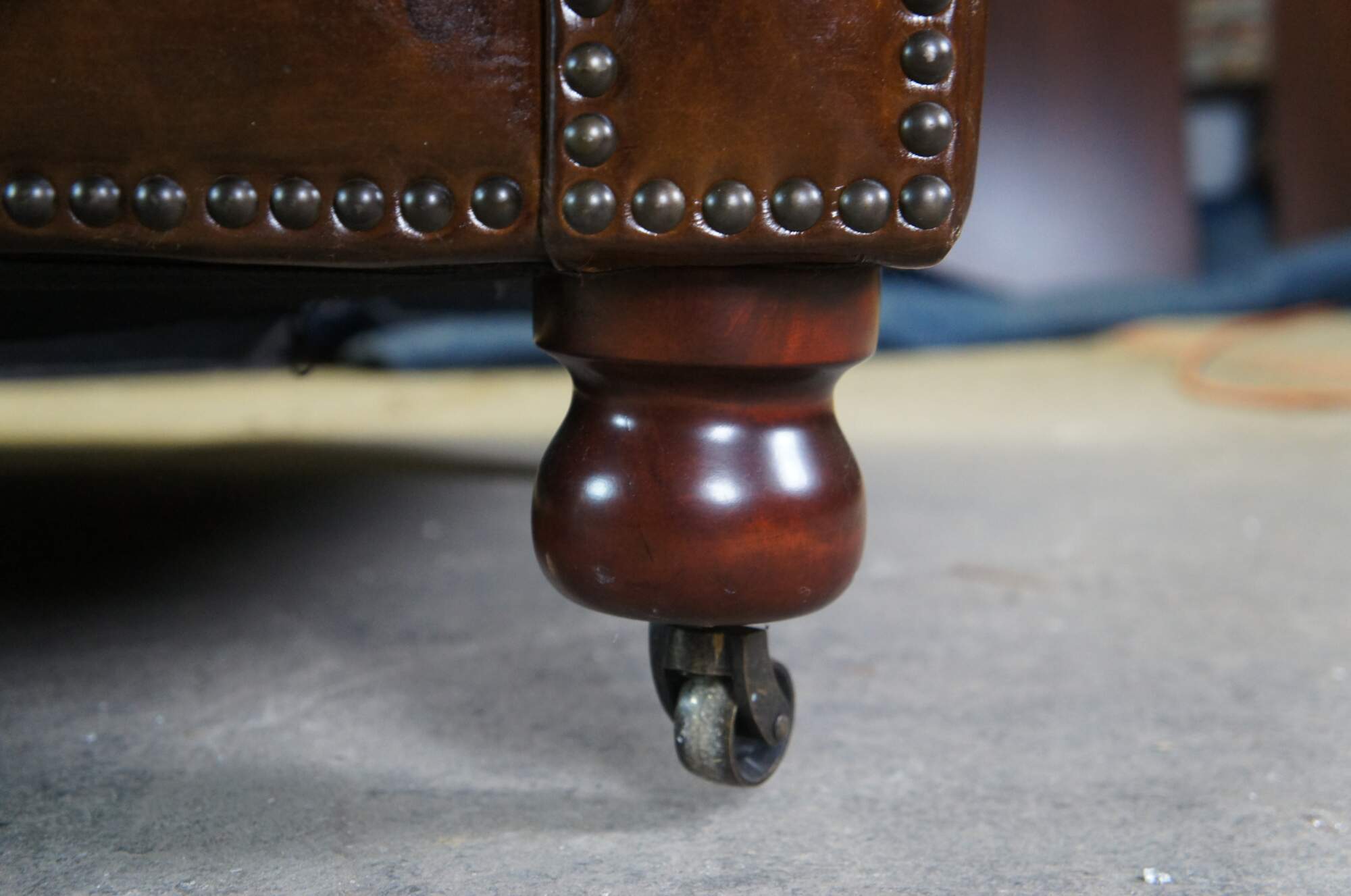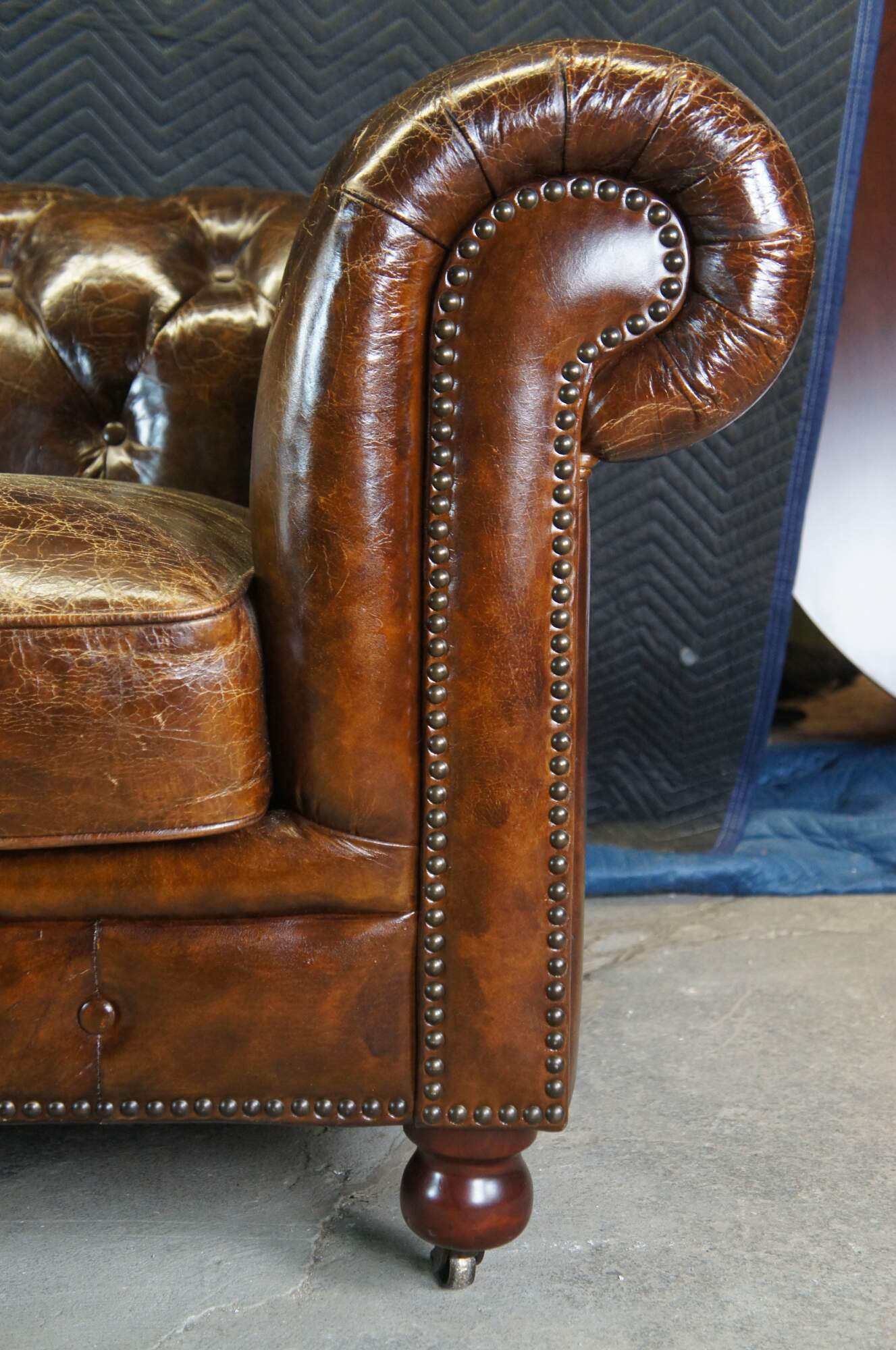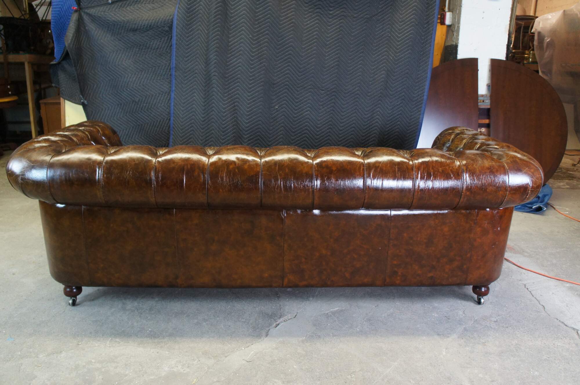 An elegant 20th Century Chestefield sofa. Upholstered in a warm brown leather with natural distressing, tufting and nailhead trim. The sofa rest on mahogany bun feet with casters.