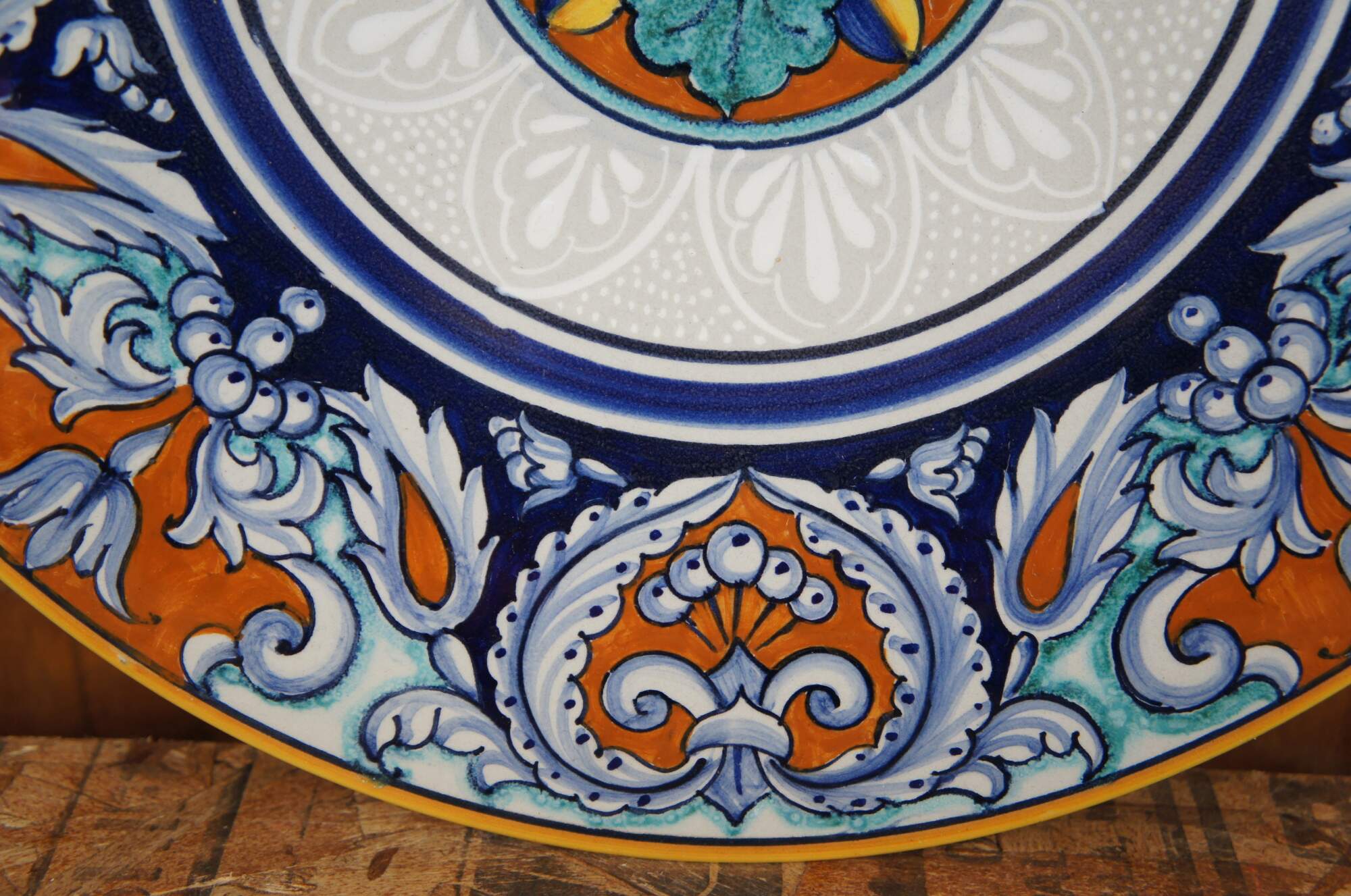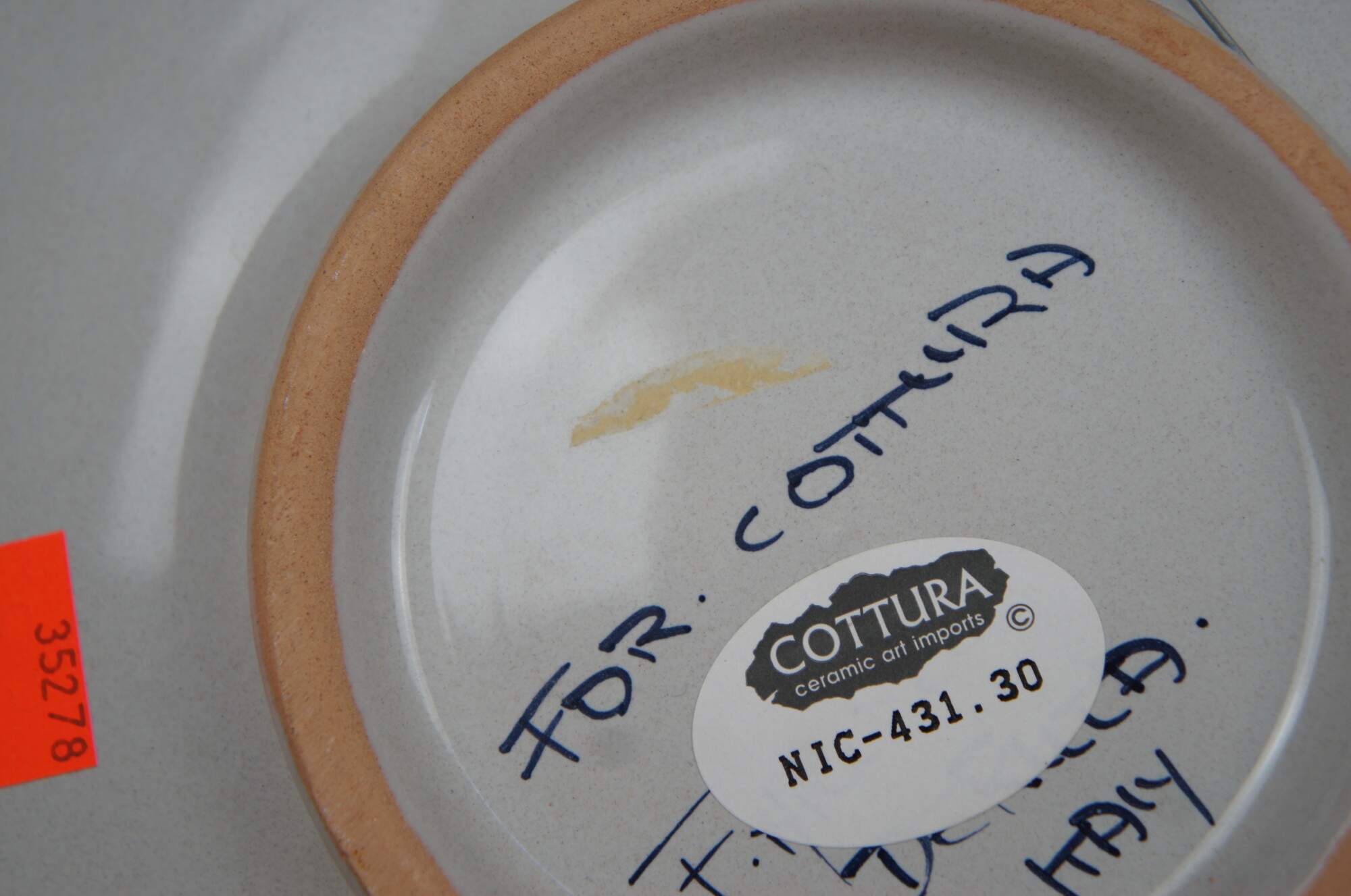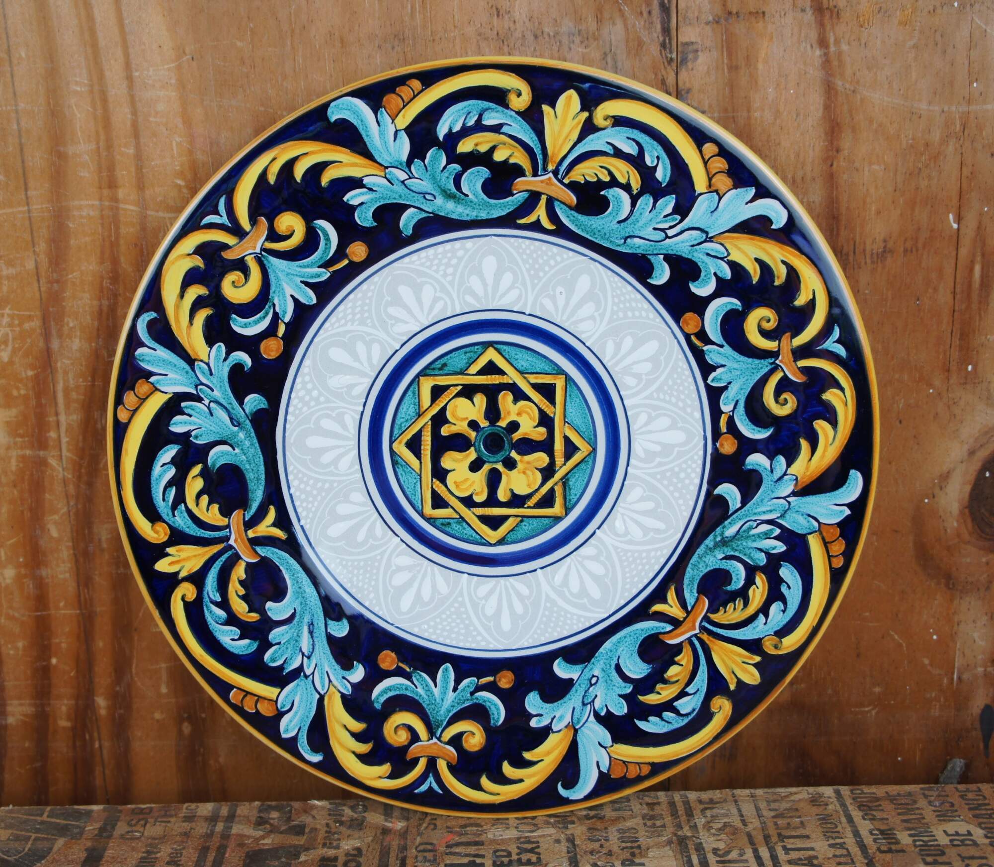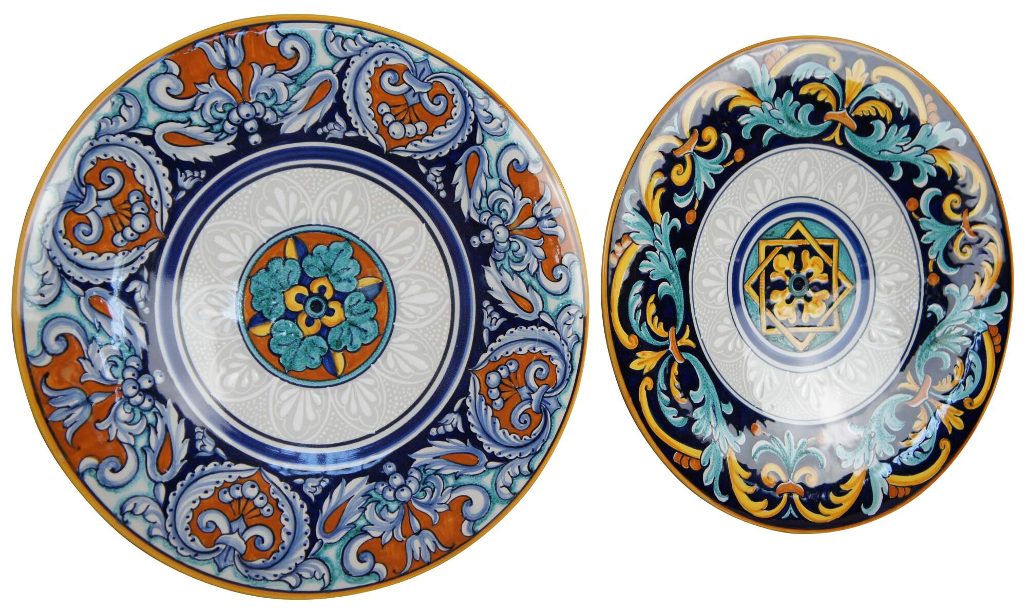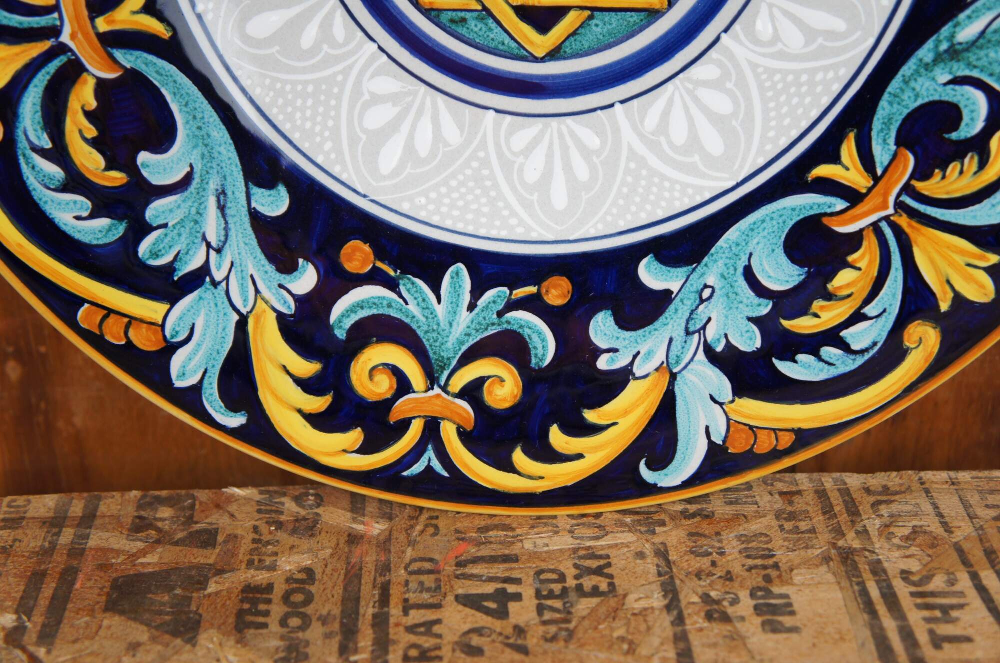 Two ceramic Francesca plates made in Deruta Italy for Cottura pottery with colorful geometric patterns both with wire for hanging.