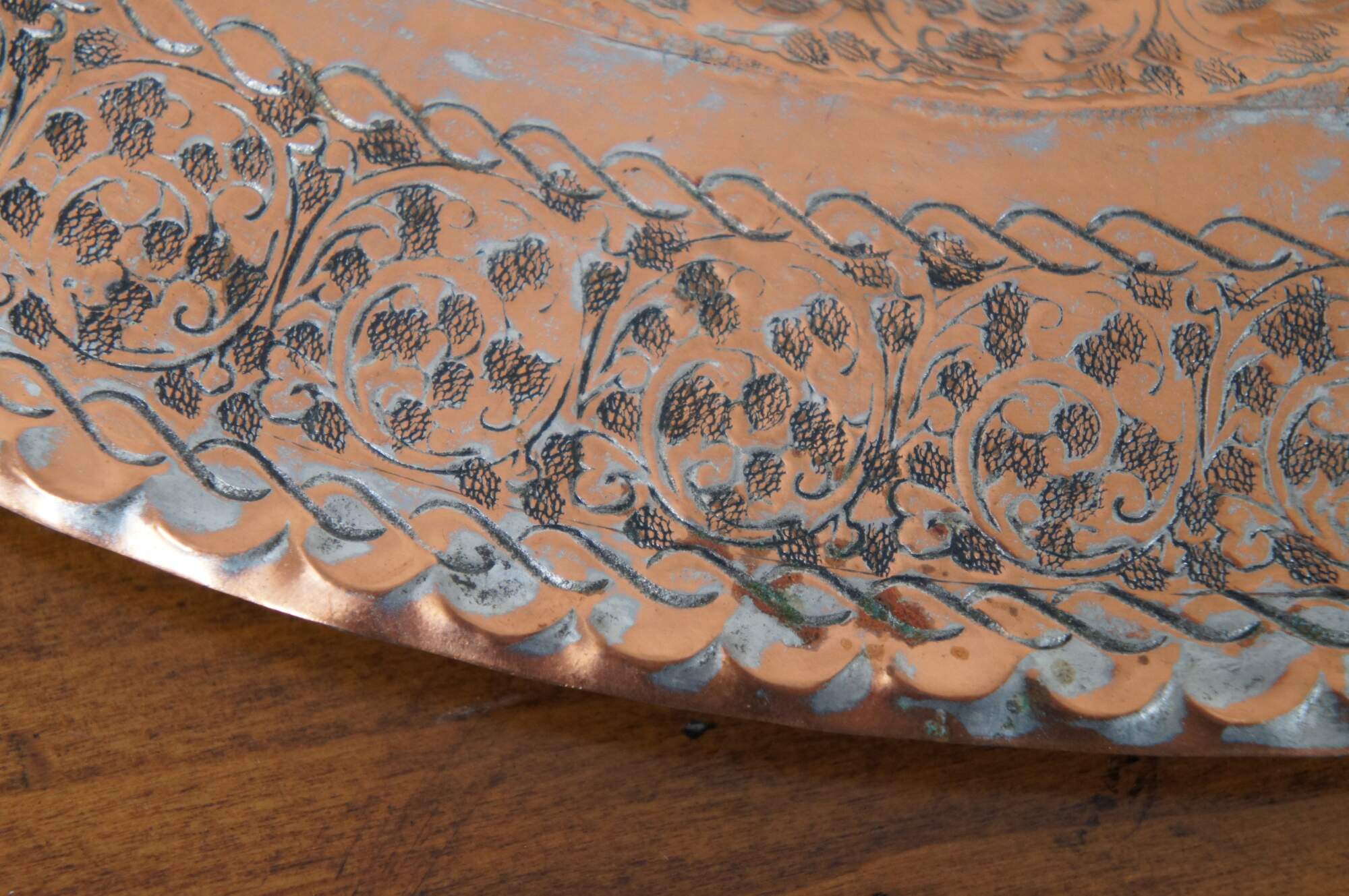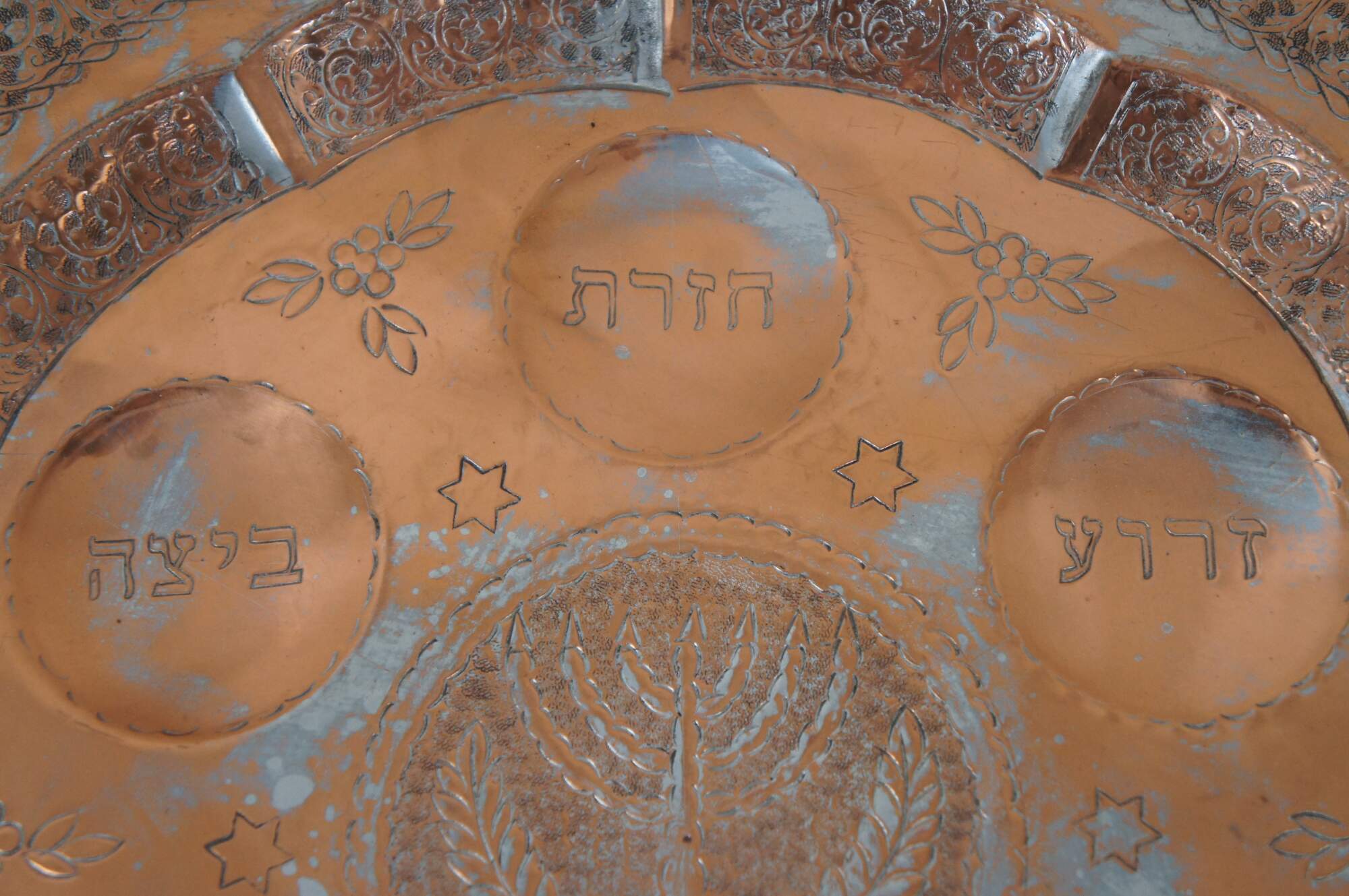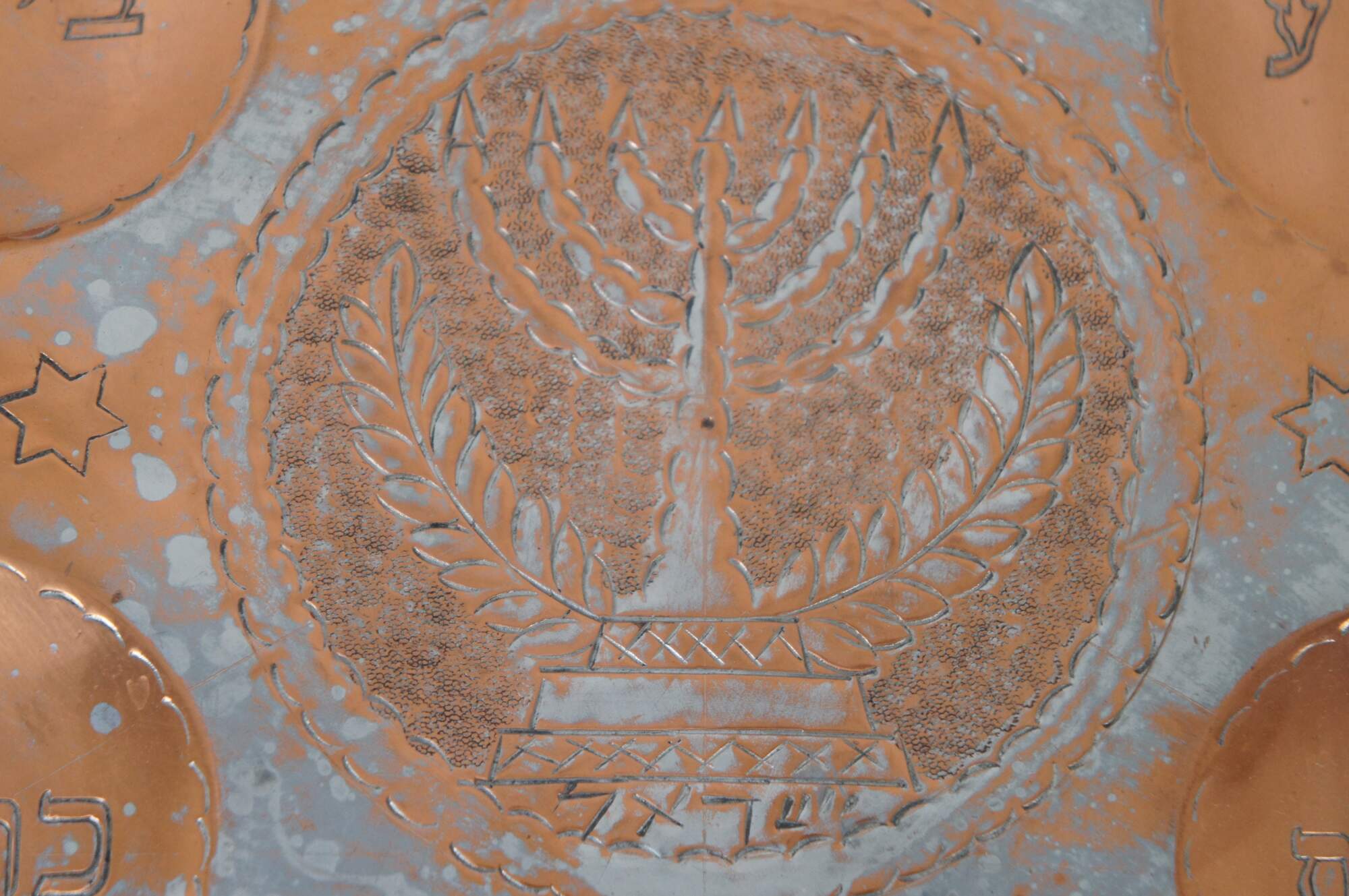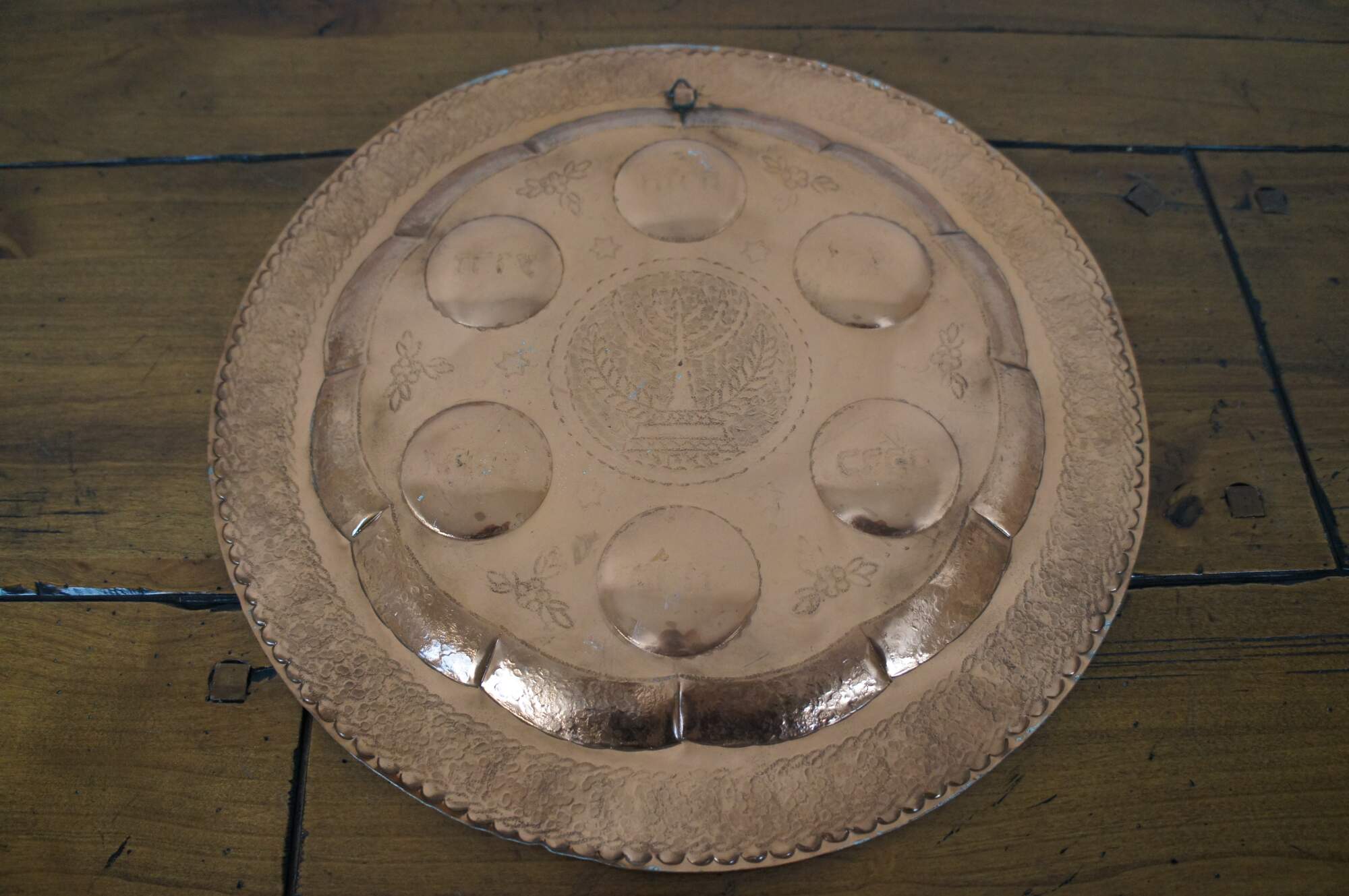 Vintage chased copper plate / platter for the Jewish celebration of the Passover Seder, with attached hook for displaying on the wall. Marked “Handmade in Israel” on hook. Attributed to Messica.