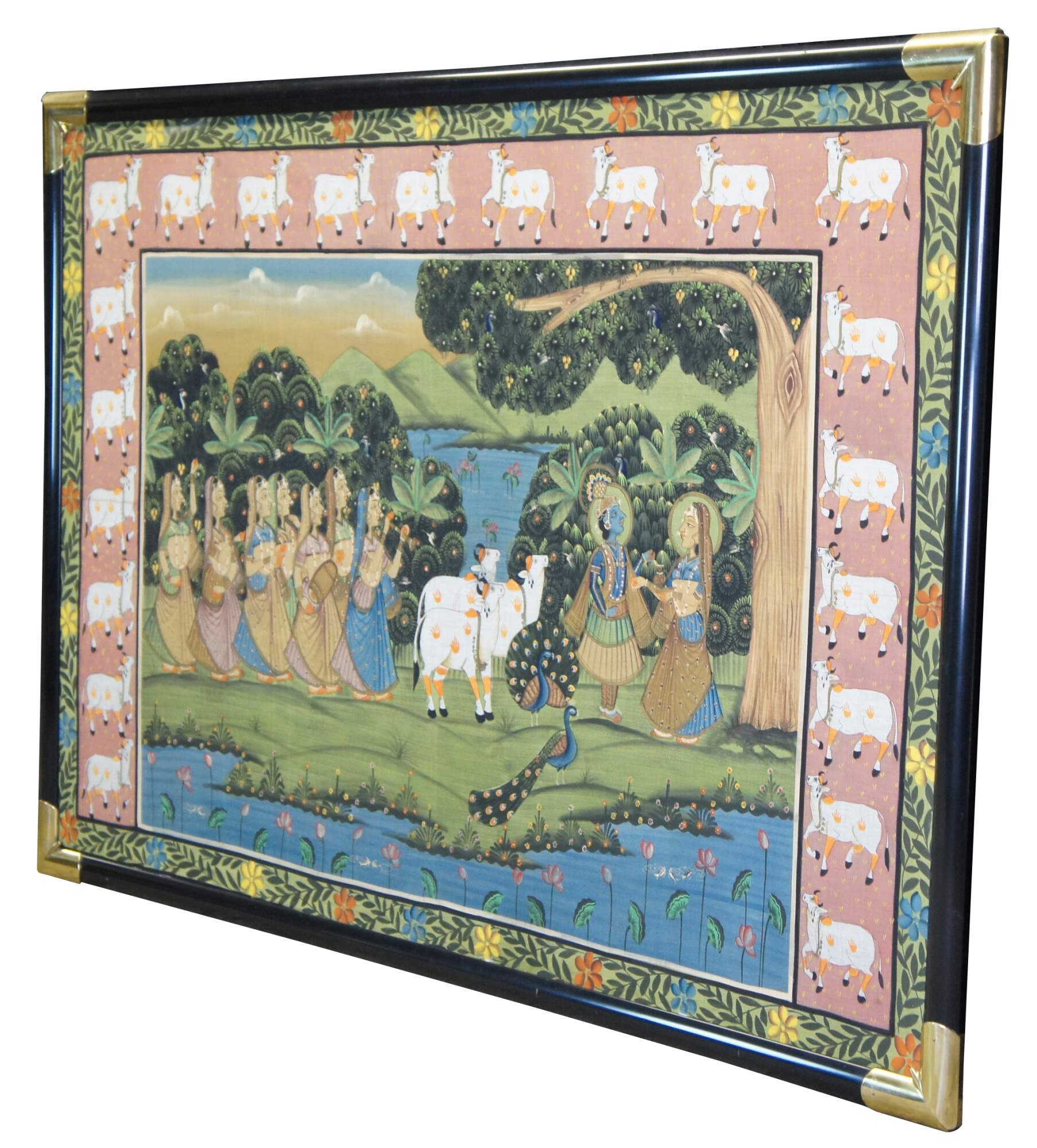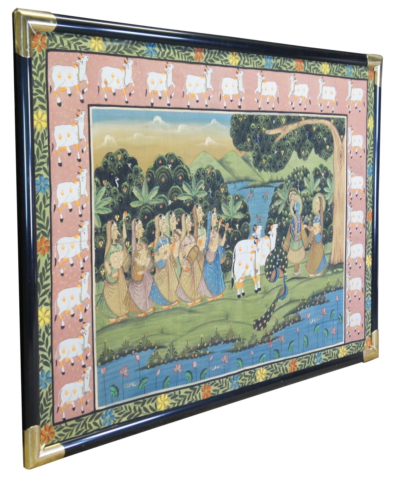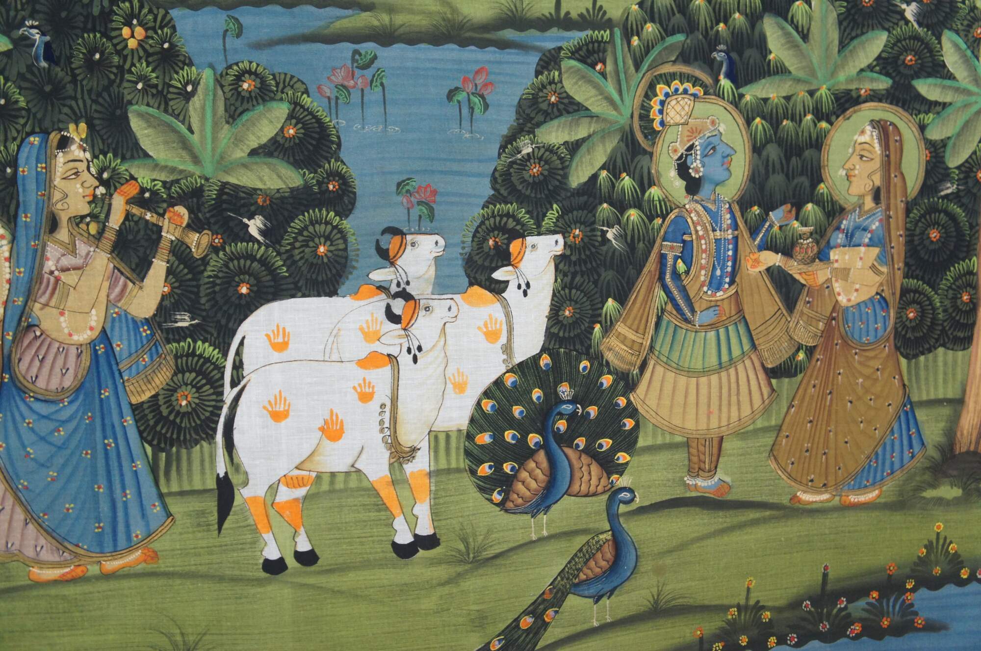 The word Pichwai comes from 'pichh' meaning back, and 'wai', meaning textile hanging. They are made by members of the Pushti Marg sect, founded by Shri Vallabhacharya in the 16th Century. Originally, pichwai paintings were used to decorate the temple of Shrinathji (Shrinathji ki Haveli) in Nathdwara, hung behind the deity to celebrate different seasons, festivals and events in Lord Krishna's life. Over time, pichwais also found a place in the homes of art connoisseurs, owing to their visual appeal. Like several other traditional Indian art forms, the art of Pichwai is also dying, and requires recognition and revival.