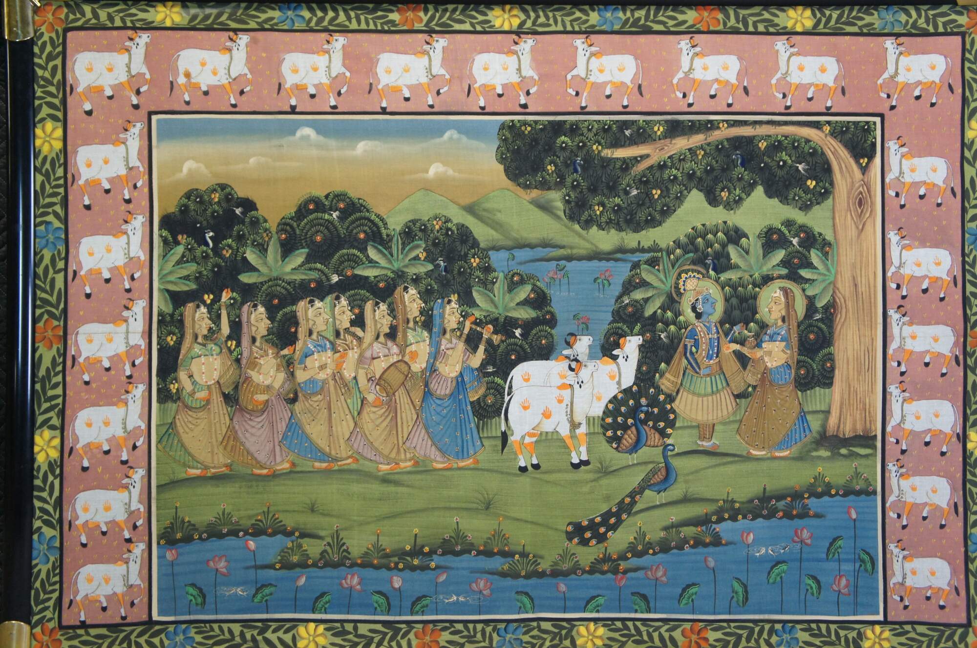 Pichwai (pichvai or Pichhavai) is a style of painting that originated over 400 years ago, in the town of Nathdwara near Udaipur in Rajasthan, India. Intricate and visually stunning, pichwai paintings, made on cloth, depict tales from Lord Krishna's life. Creating a pichwai can take several months, and requires immense skill, as the smallest details need to be painted with precision. Lord Krishna is often depicted as Shrinathji in Pichwais, which is the deity manifest as a seven-year-old child. Other common subjects found in pichwai paintings are Radha, gopis, cows and lotuses. Festivals and celebrations such as Sharad Purnima, Raas Leela, Annakoot or Govardhan Puja, Janmashtami, Gopashtami, Nand Mahotsav, Diwali and Holi are frequently depicted in Pichwais.