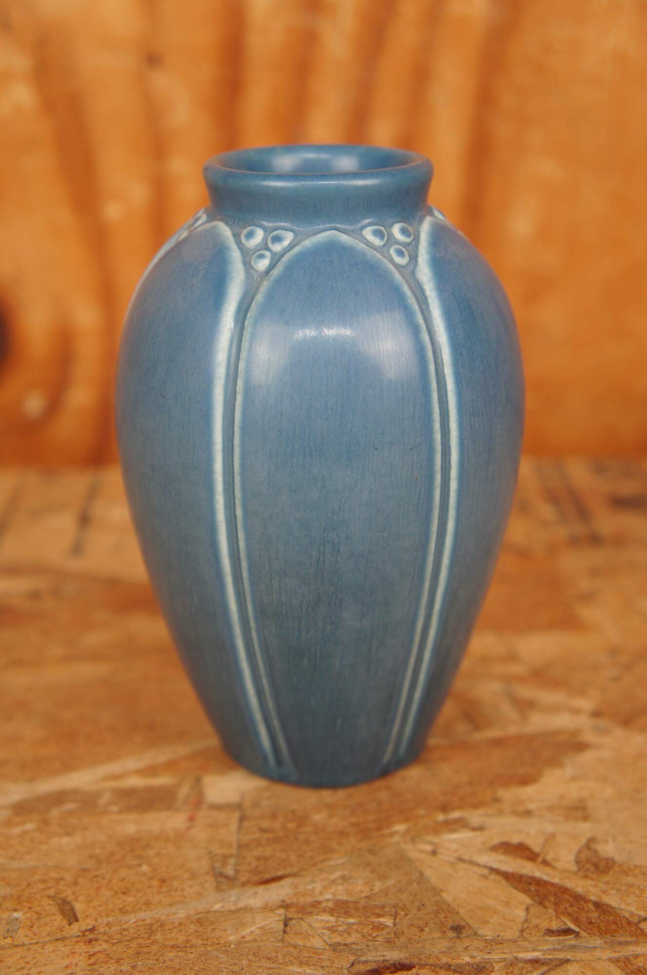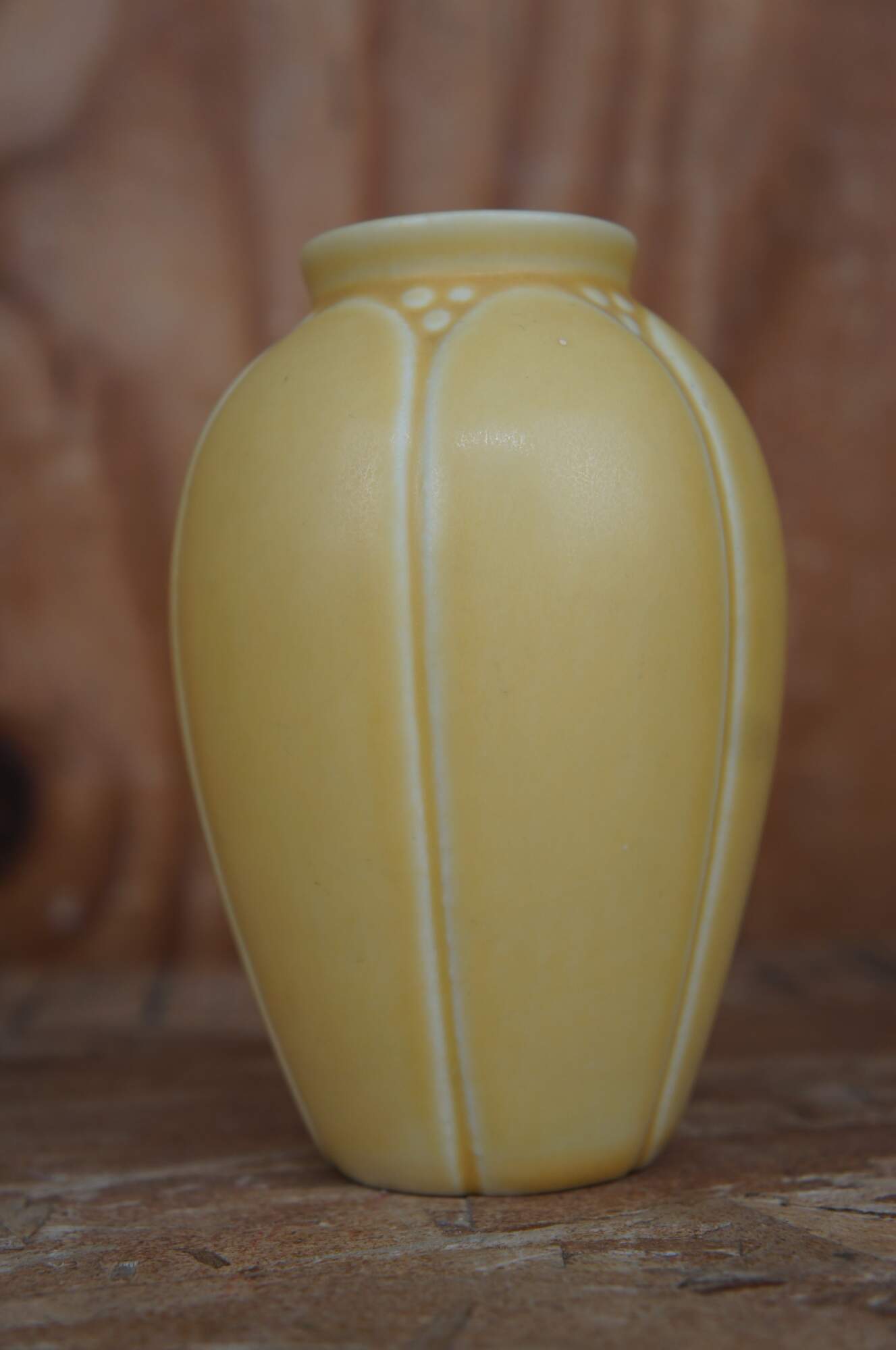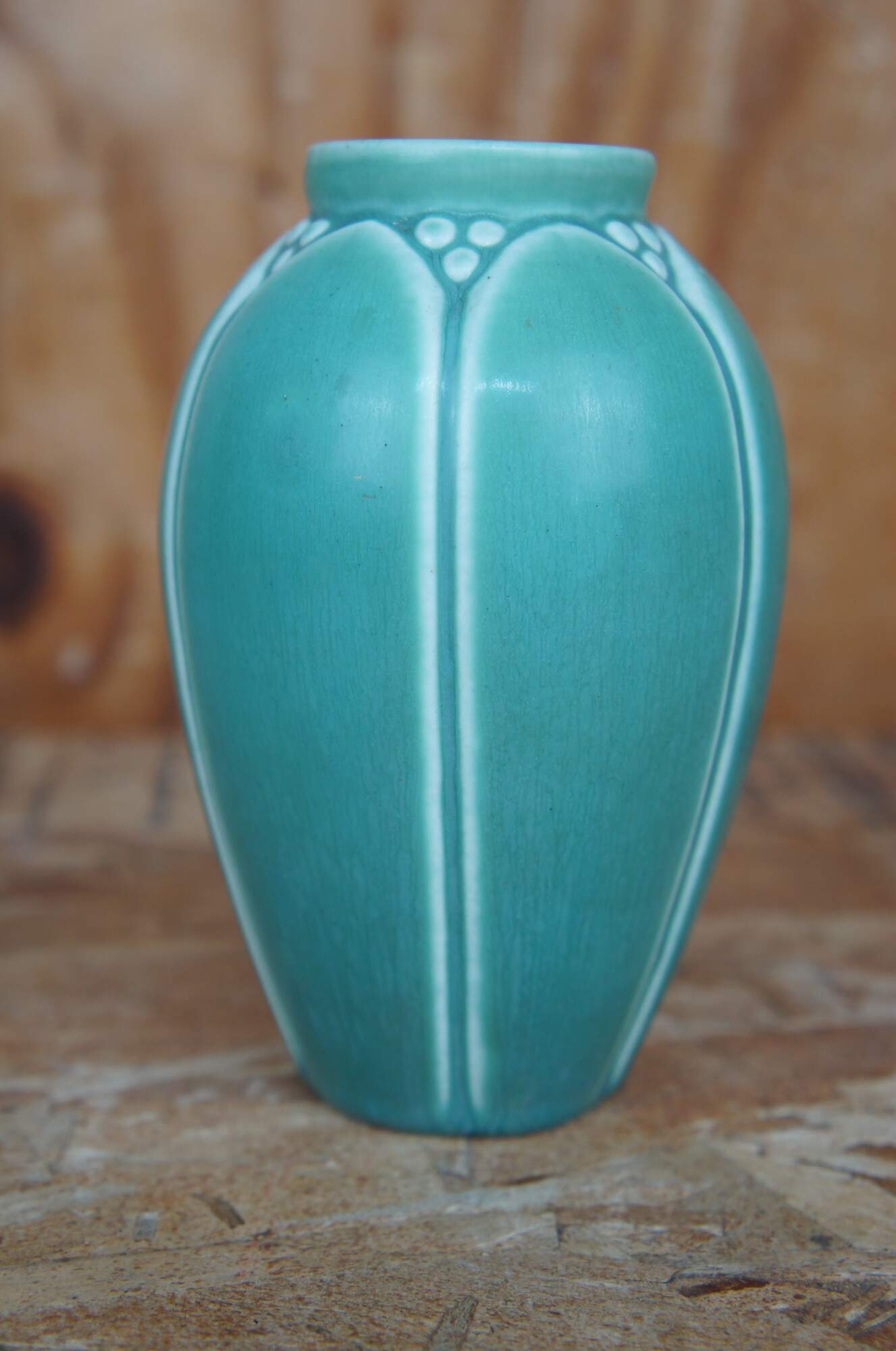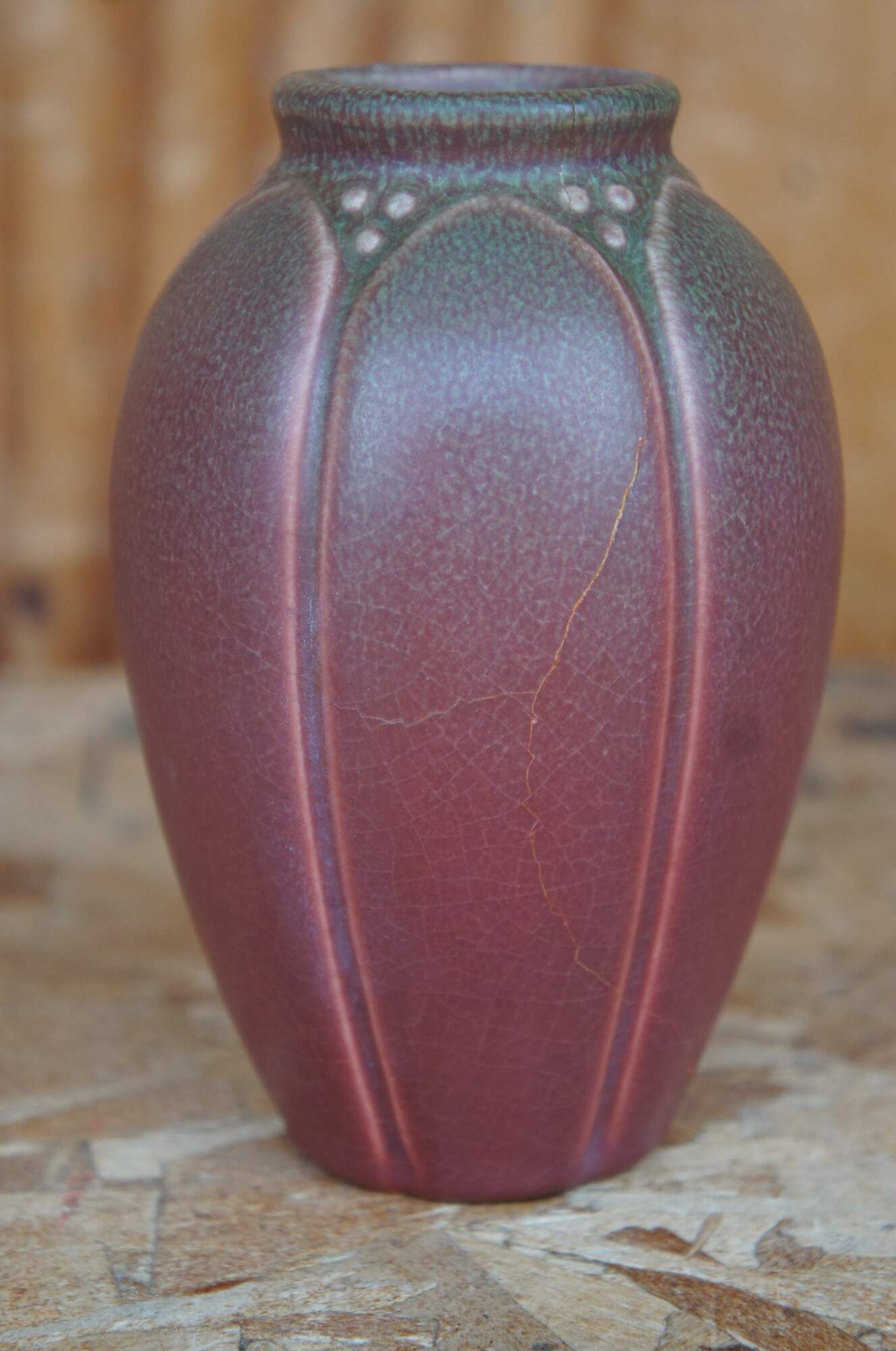 Six antique Rookwood vases in a rainbow of colors showing Victorian arts and crafts styling with matte glaze. Vases marked on base, 1917, 1921, 1923, 1928, and two marks were covered by glaze.