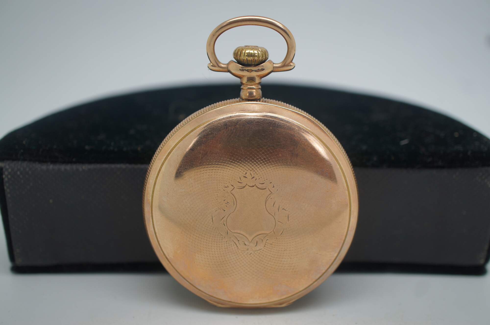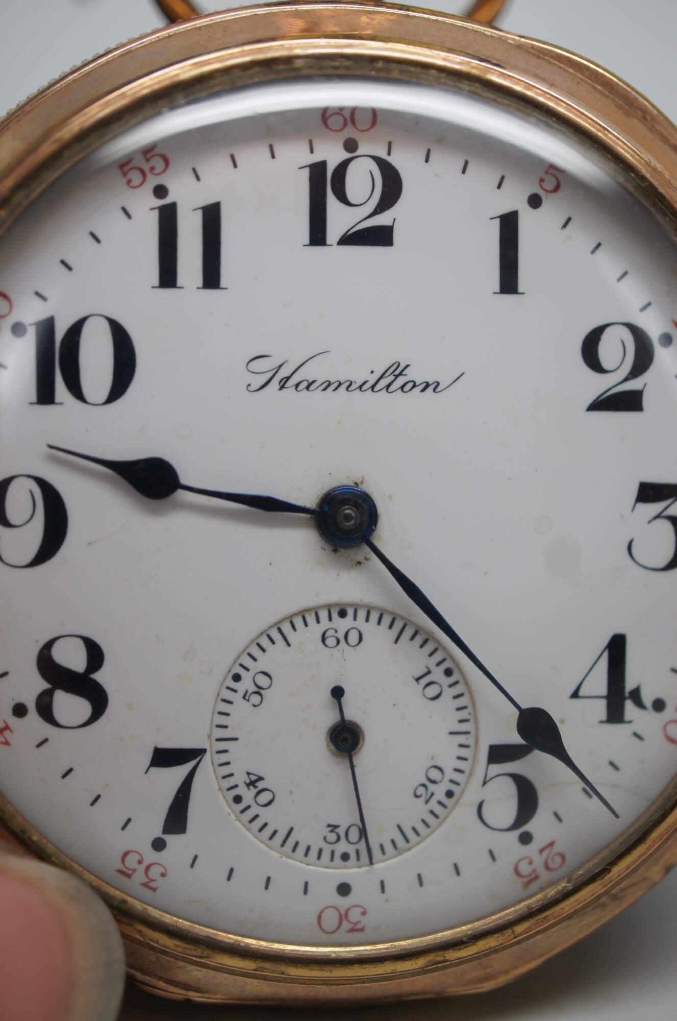 Antique 1920s mechanical pocket watch by Hamilton Watch Company of Lancaster, PA, featuring a gold case with fluted sides and a shield design on the back; Fahys case serial number 8191257, works serial number 792766, grade 972, 17 Jewels. Includes wood and plastic bell jar display case.