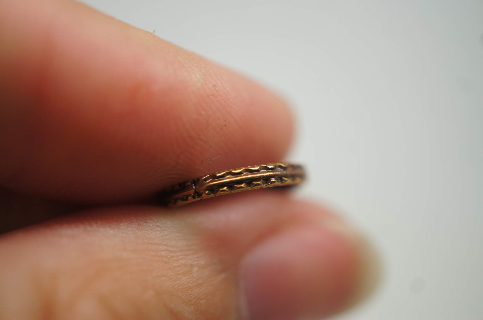 Tiny antique 14K gold baby sized ring with a sawtooth pattern divided by a ridge.