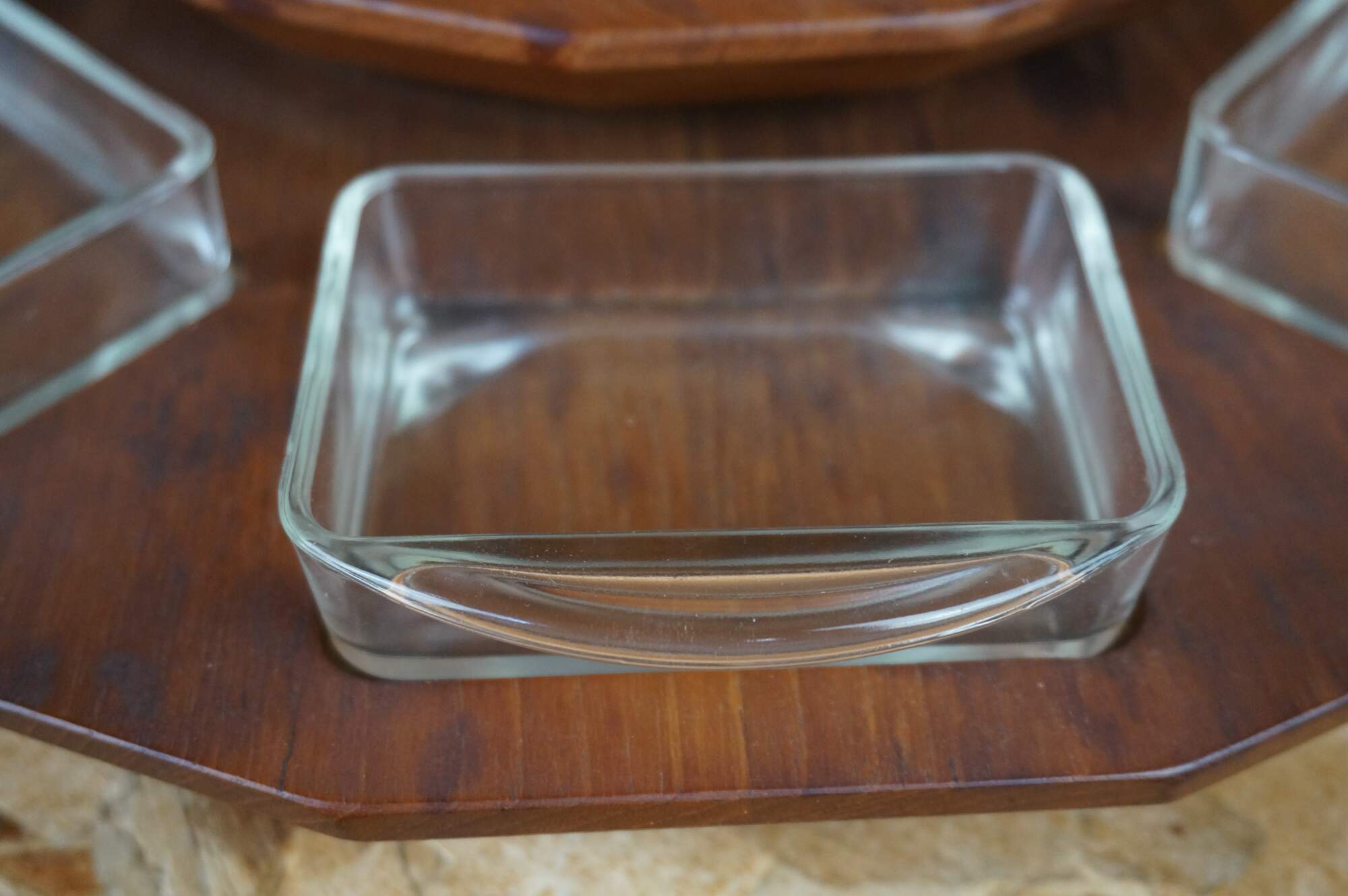 Mid century Danish Lazy Susan or fondue carosel centerpiece. Made of teak featuring round geometric form with eight glass condiment inserts and upper tier. Attributed to Digsmed circa 1960s.
