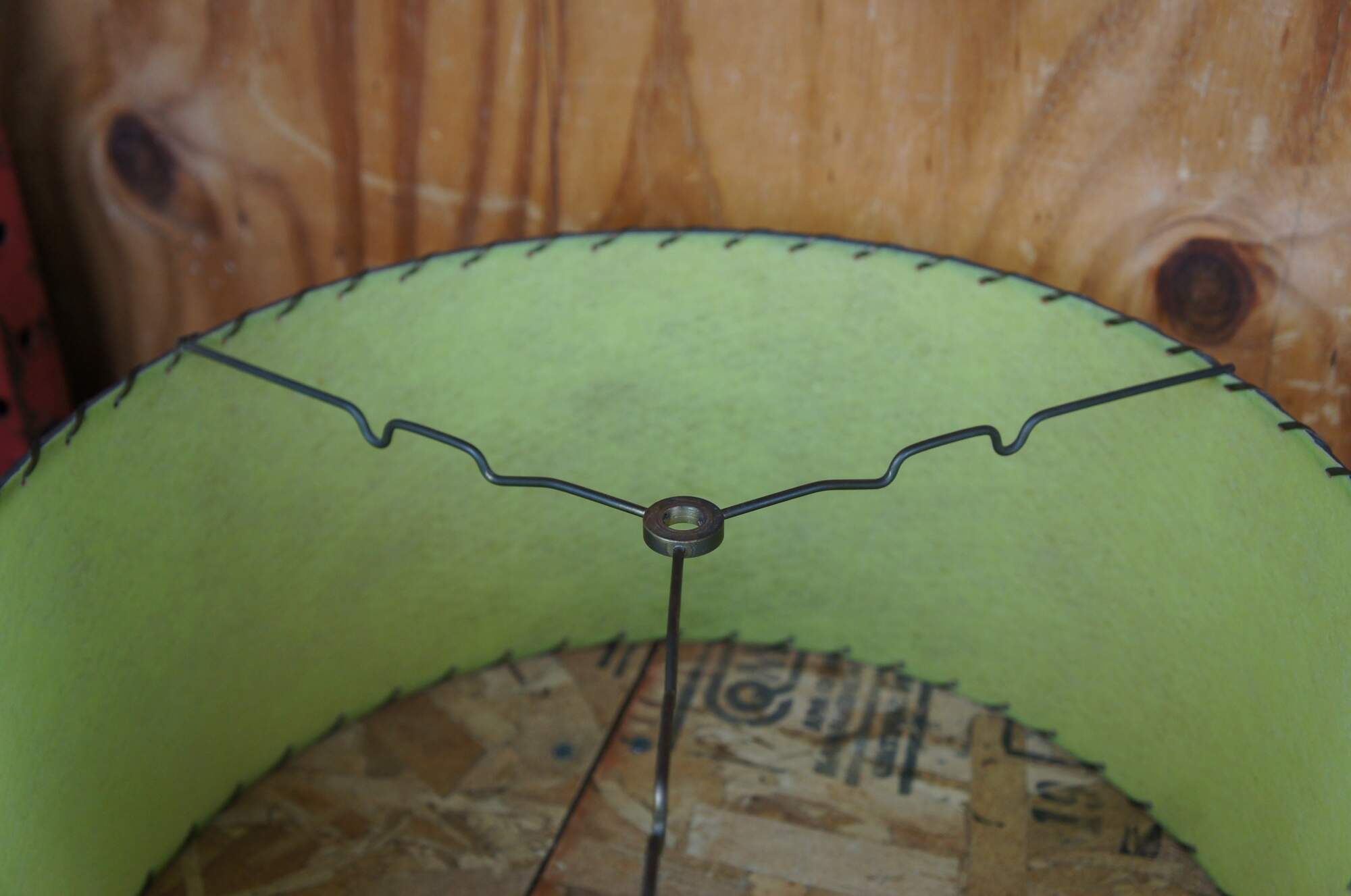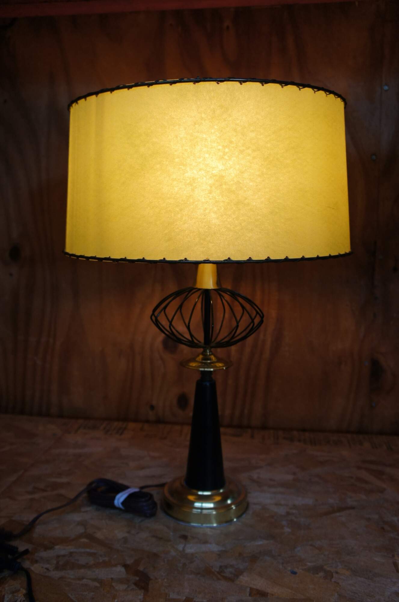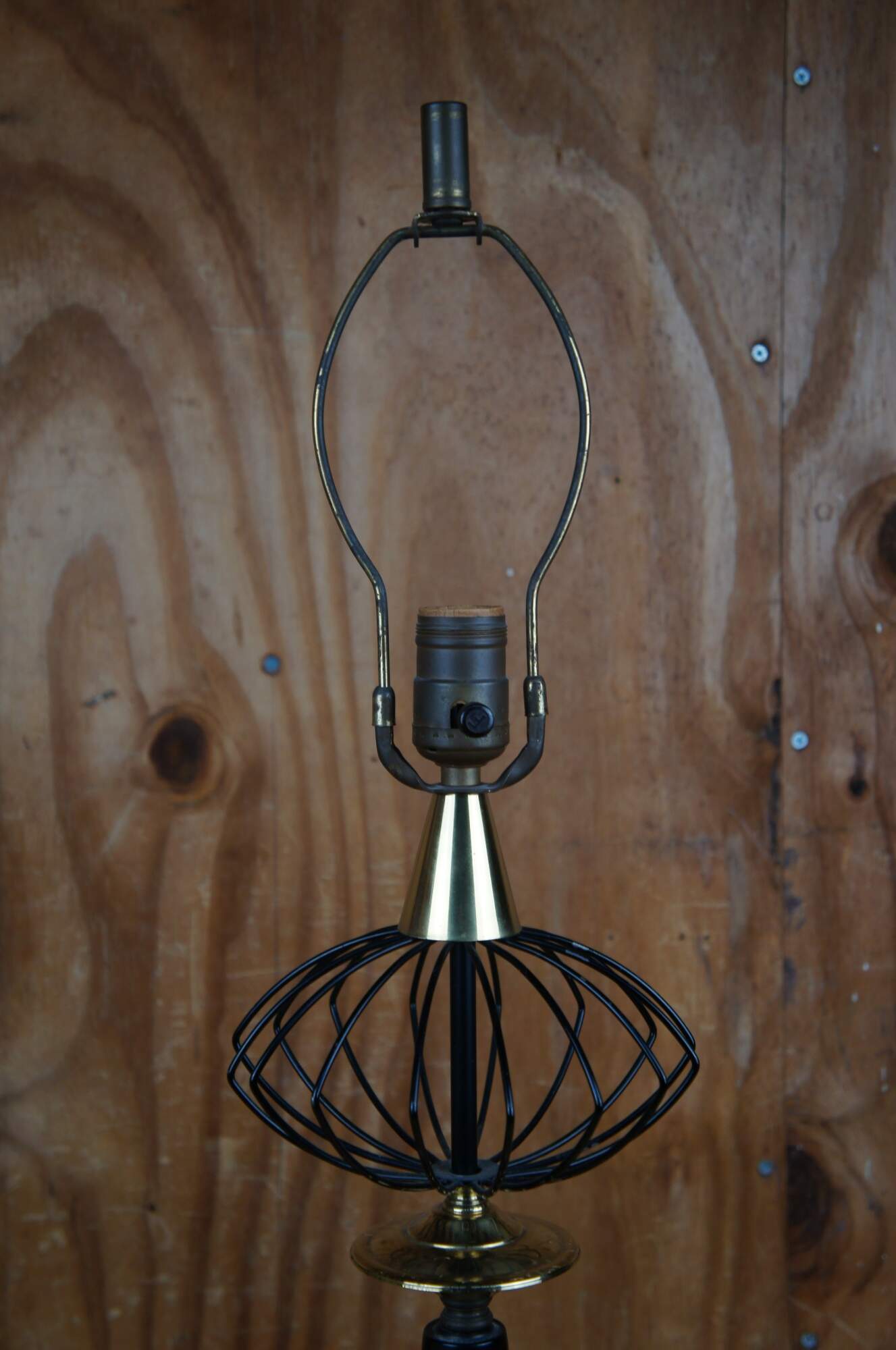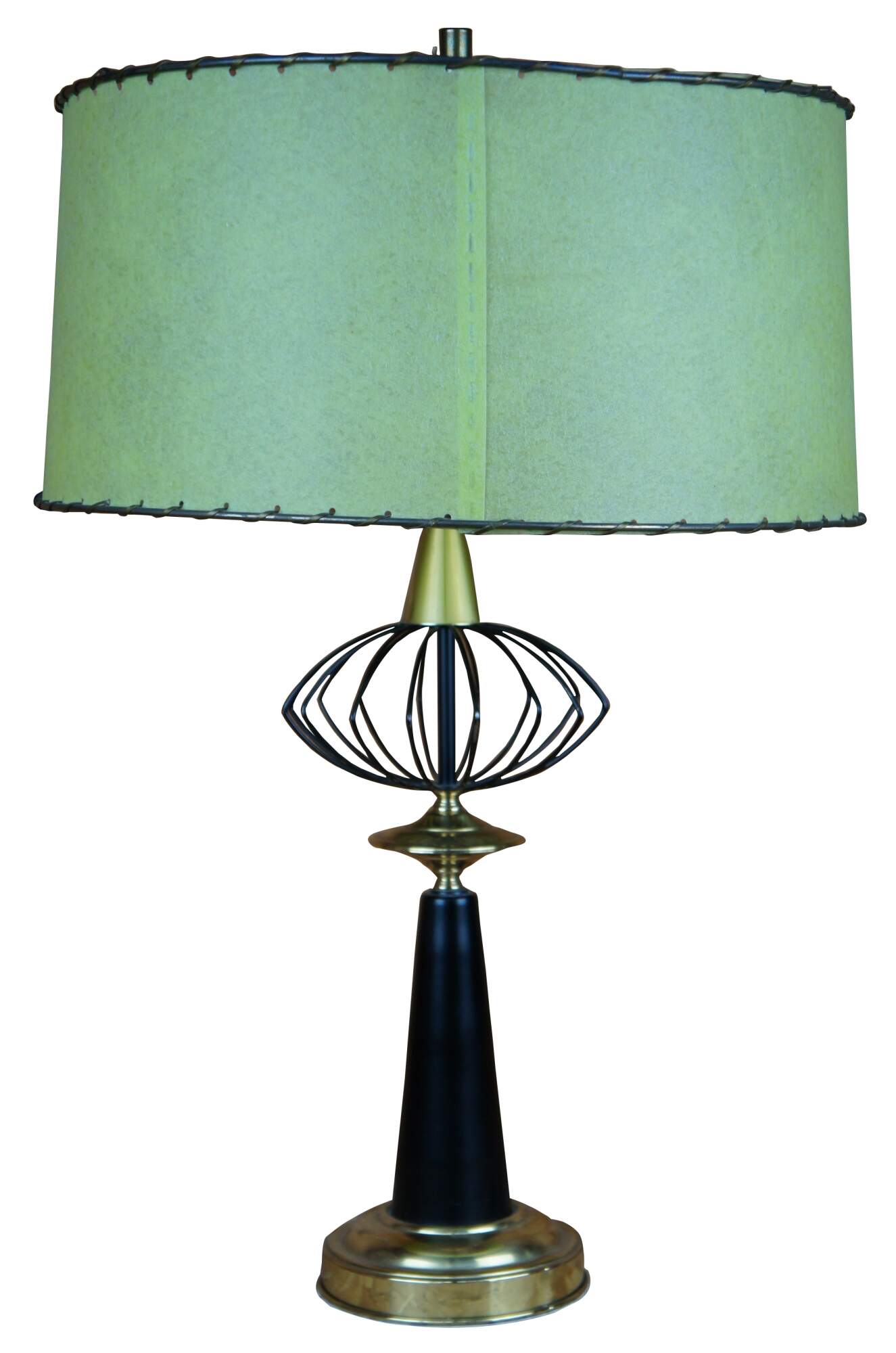 Two mid century modern atomic black wire and brass table lamps with green shades.