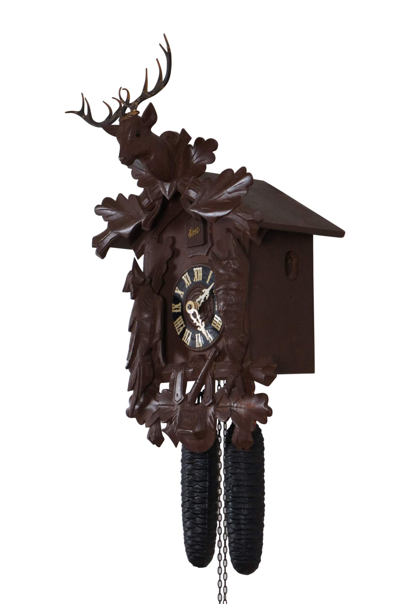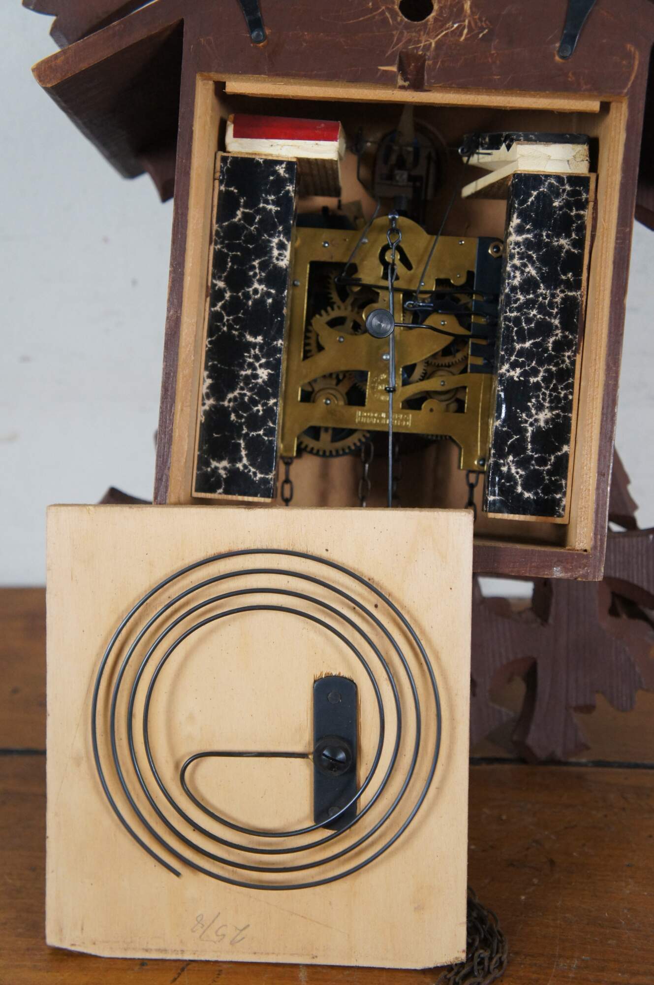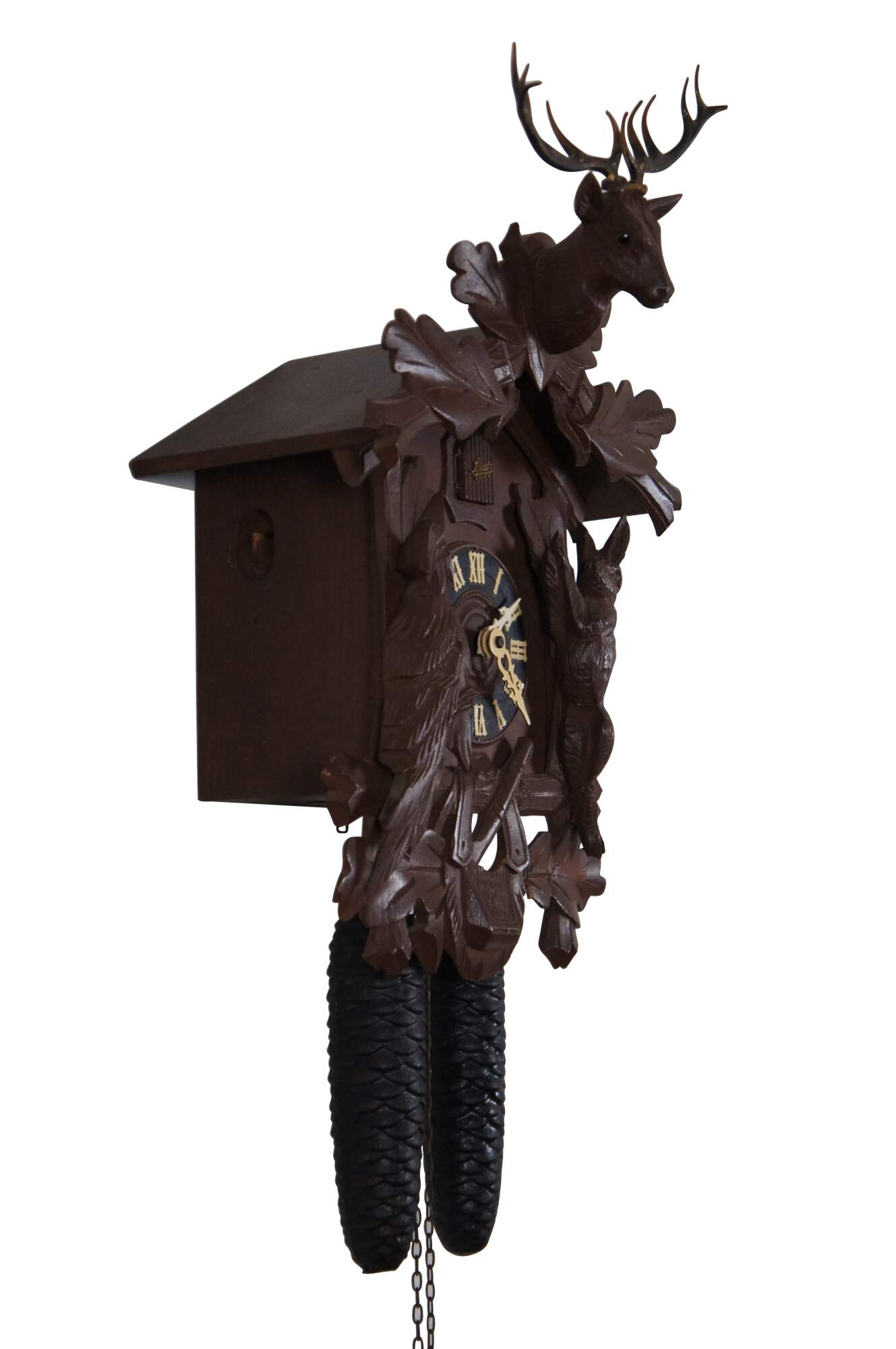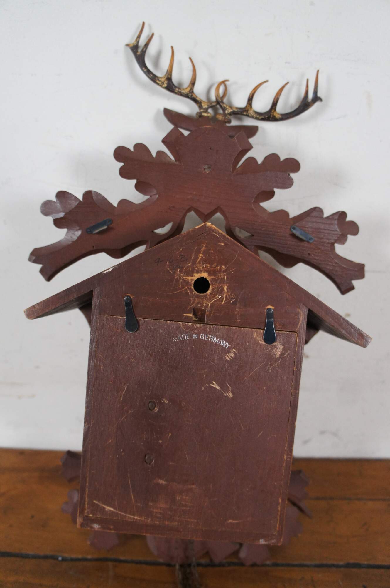 Antique German Schatz & Sohne Black Forest eight day cuckoo clock. Features hunt / game / taxidermy theme with carved deer / stag , rabbit, bird and mantel with gun and tote. Cast iron acorn weights.