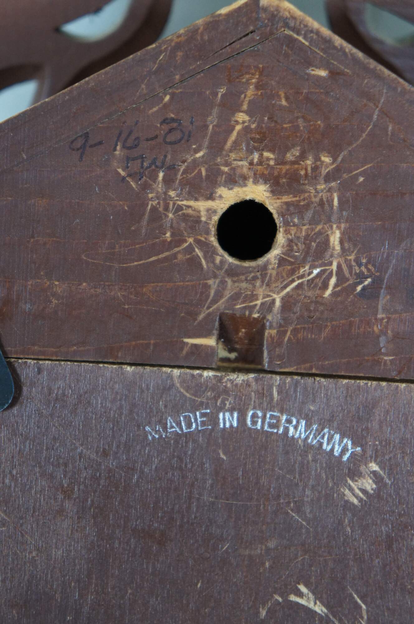 The eight-day cuckoo clocks have one of the most beautiful and clever plate designs in manufactured clocks. Both the front and back plates are cut out to reveal a bird with the eye at the third-wheel pivot-hole position. The rest of the plate resembles a tree with branches. In addition, the center arbor goes through the front plate where the bird’s wings would be. The strike-lifting cams provide the representation of bird wings.