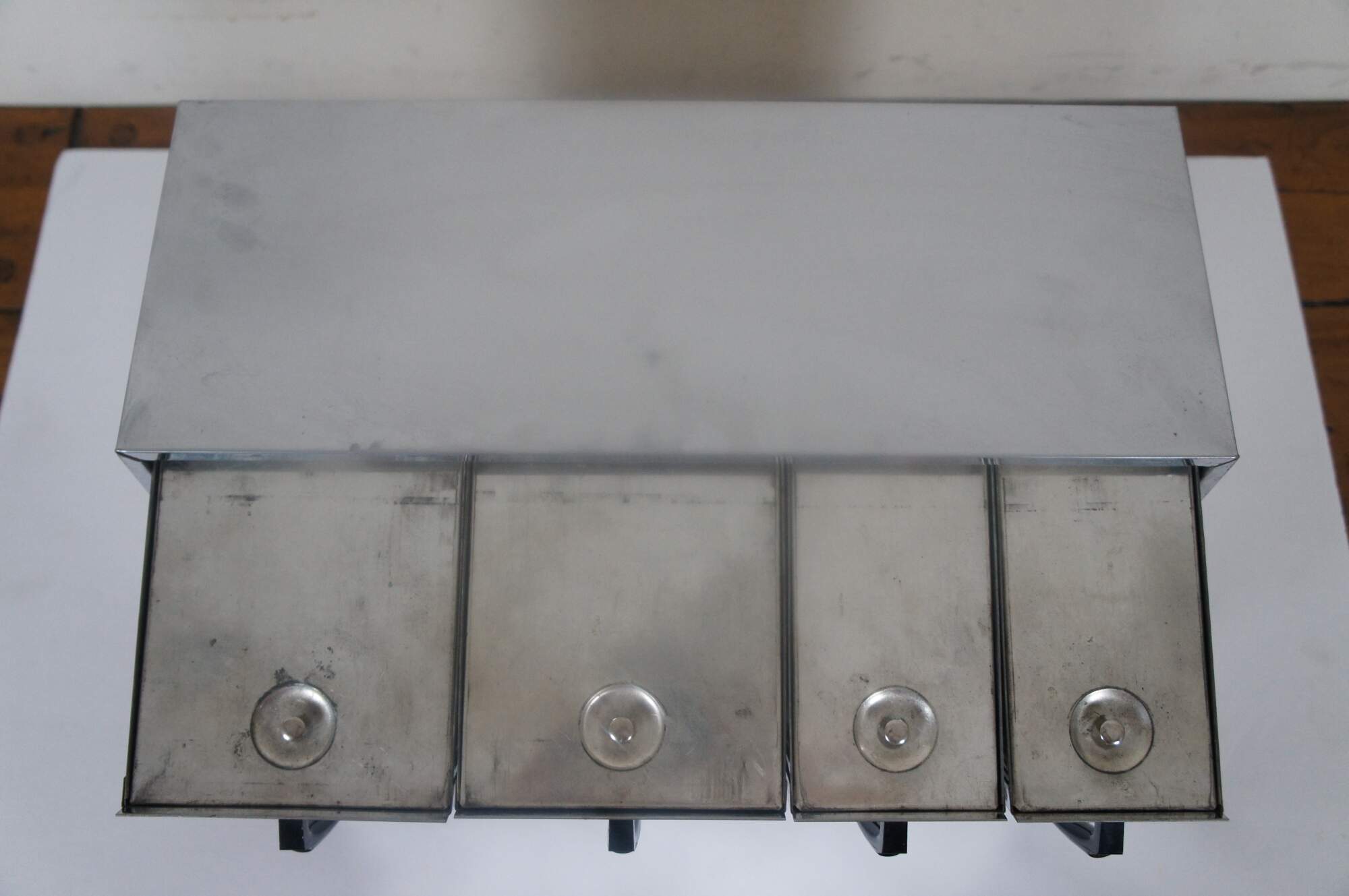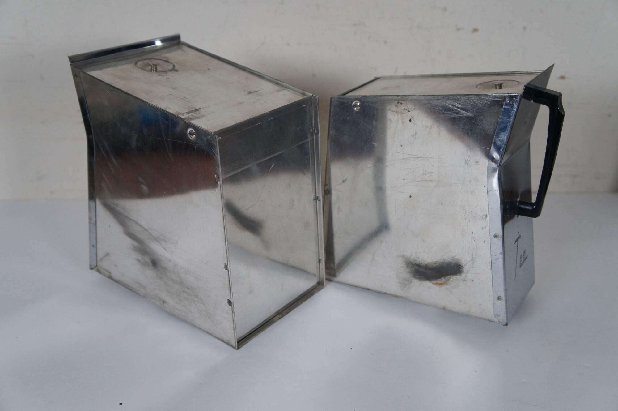 Mid century modern Lincoln Beautyware kitchen countertop canister bins. Made of chrome featuring flour, coffee, sugar and tea compartments.