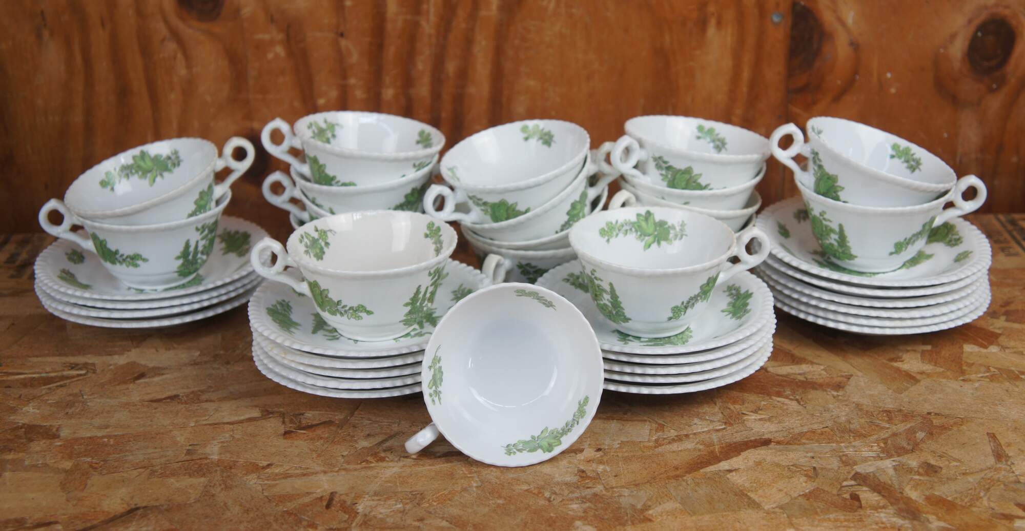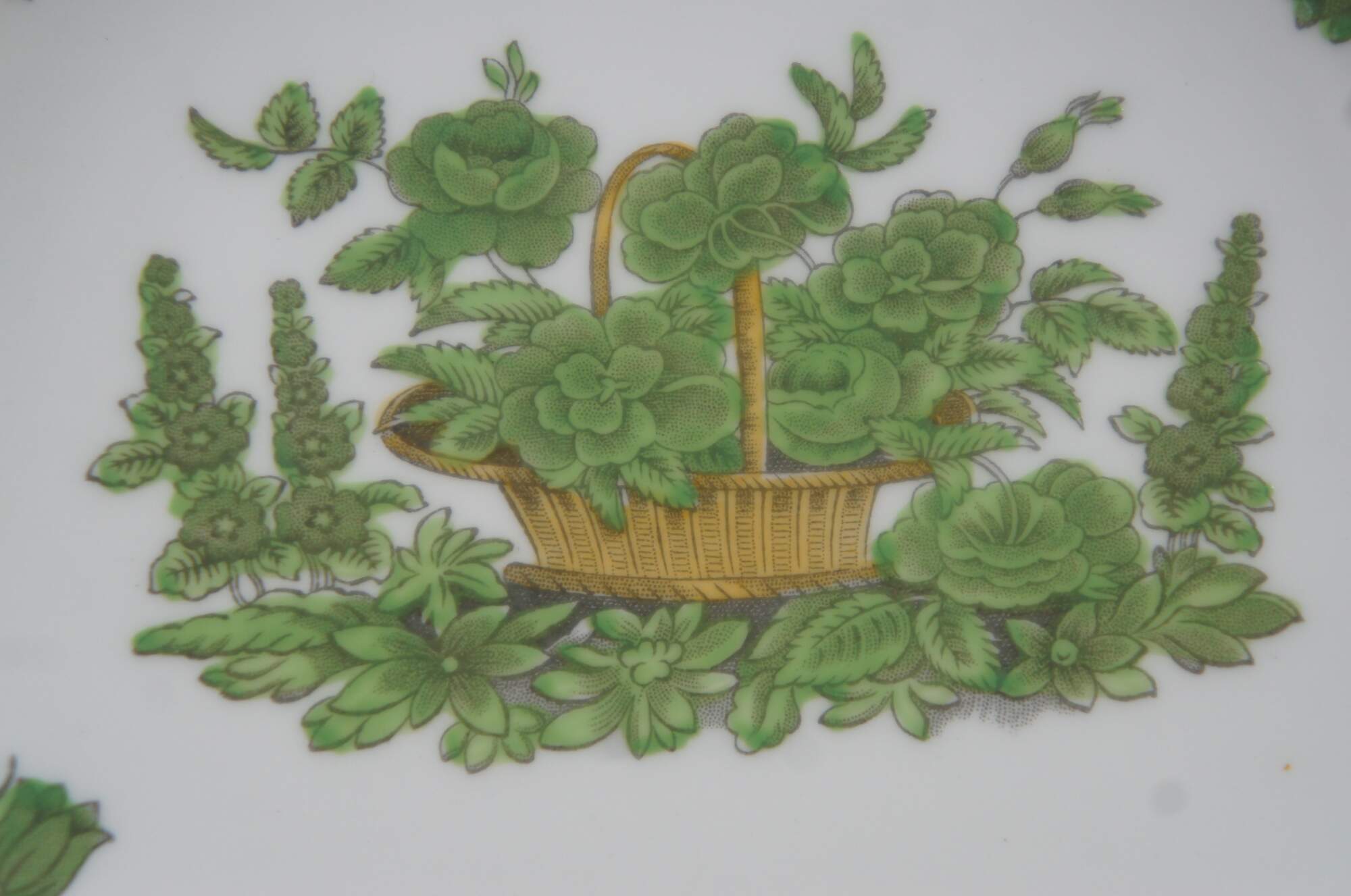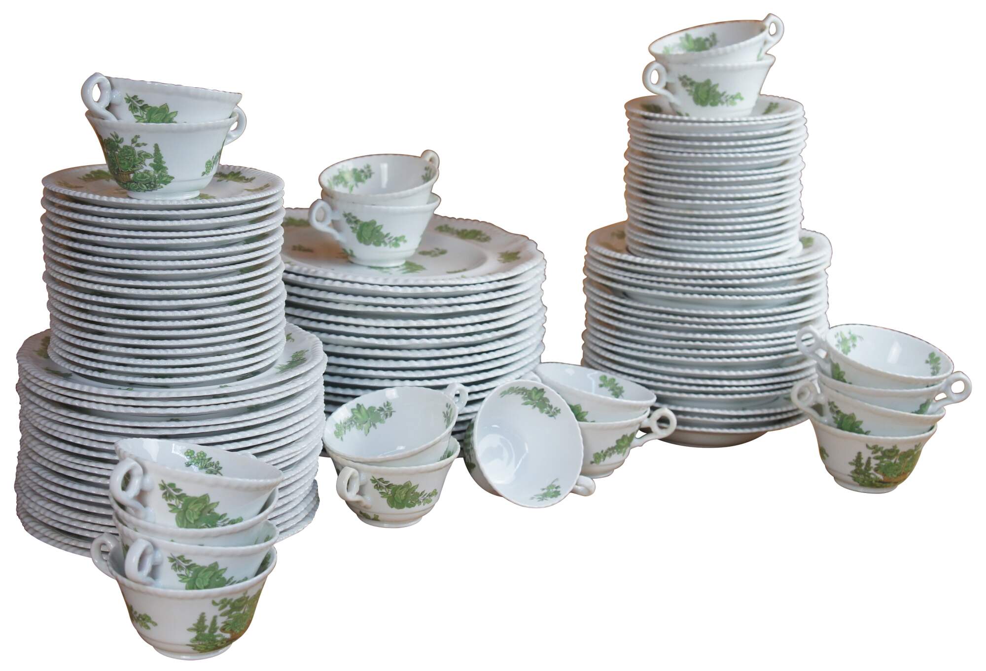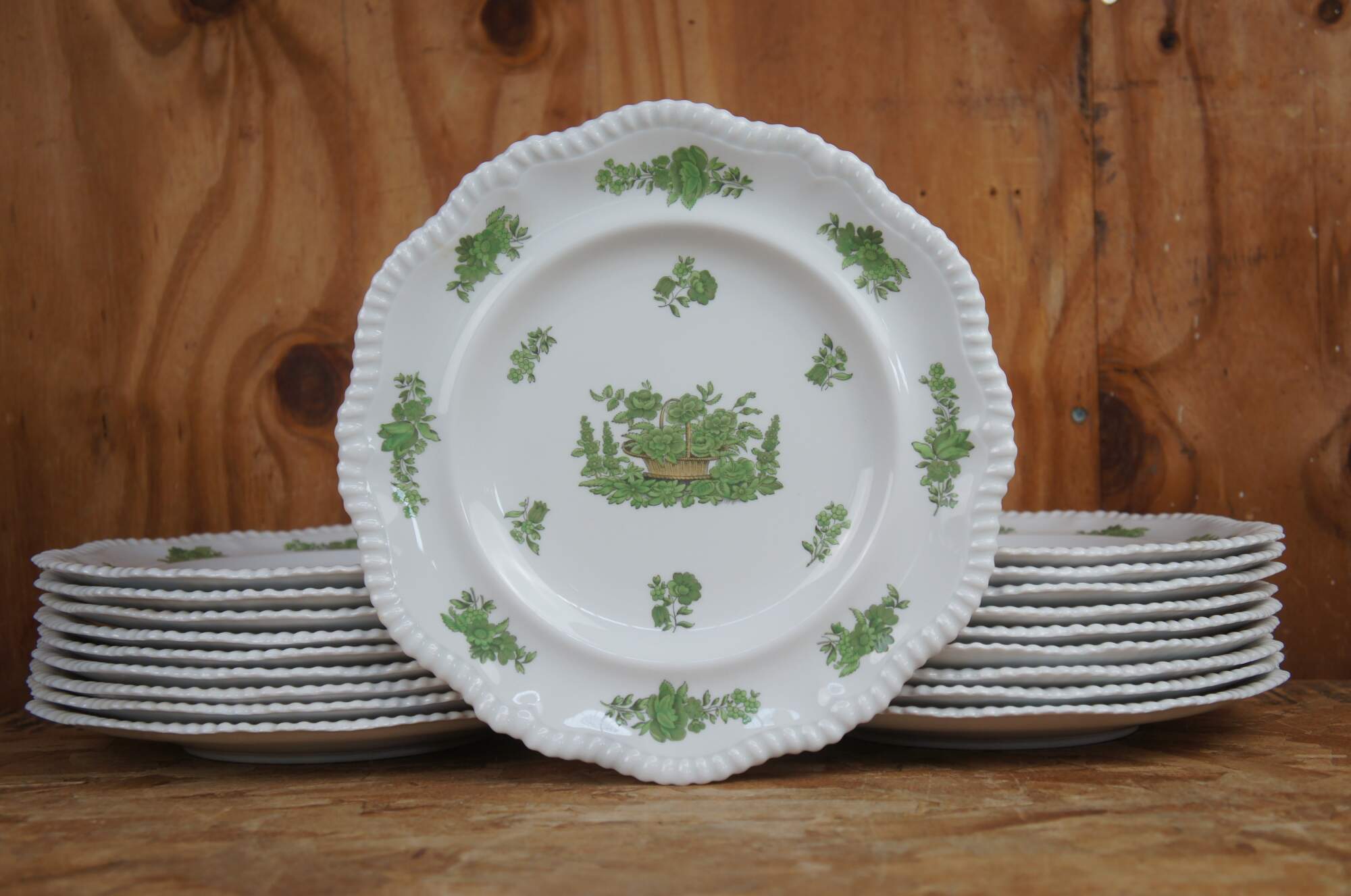 115 piece Antique England Spode Green Basket pattern Bone China dinnerware set featuring a green floral bouquet of flowers with a scalloped / gadrooned edge. Includes dinner plates, salad plates, bread plates, bowls, tea / coffee cups and saucers.