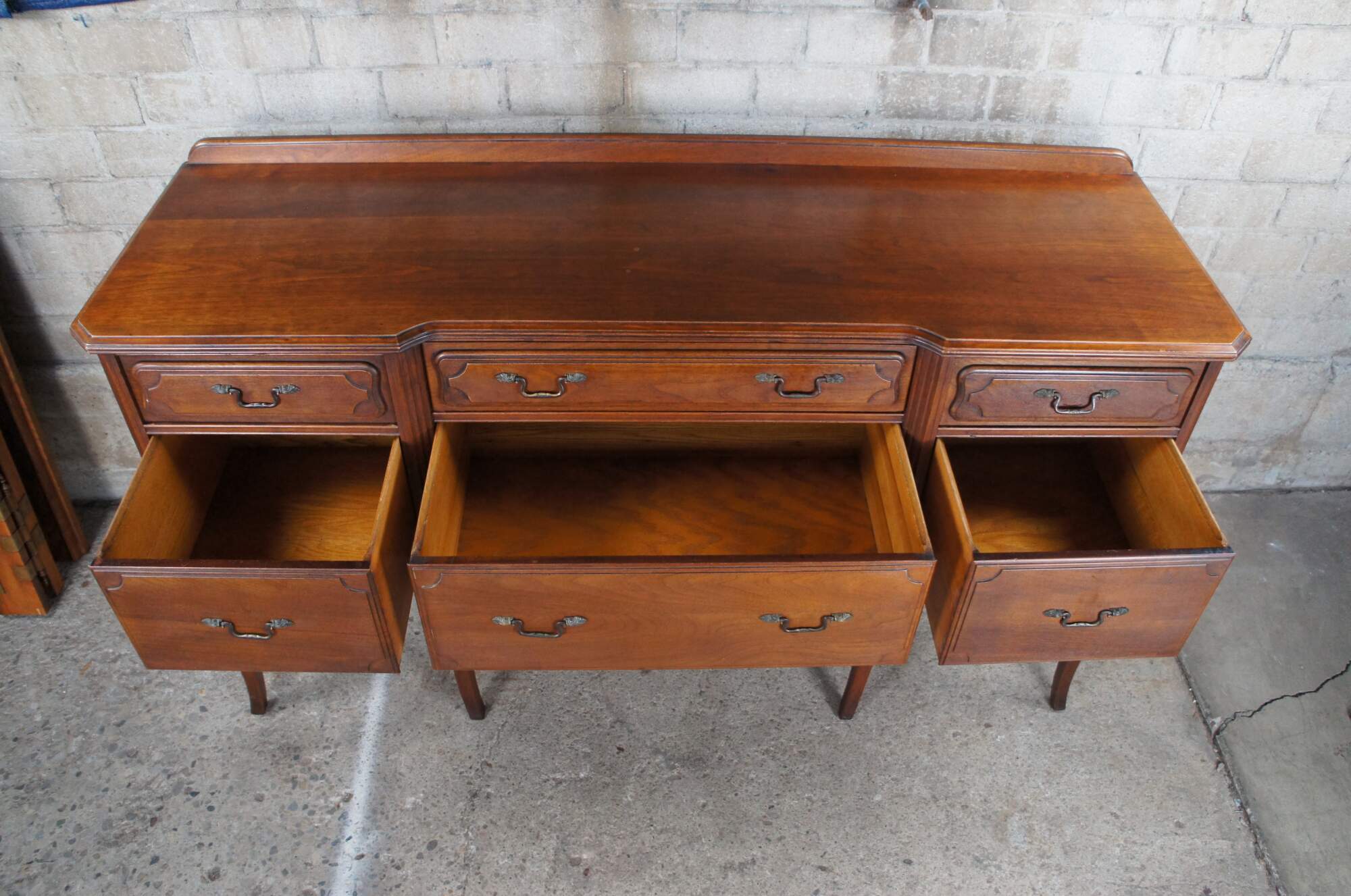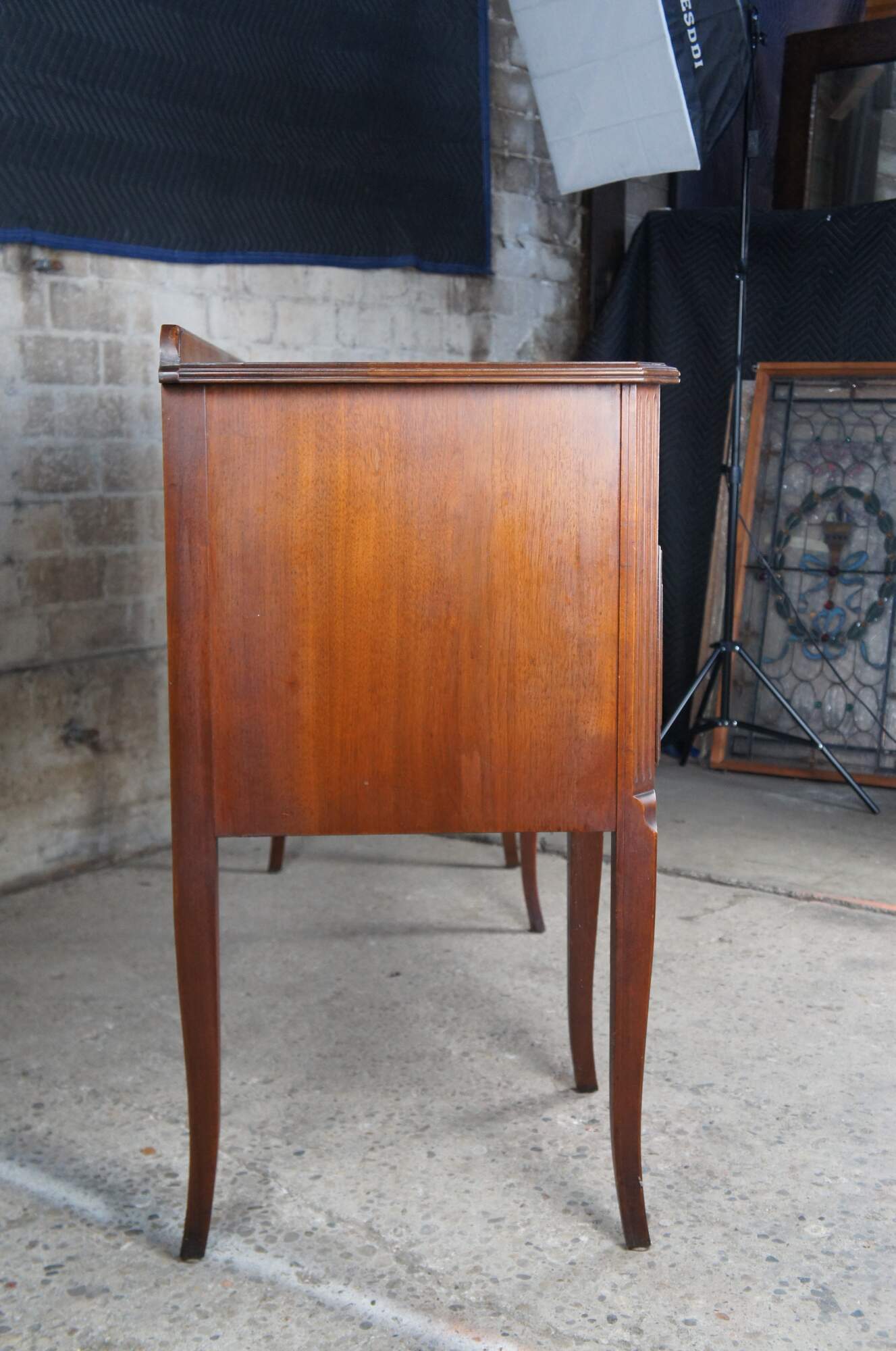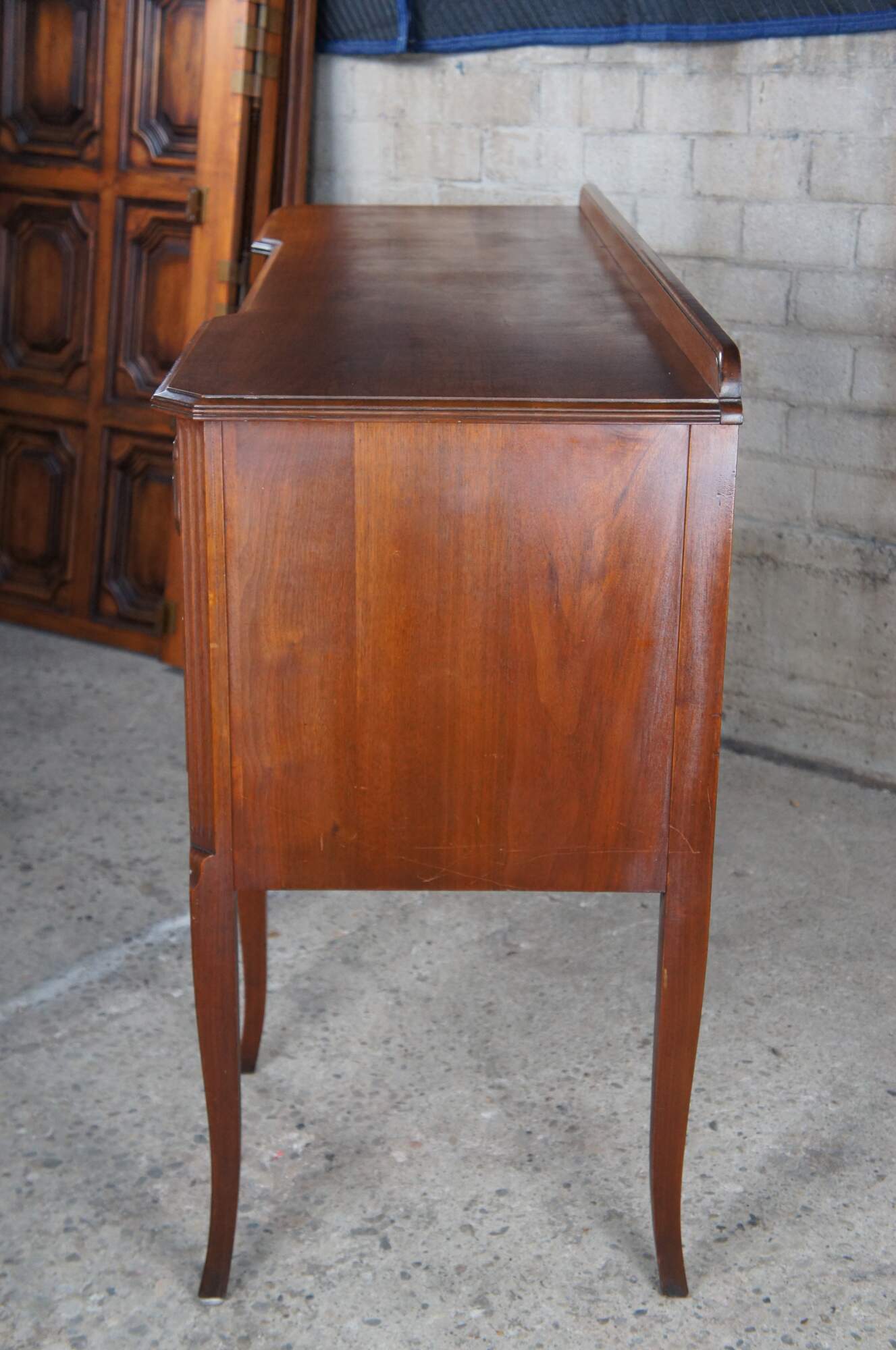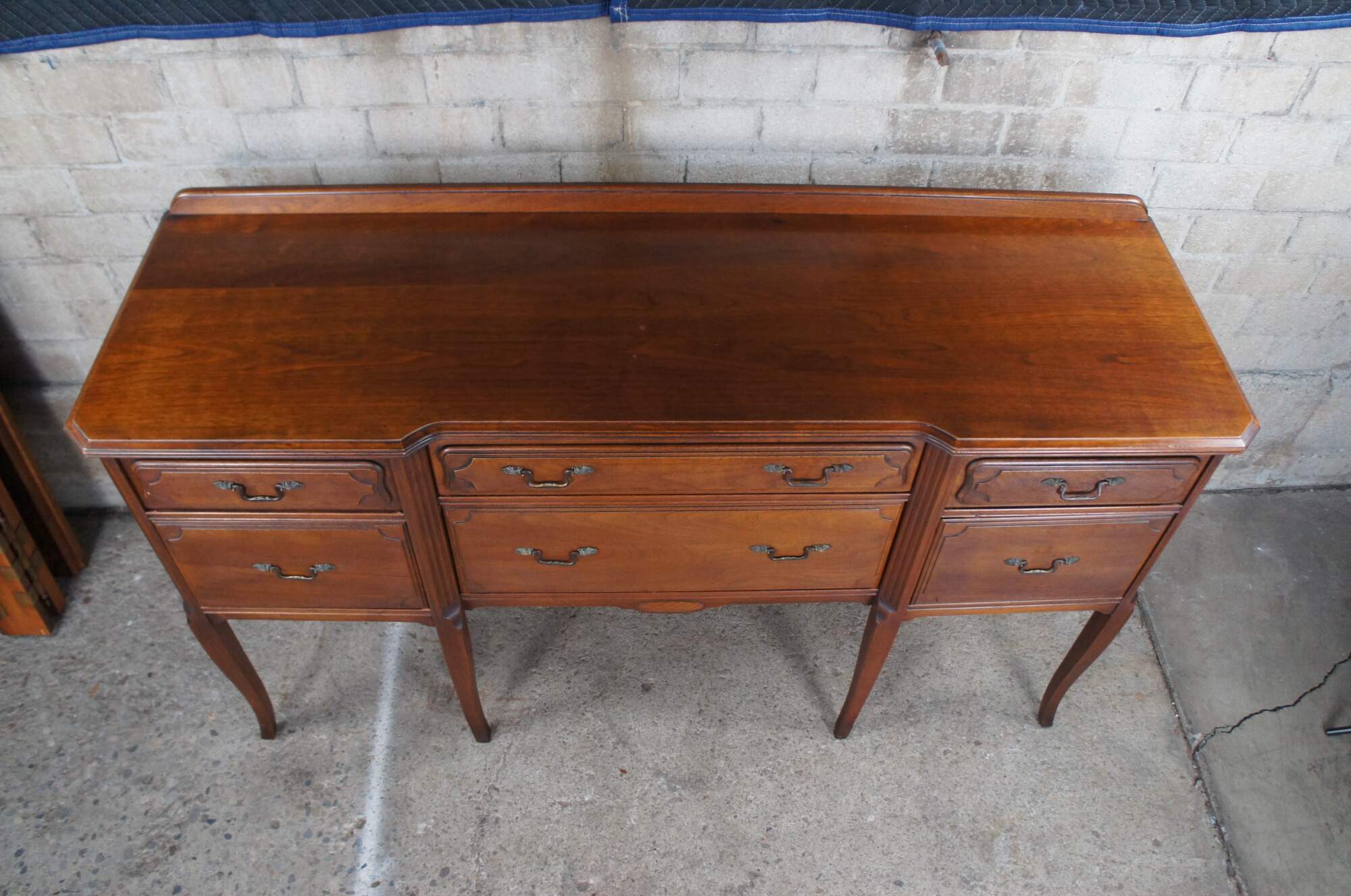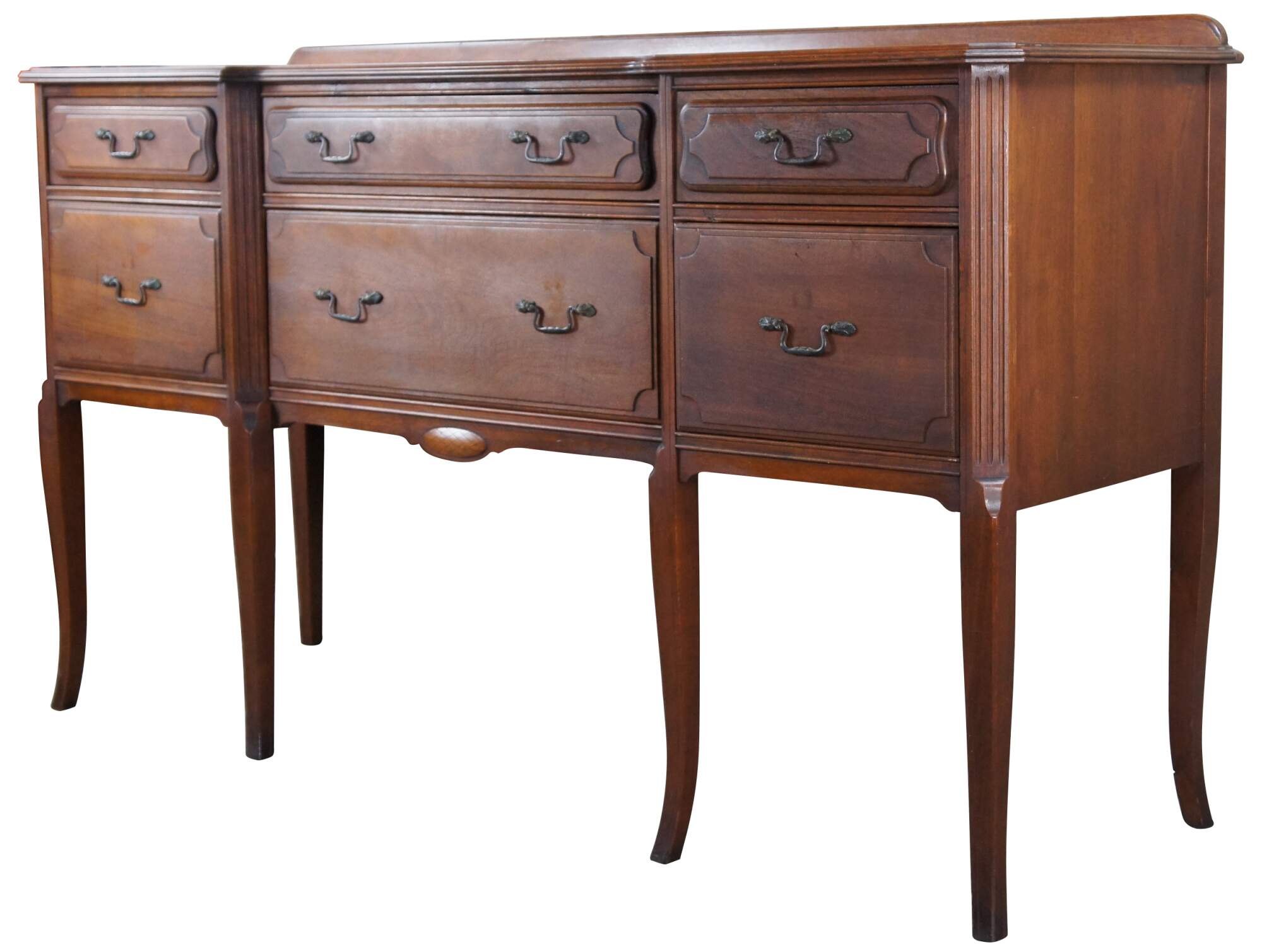 An early 20th Century American Sideboard. Made of walnut with rectangular form that features a narrow backsplash and 6 dovetailed drawers of oak construction. . Includes Chamfered fluted stiles terminating into rams tongues and tapered flared legs. A french inspired piece with brass hardware.