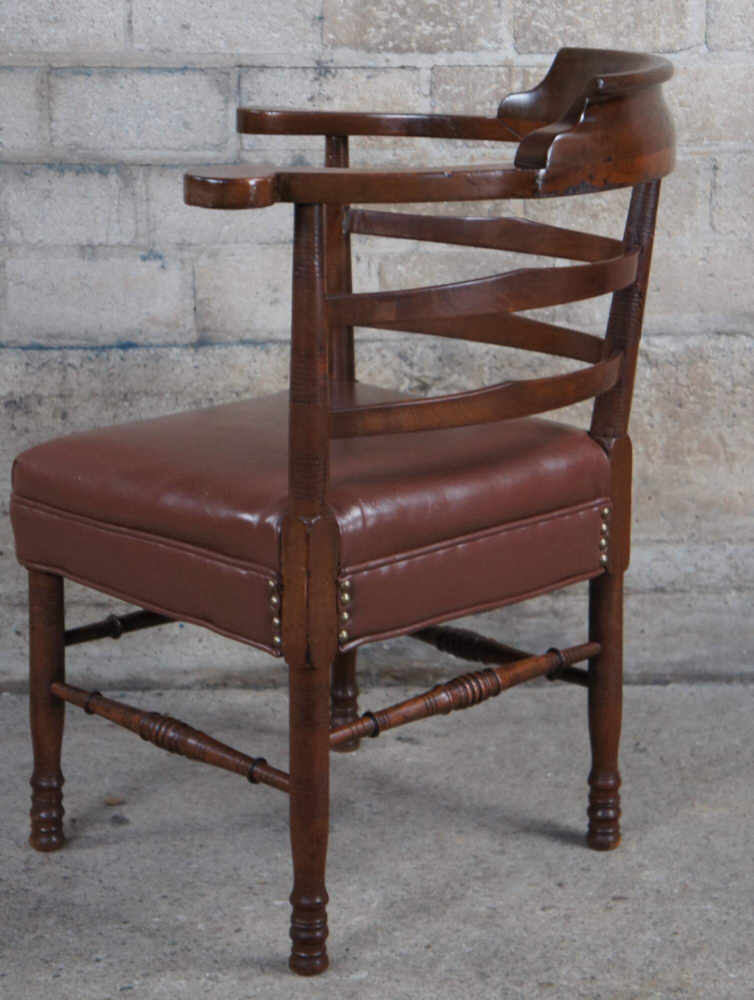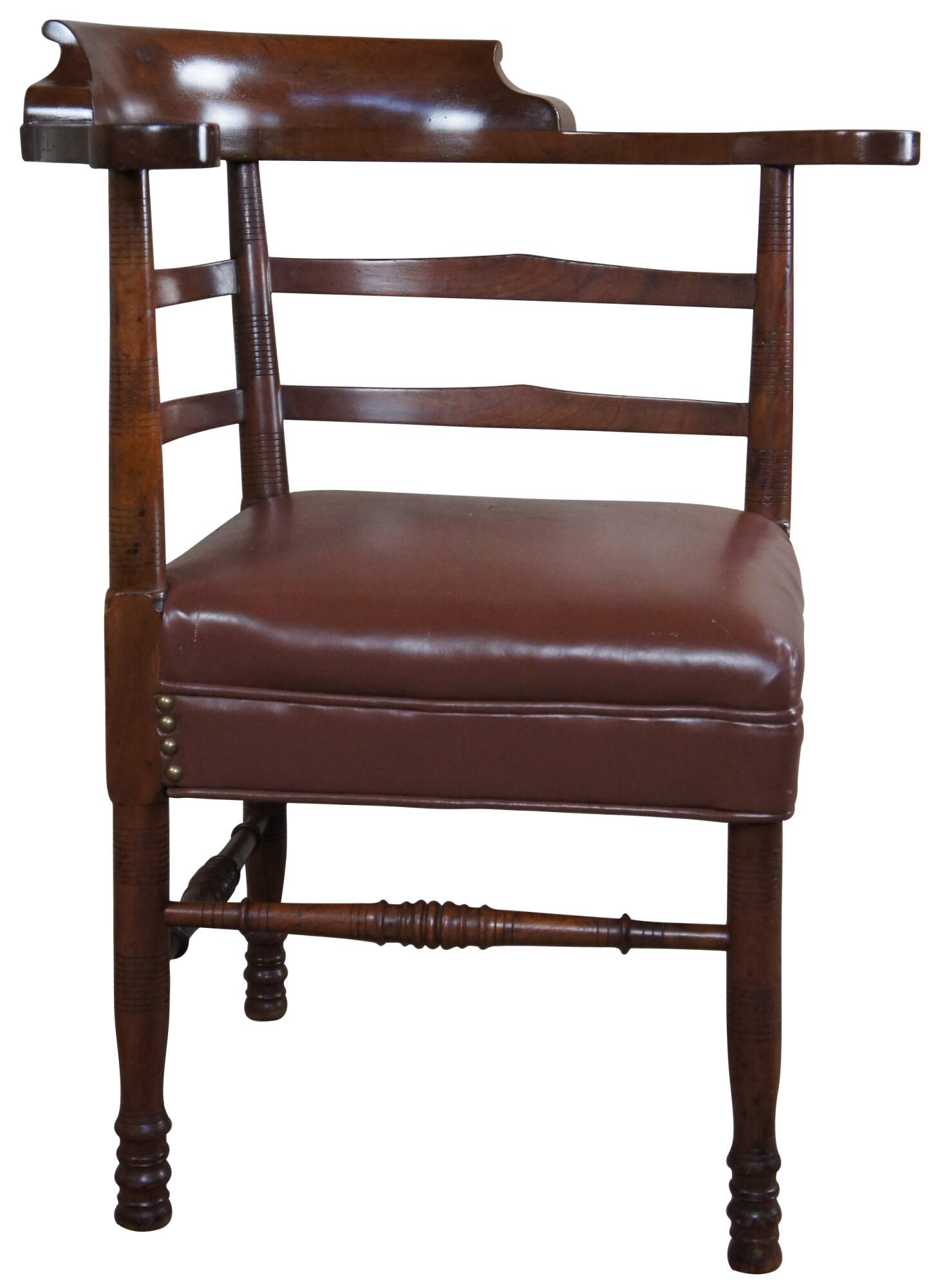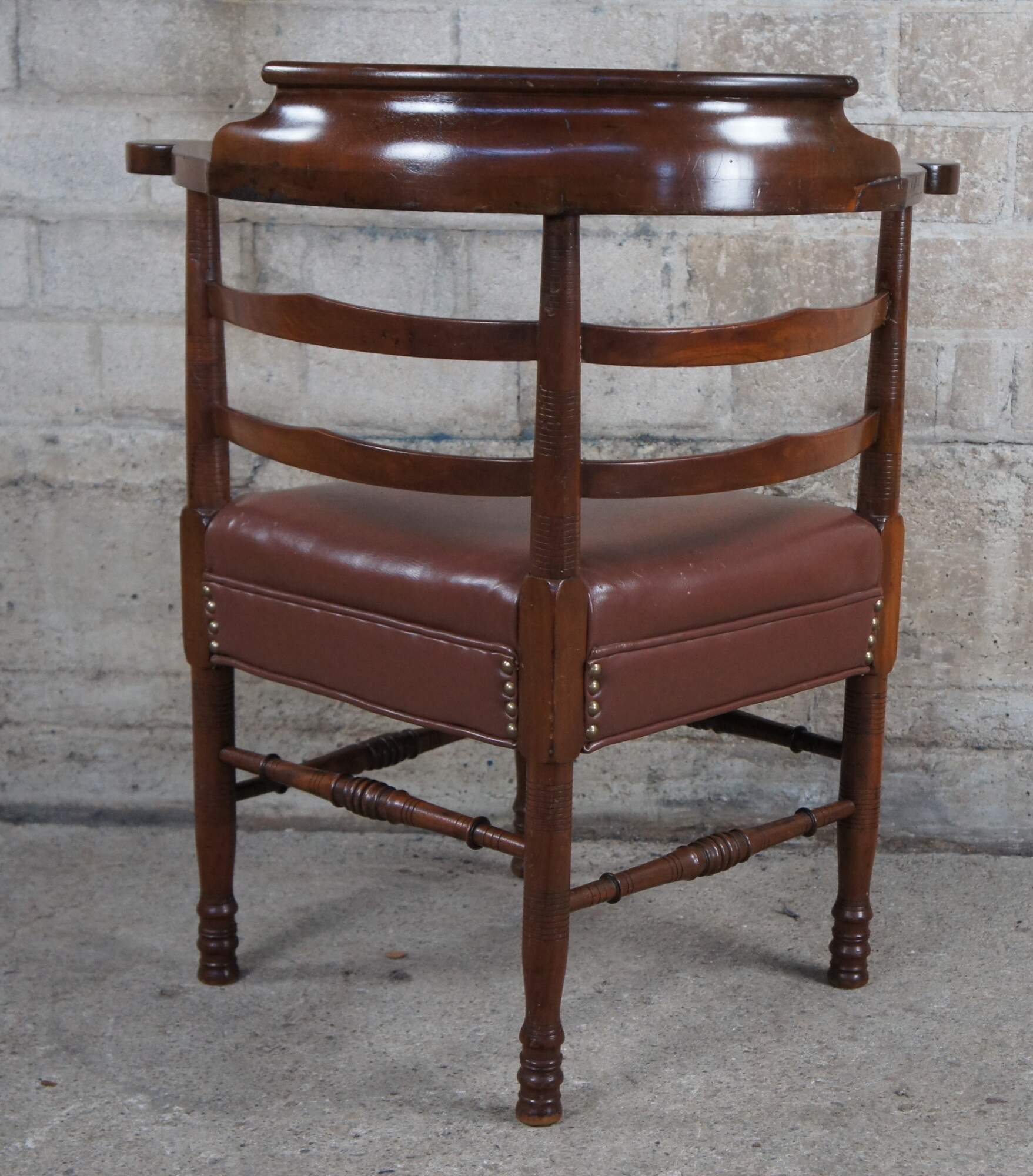 Antique English Country roundabout corner armchair. Made of mahogany featuring rounded form with ladderback supports over turned posts and supports, vinyl seat and nailhead accents,