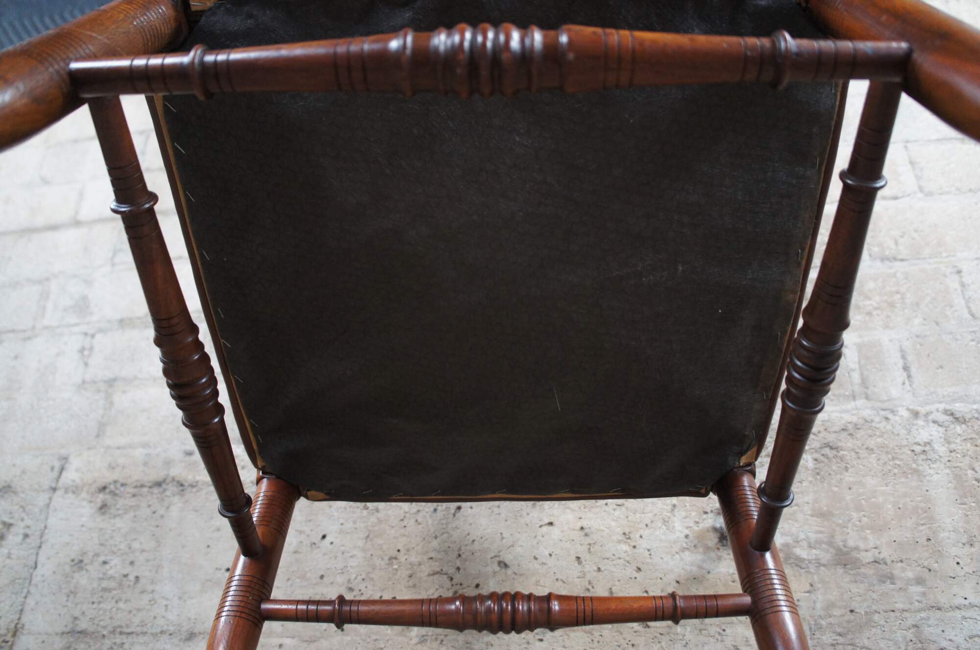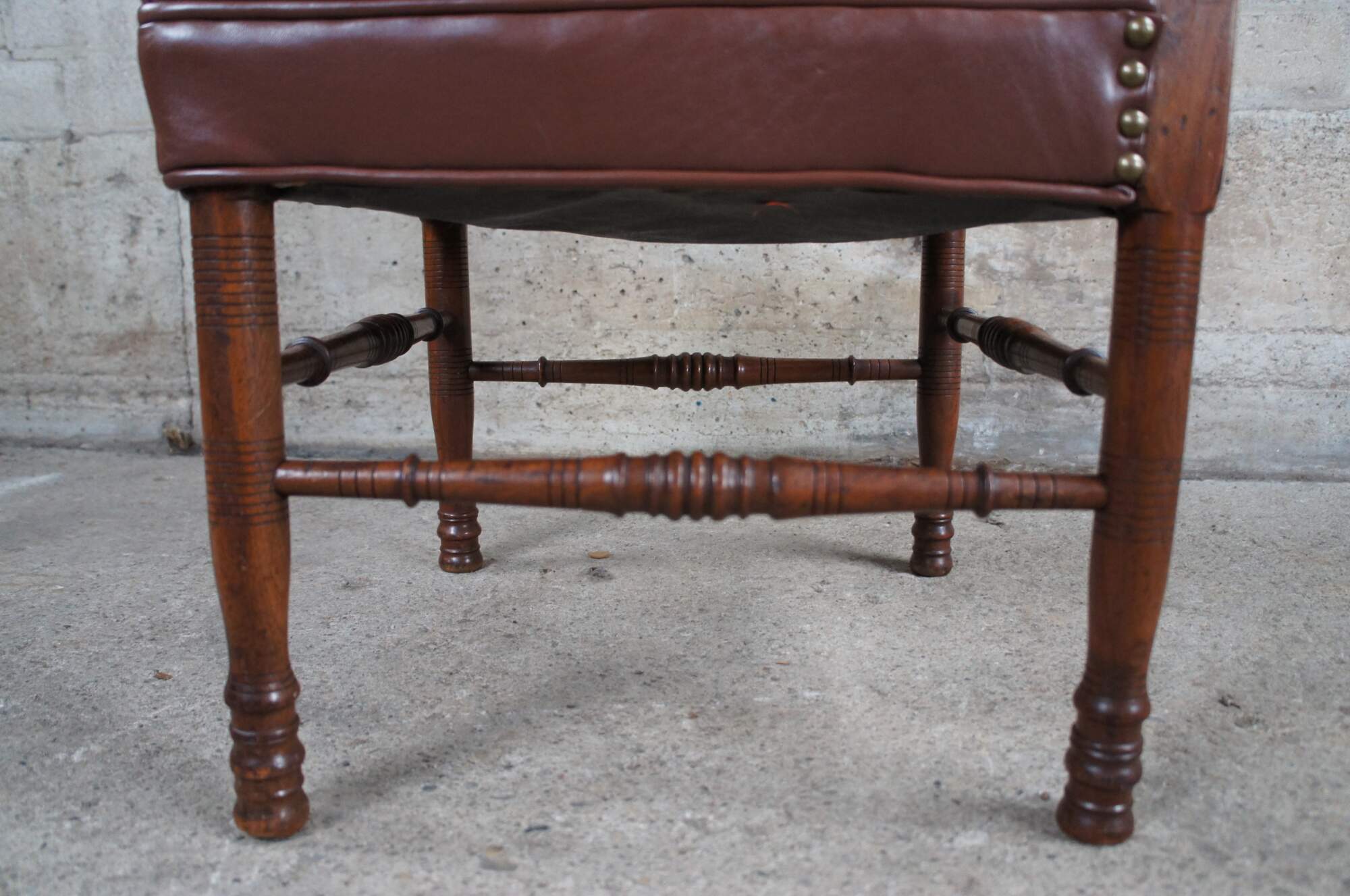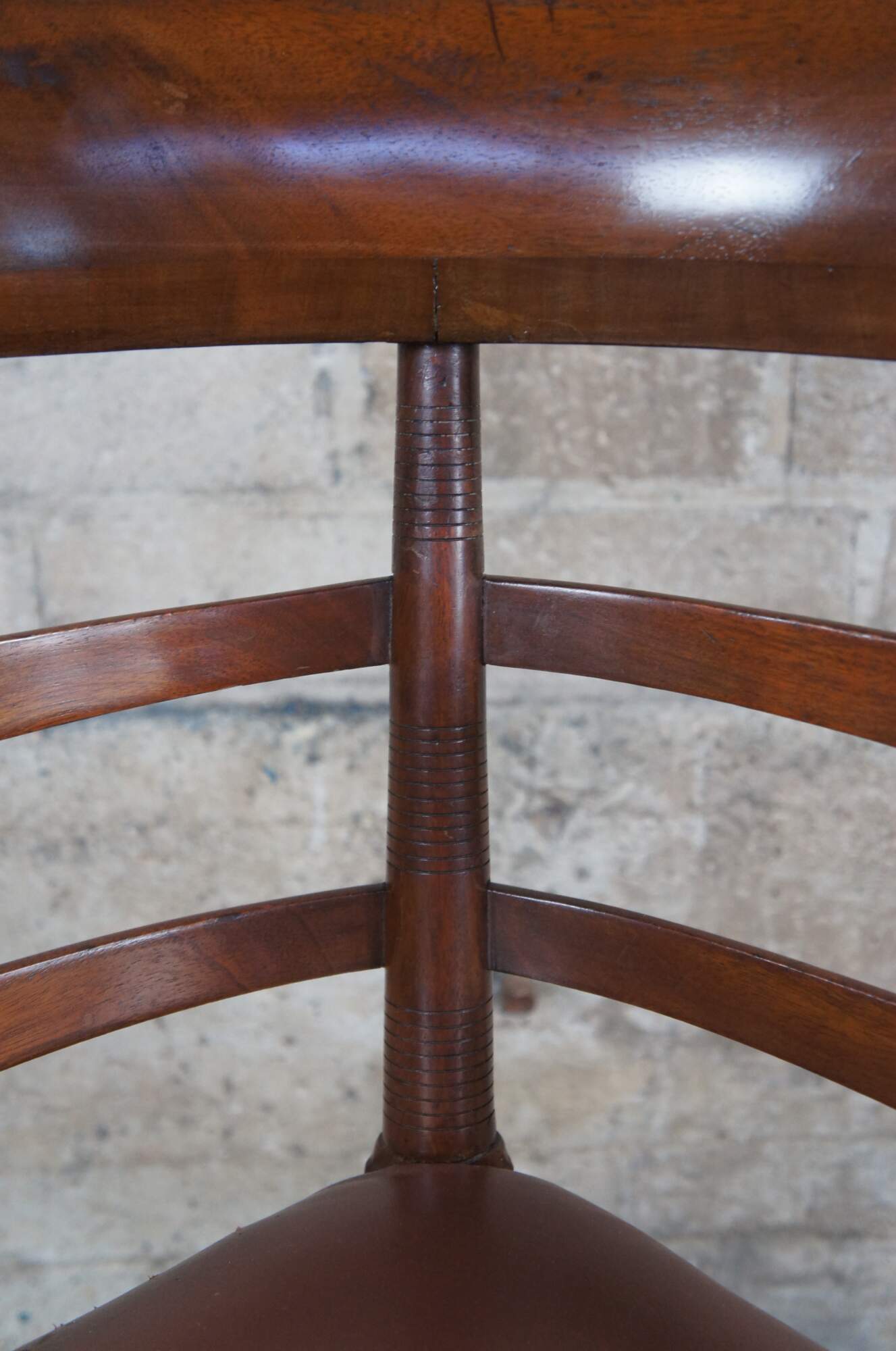 Antique English Country roundabout corner armchair. Made of mahogany featuring rounded form with ladderback supports over turned posts and supports, vinyl seat and nailhead accents,