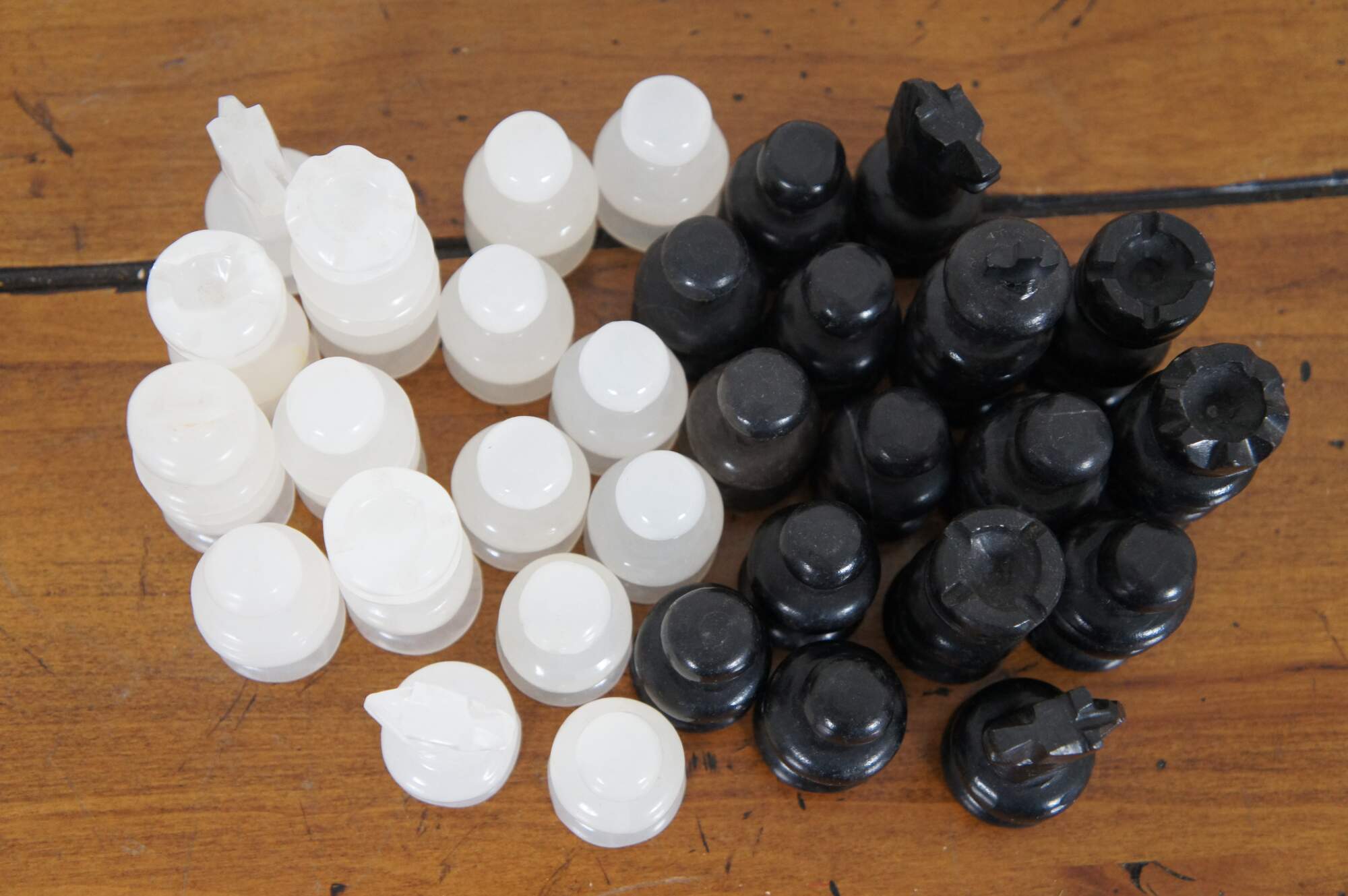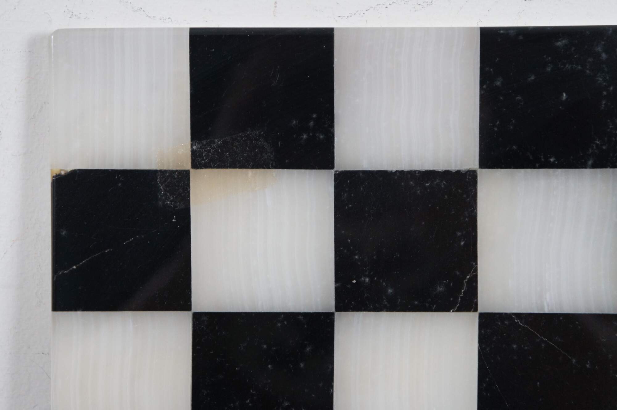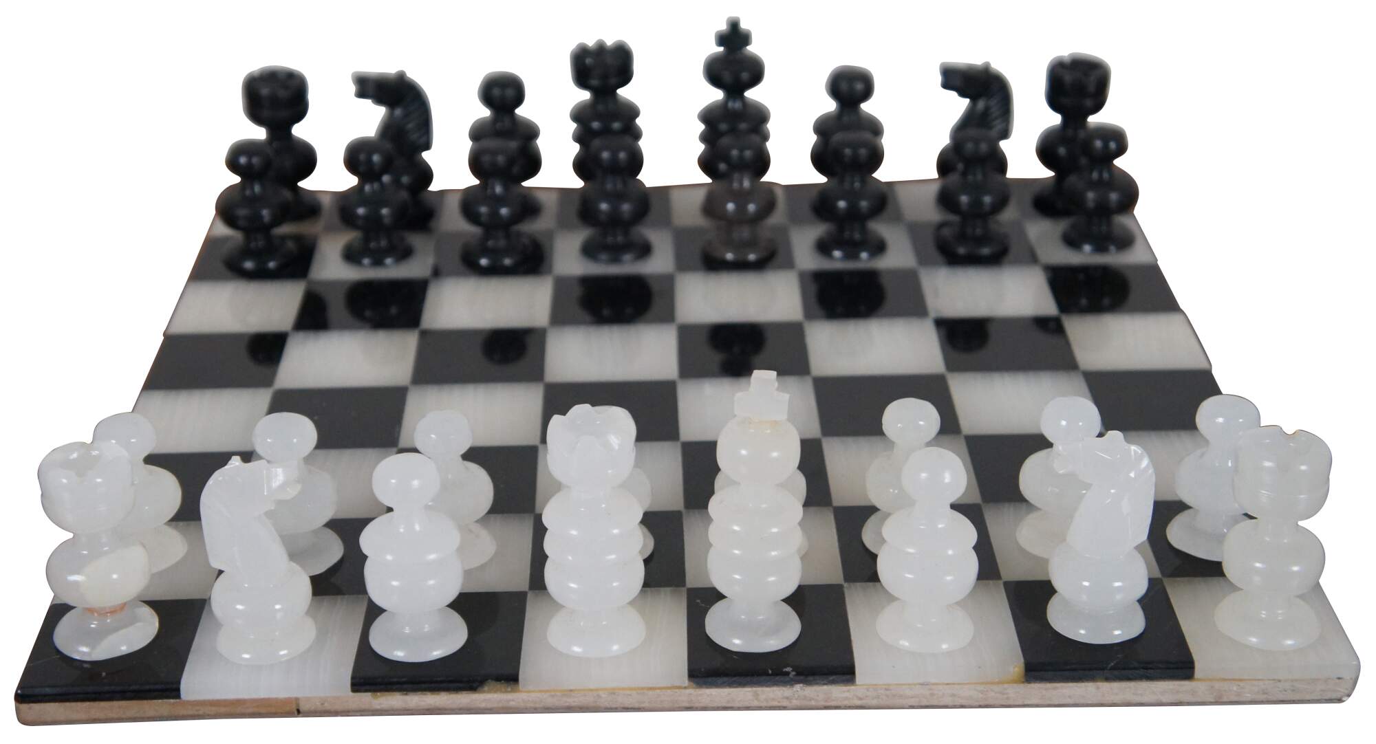 Vintage black and white carved and polished marble / stone chess board and pieces.