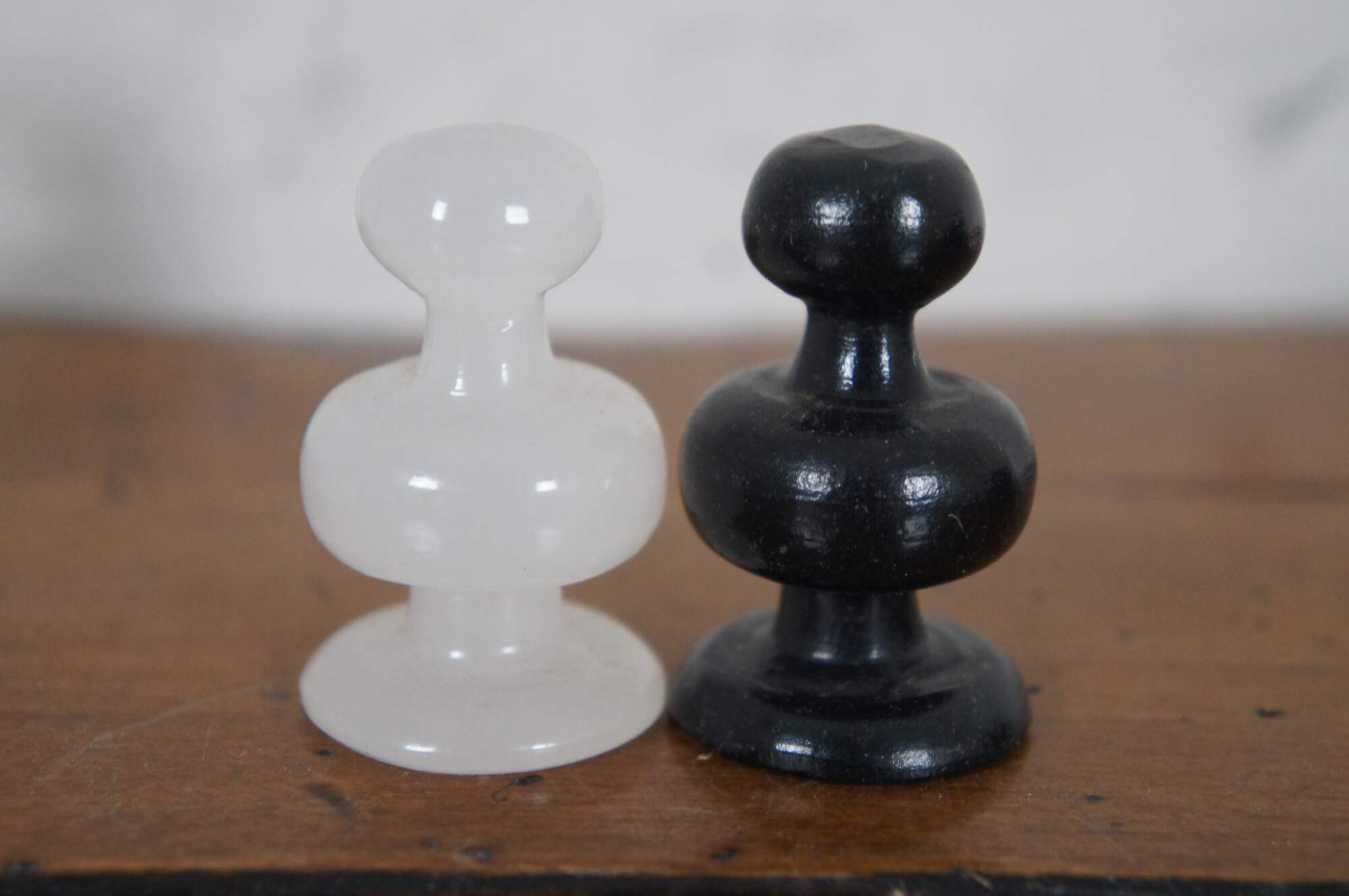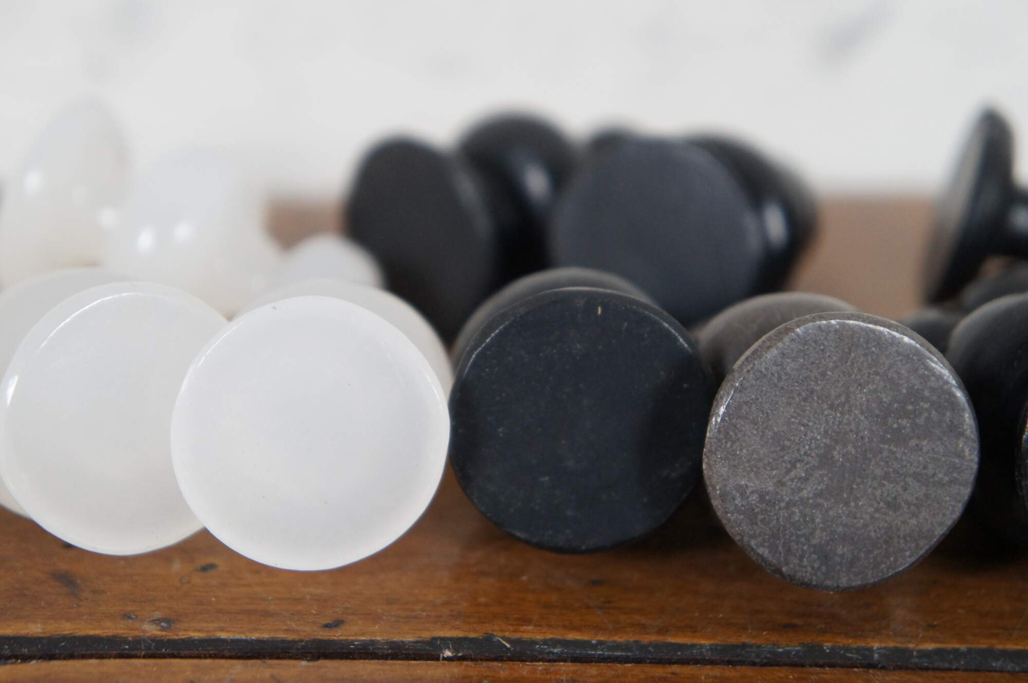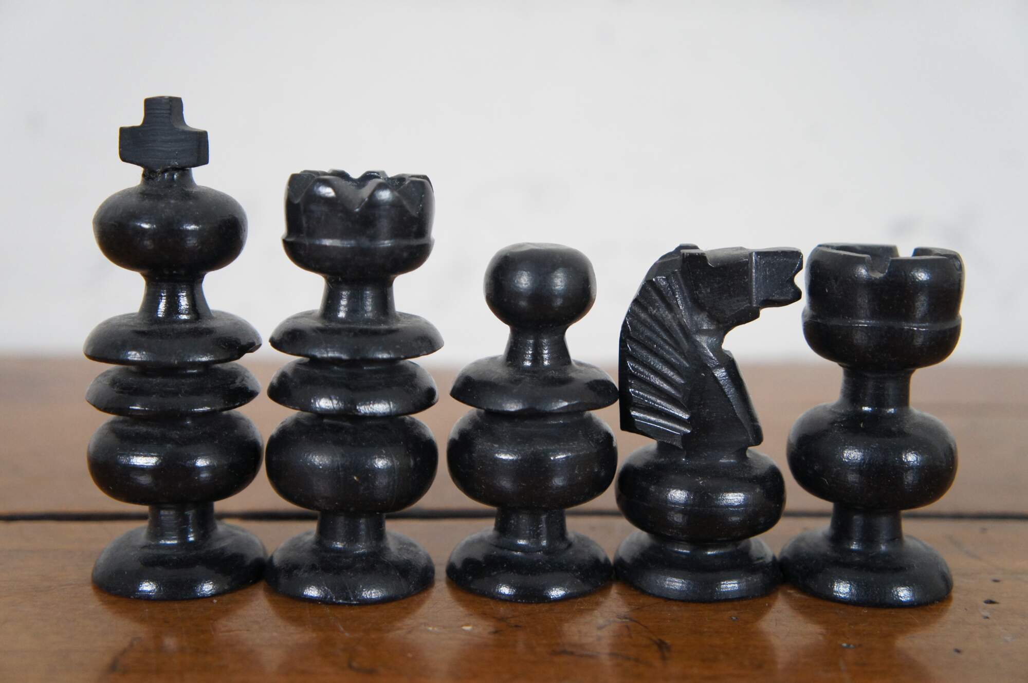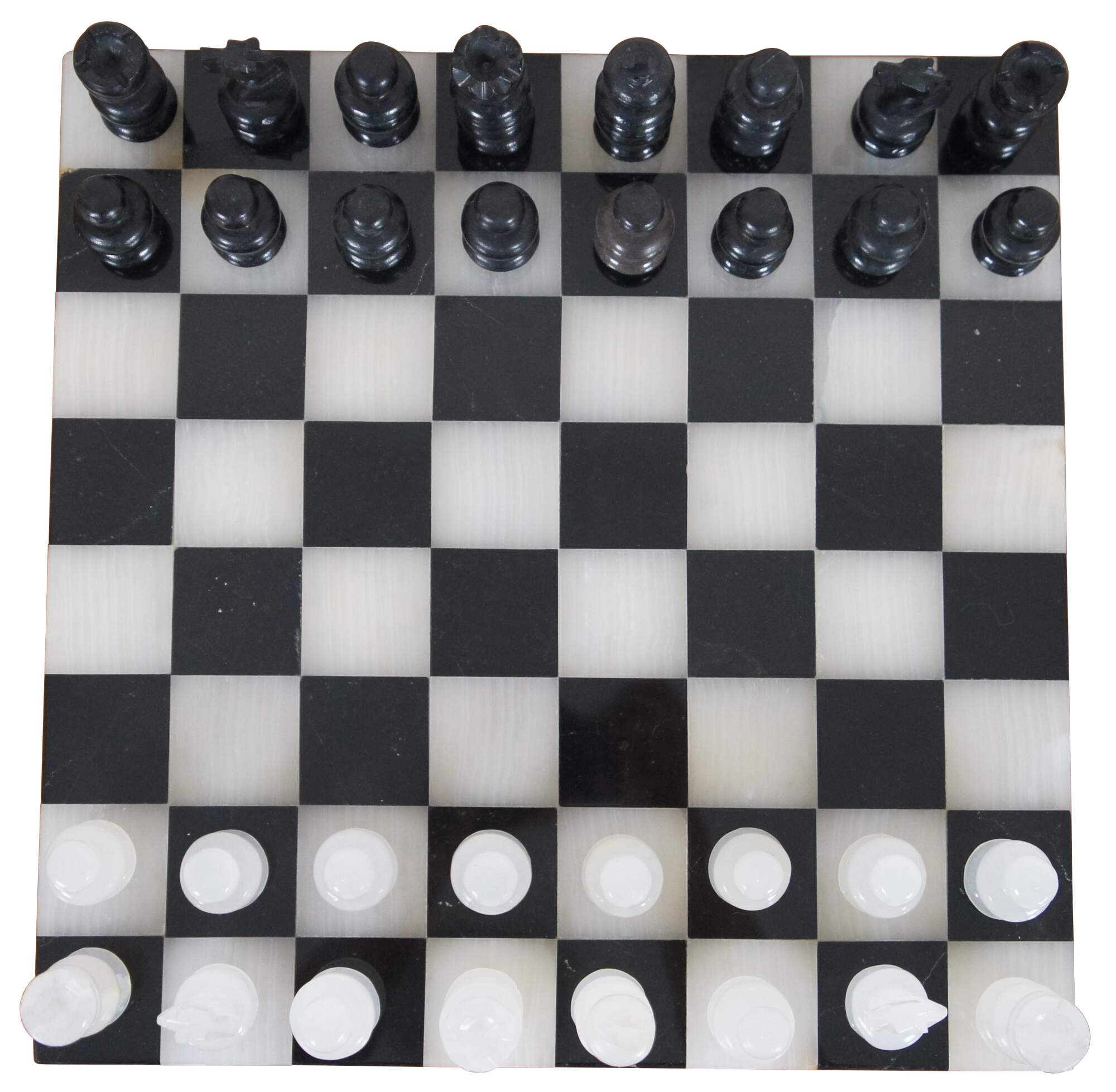 Vintage black and white carved and polished marble / stone chess board and pieces.