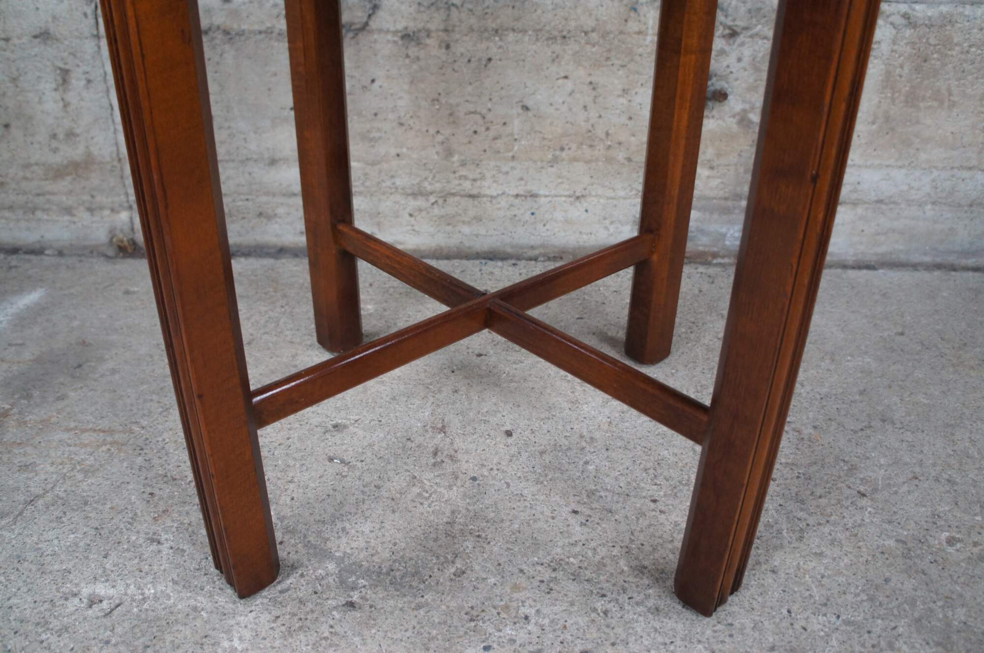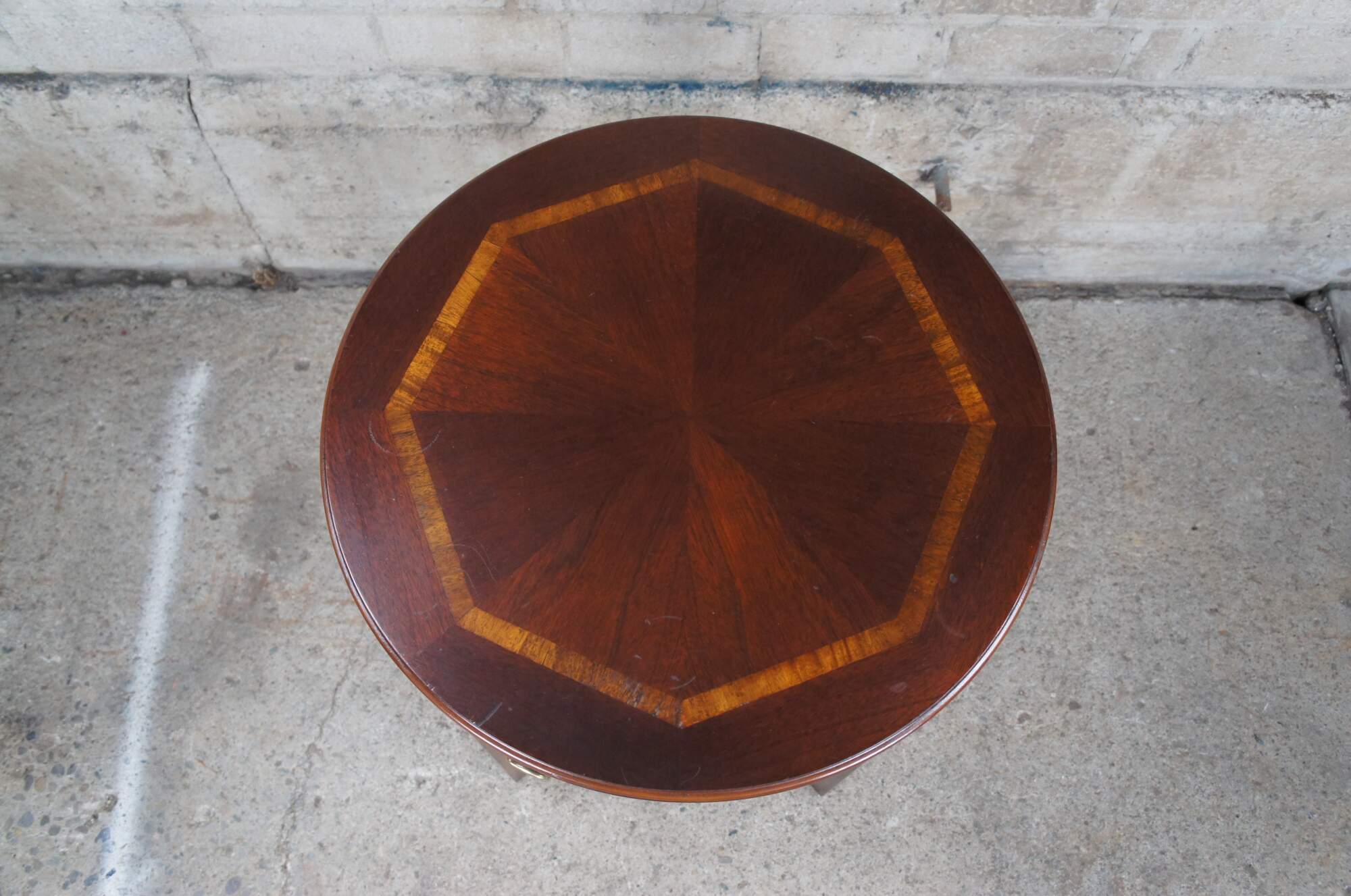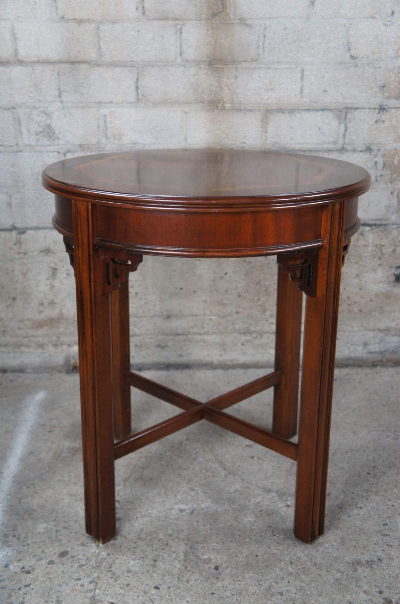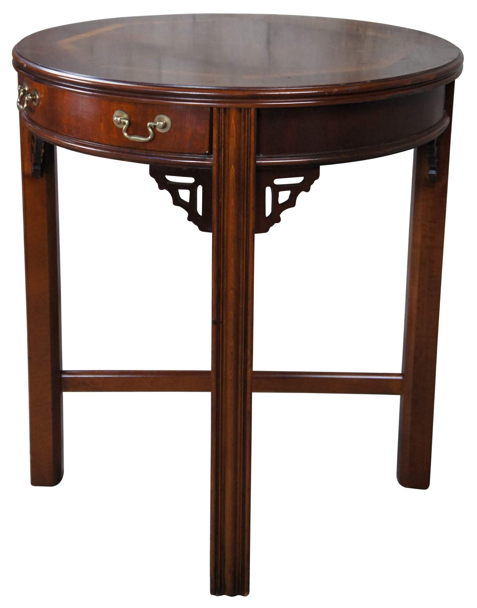 Lane Altavista Chinese Chippendale Accent Table. Features a matchbook banded mahogany tap, central dovetailed drawer with brass hardware, fretwork spandrels and cross form connected legs. Made on 5-16-1994