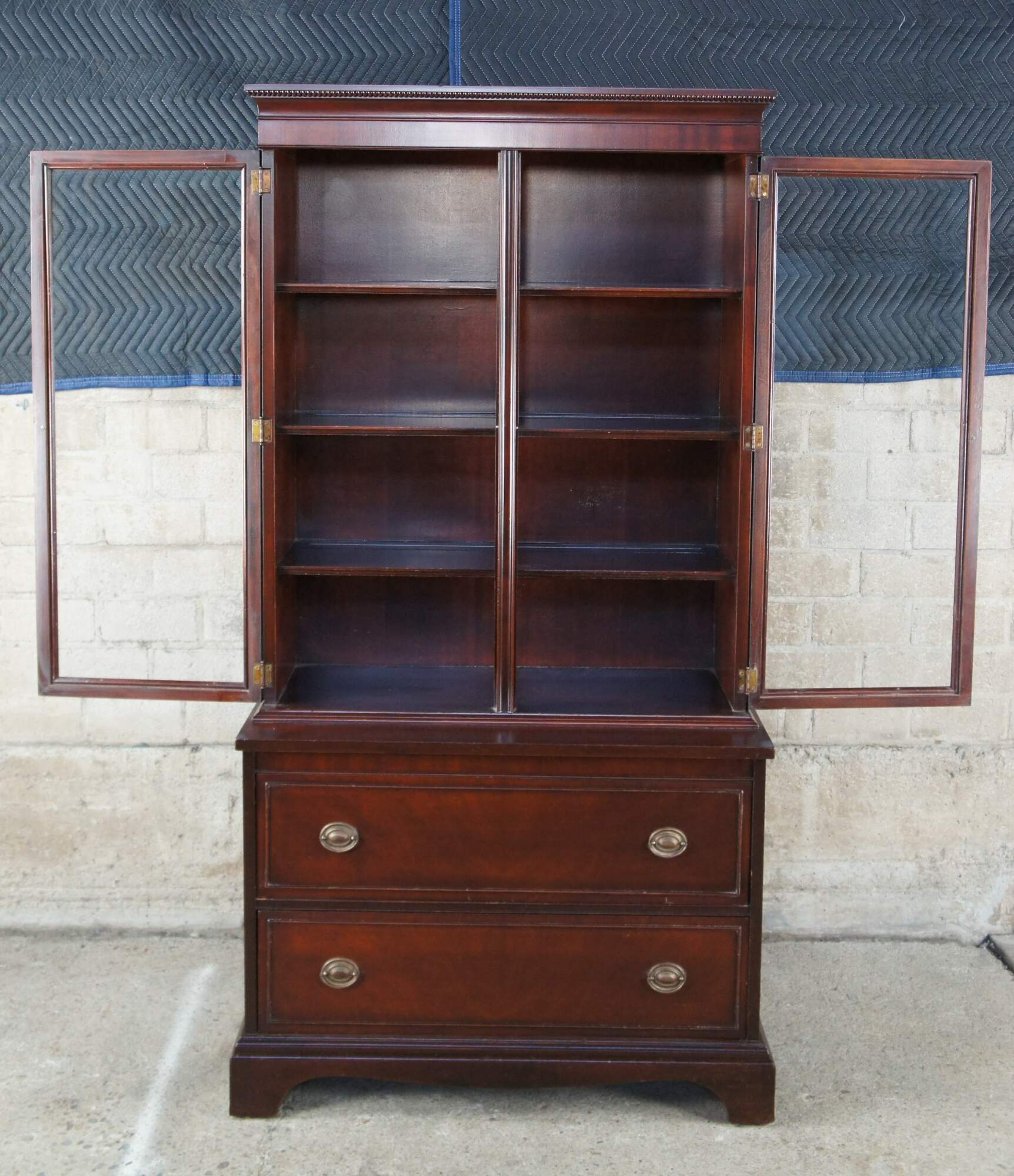 Early 20th Century Brickwede Bookcase or China Cabinet. Made from mahogany with sheraton styling and a stepback form. Features an upper display portion of three shelves with plate grooves and upper beaded apron. Lower drawers are made from oak and dovetailed with brass hardware.