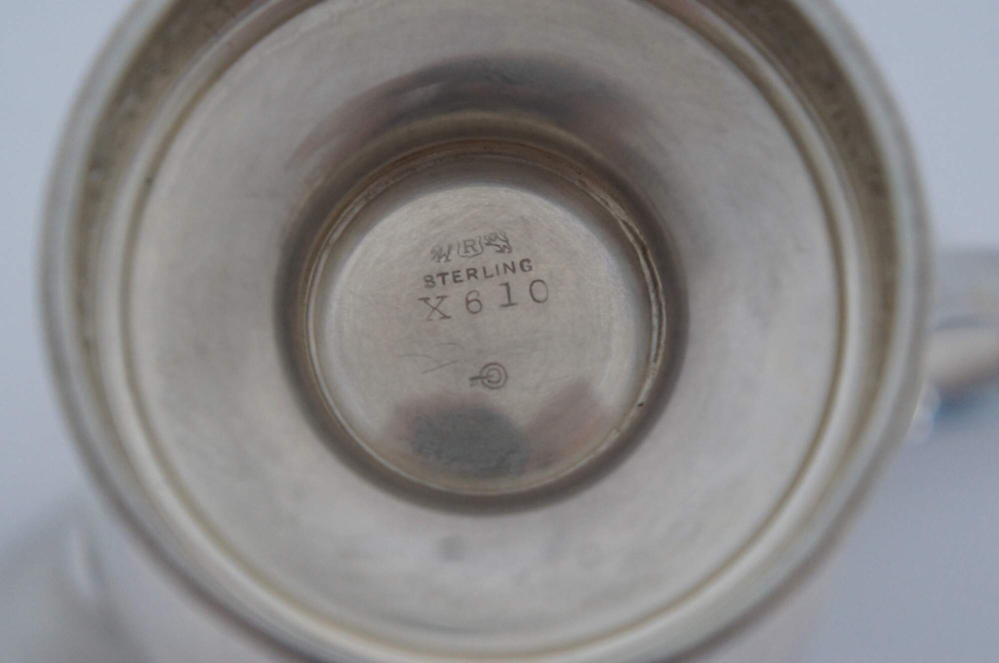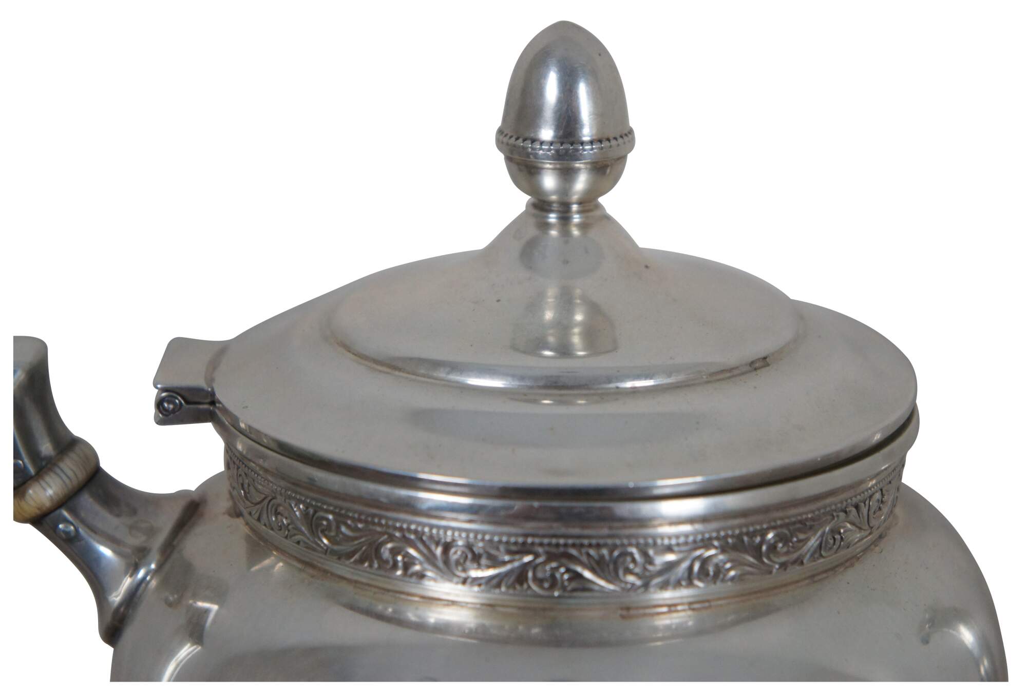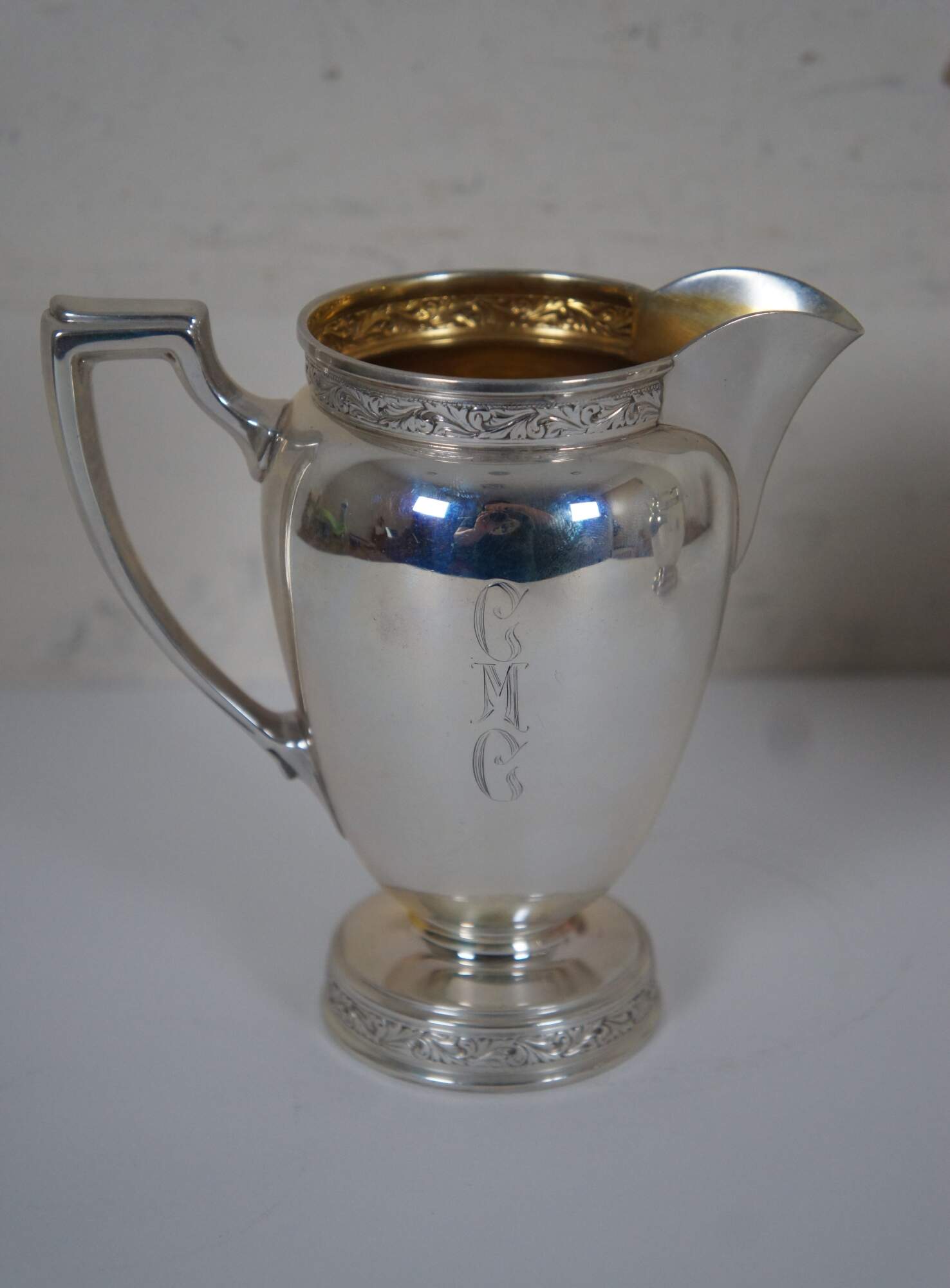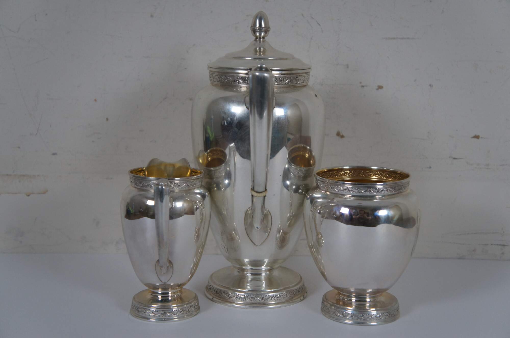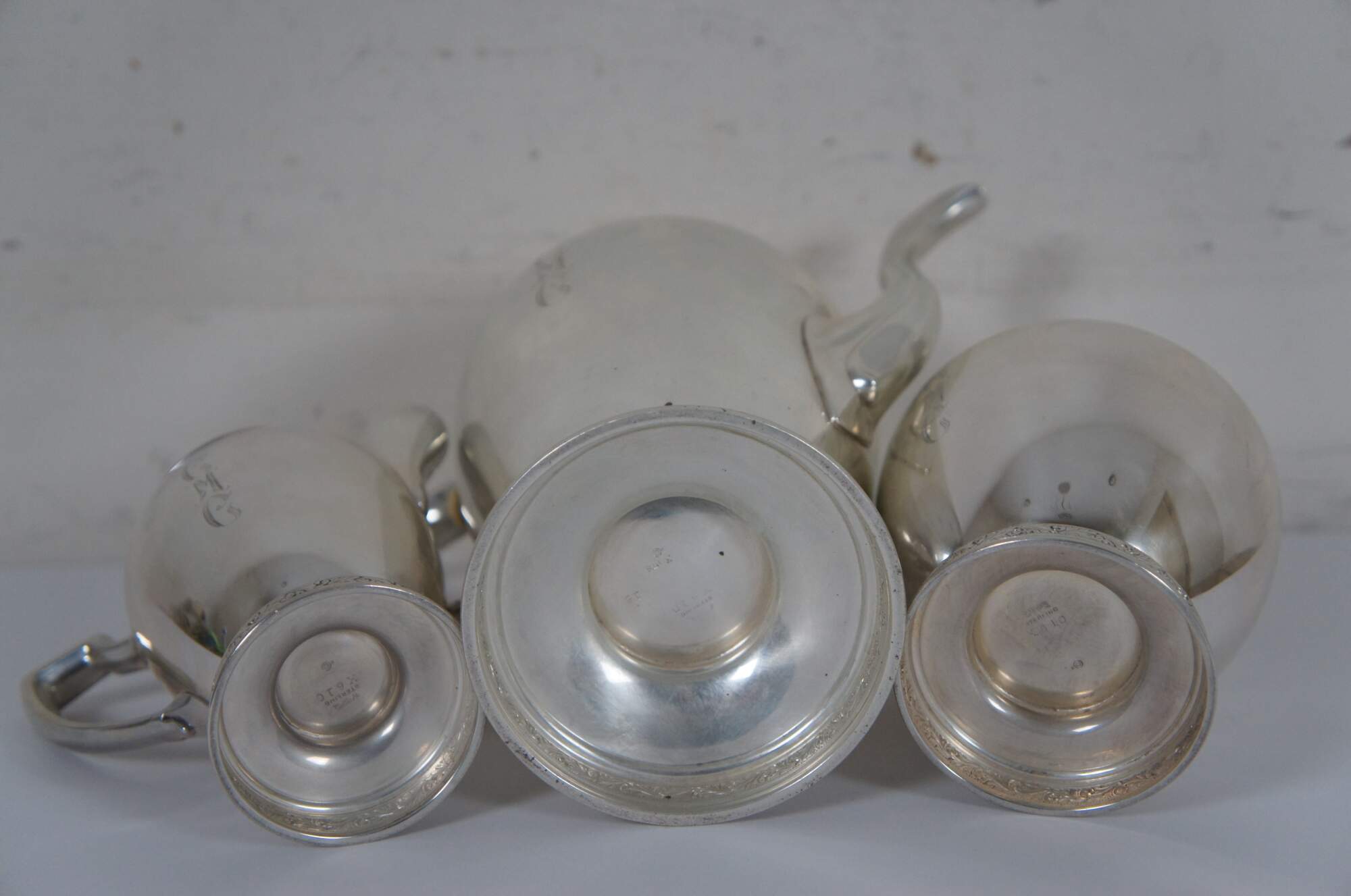 Antique 1936 Reed and Barton number X610 sterling silver 925 tea pot, creamer and sugar bowl set, trimmed with bands of swirling leaves, and engraved with the initials CMC. “The Reed & Barton story began in 1824, when Isaac Babbitt created a new metal alloy - ""Britannia metal"" - in his Taunton, Massachusetts pewter shop.