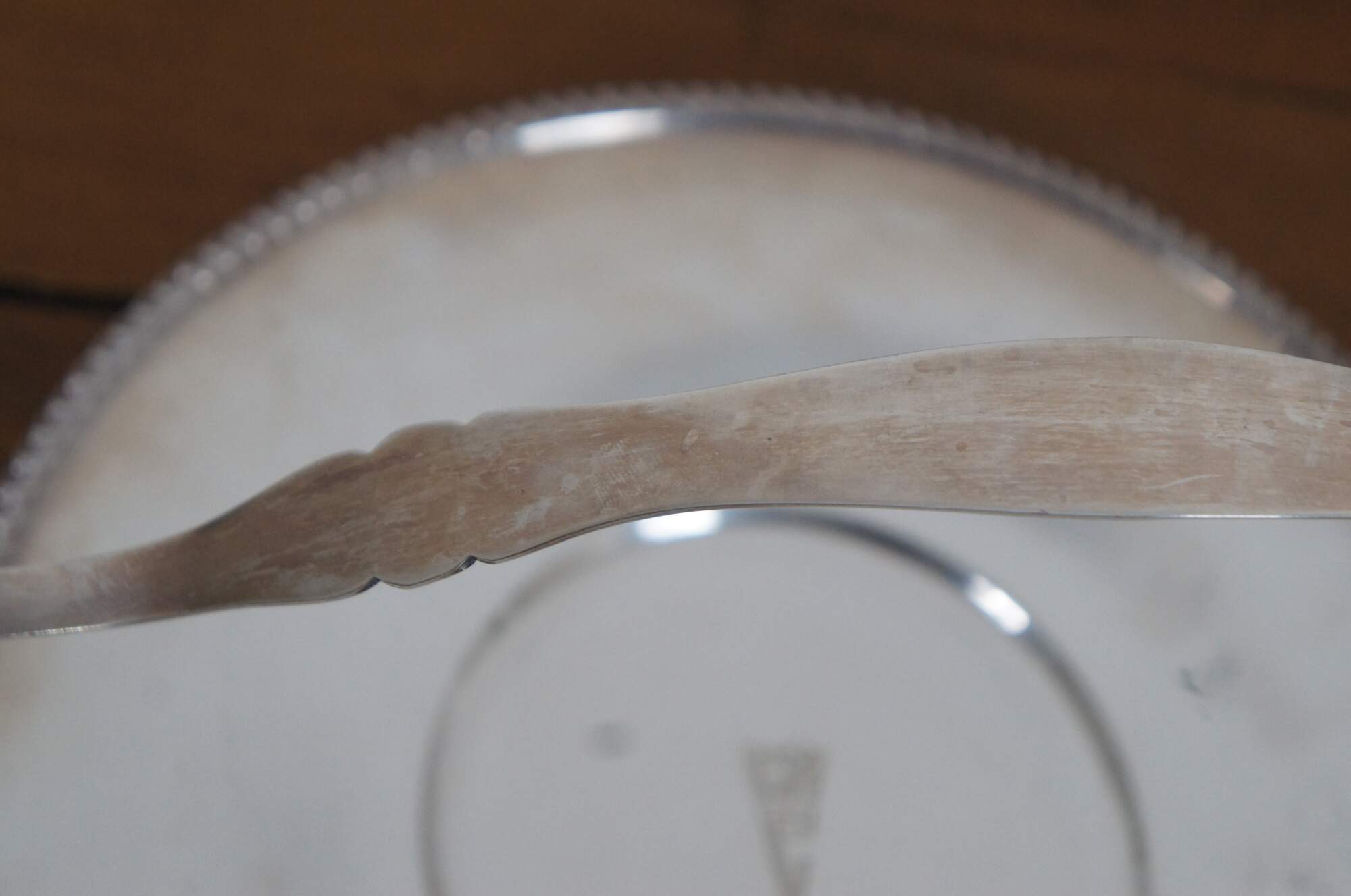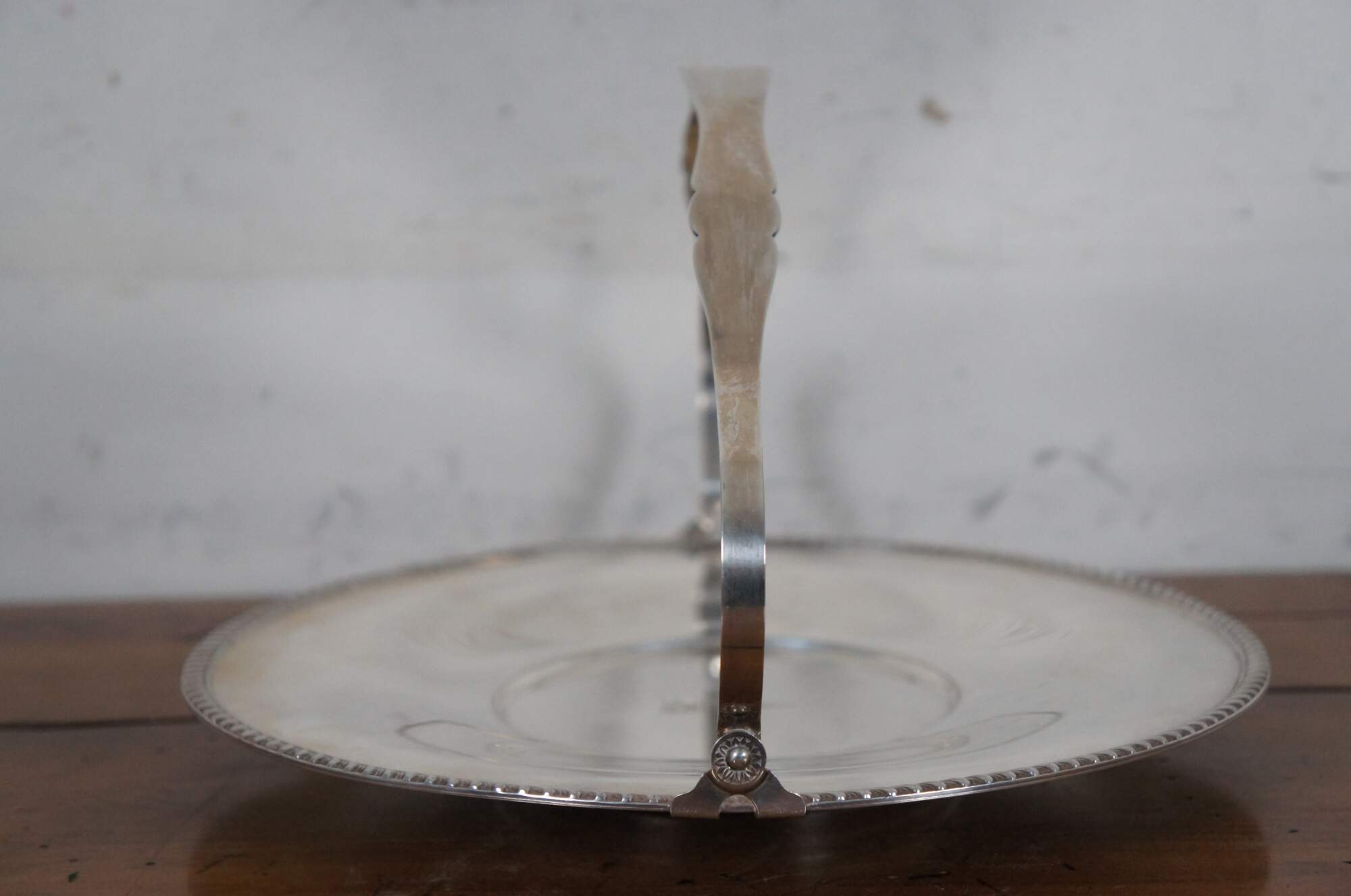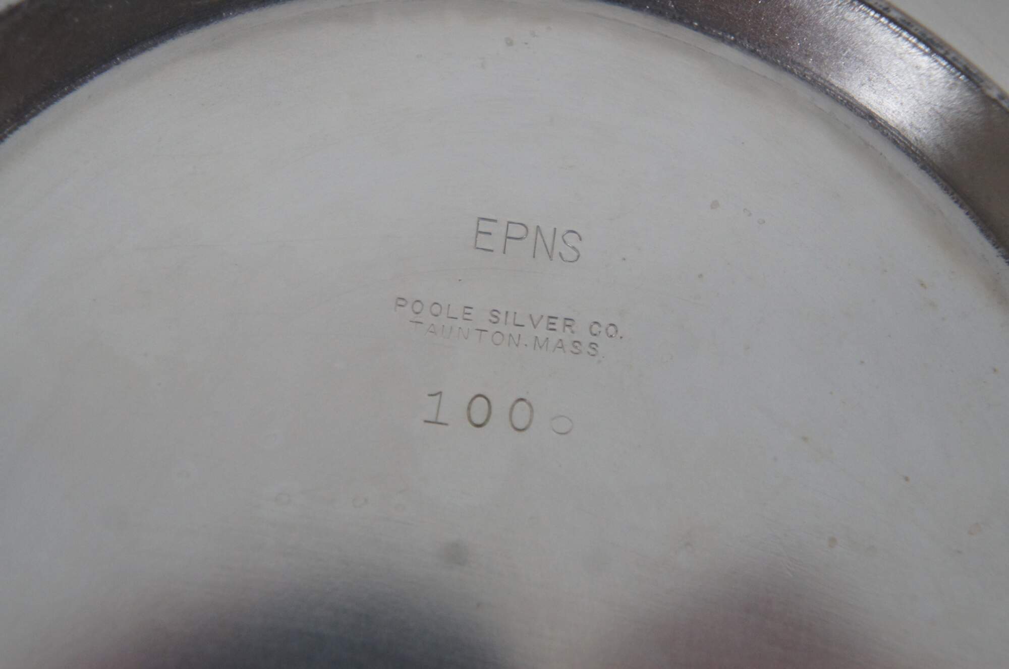 Antique Poole silver plate number 100 brides basket with rope twist edge, rotating handle, engraved with the initials CMC. “Poole Silver Company was an American silver manufacturing company, active in Taunton, Massachusetts from 1892-1971. The Poole Silver Company was formed in 1892 by George Poole and Edward Roche in Taunton as Poole, Roche & Co., then established as a corporation on May 21, 1895, as an early manufacturer of silver products made with electroplating techniques. In 1900 it operated in a small two-room factory at 106 Whittenton Street, and later moved to 320 Whittenton Street. From 1946 the firm began to produce sterling silver flatware, holloware, and cutlery. In 1971 the company was bought by Towle Silversmiths. The intellectual property currently belongs to Lifetime Brands.”