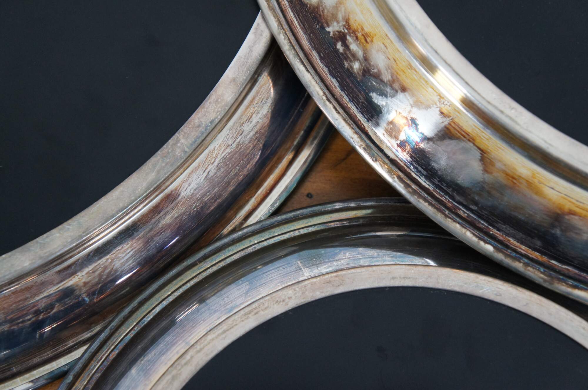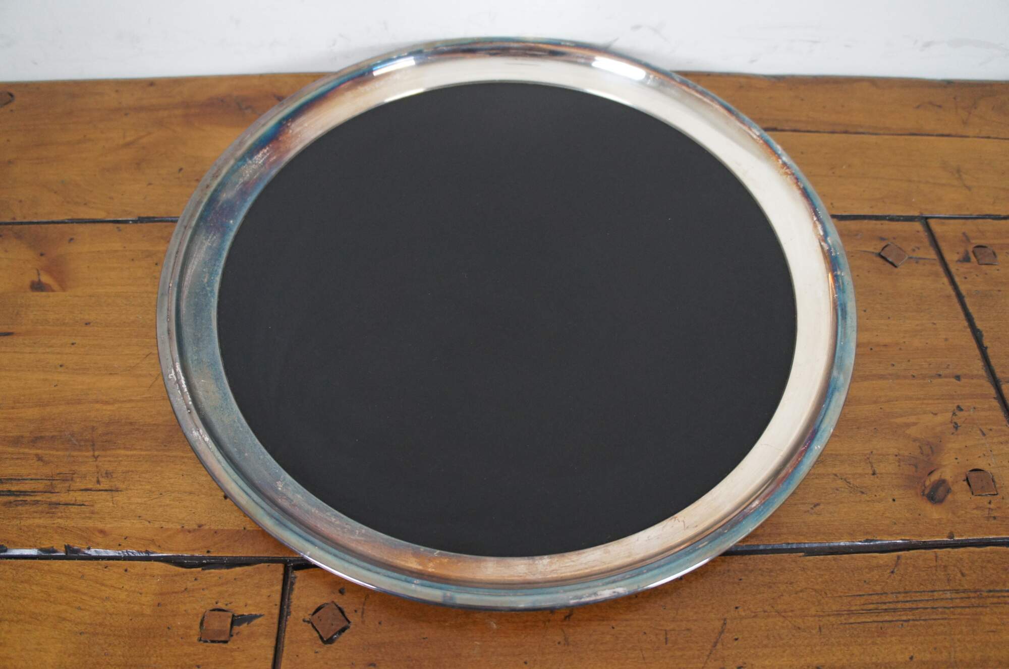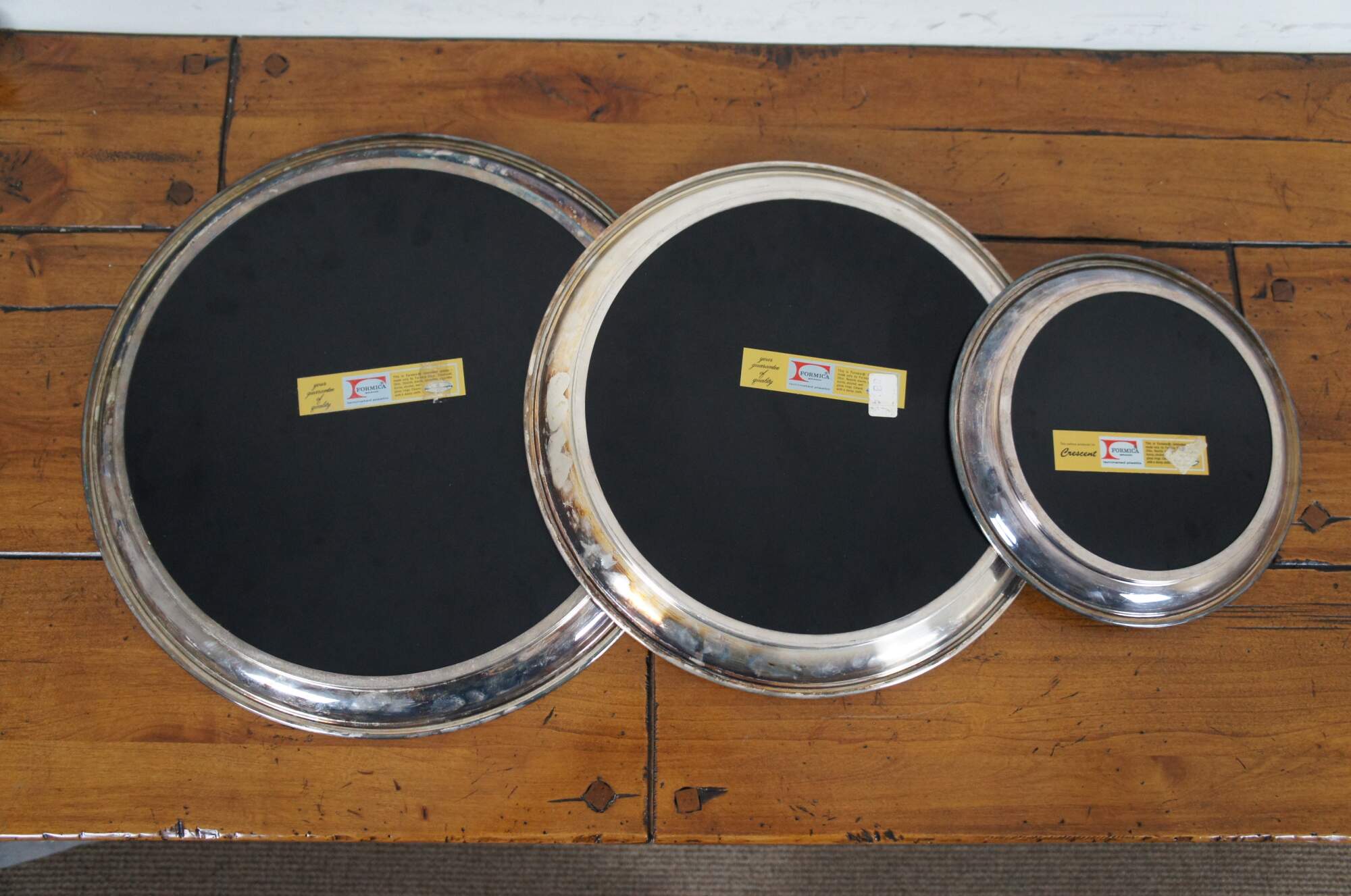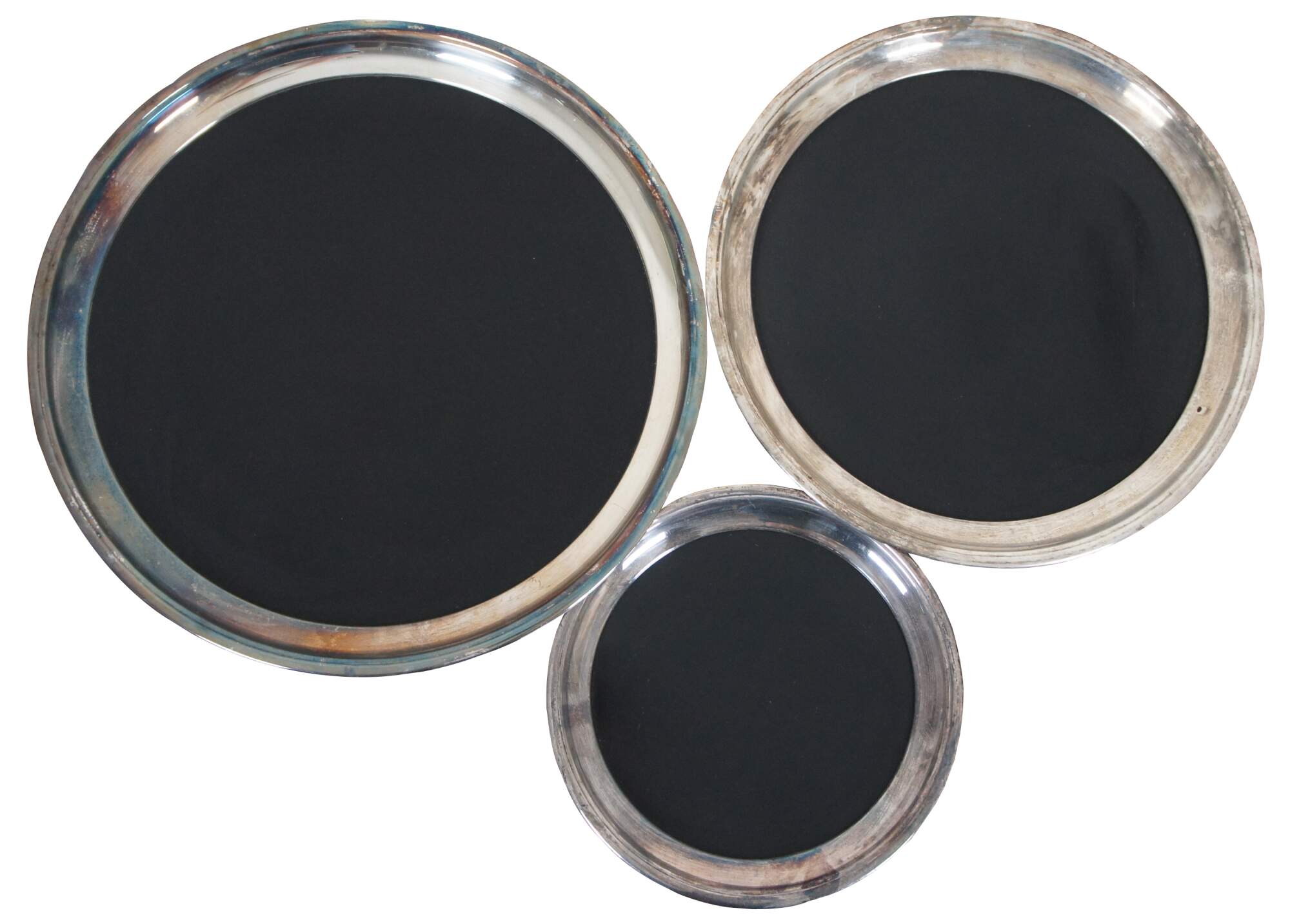 Set of three mid century Crescent silver plate and black Formica round serving trays.