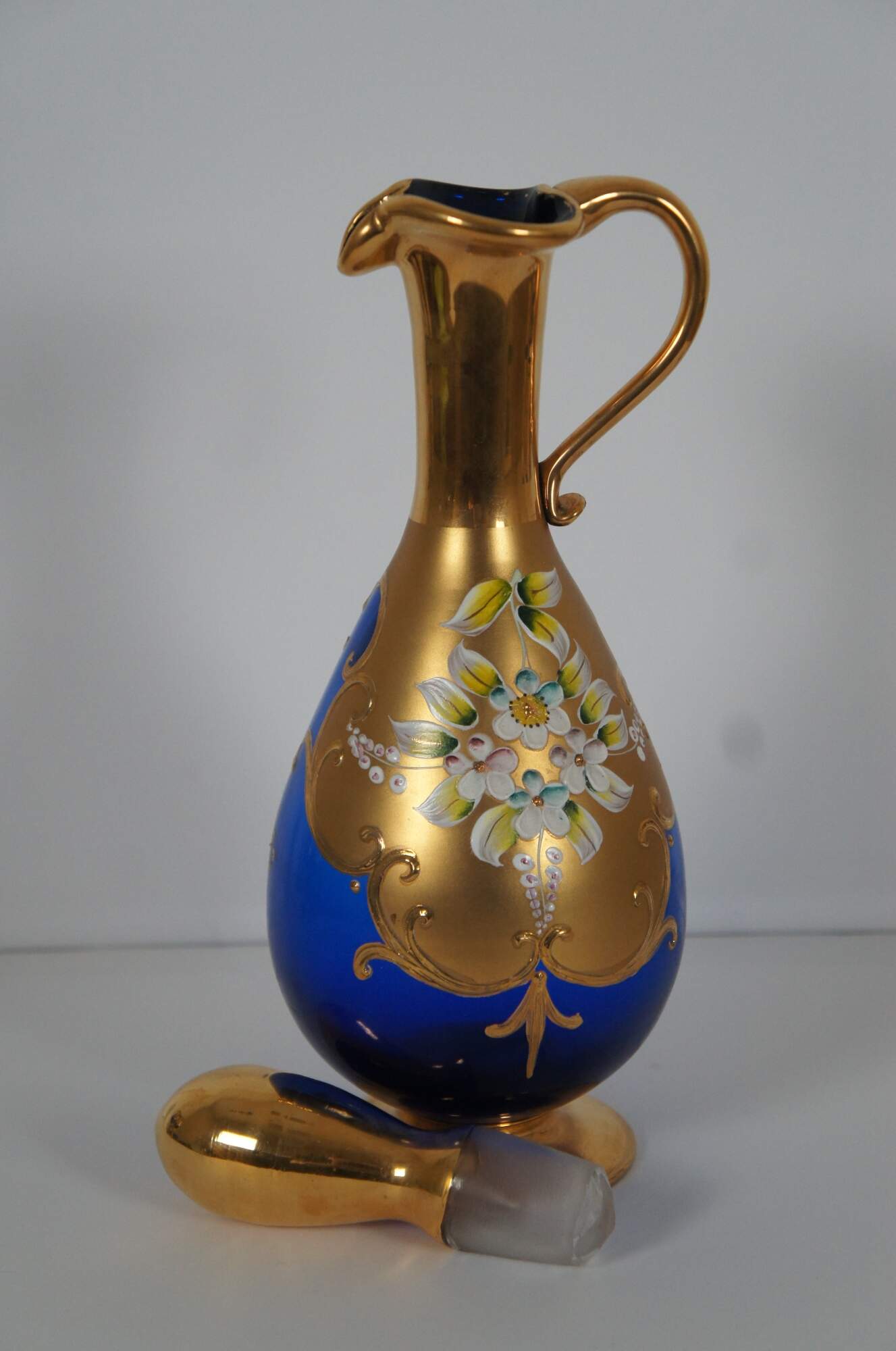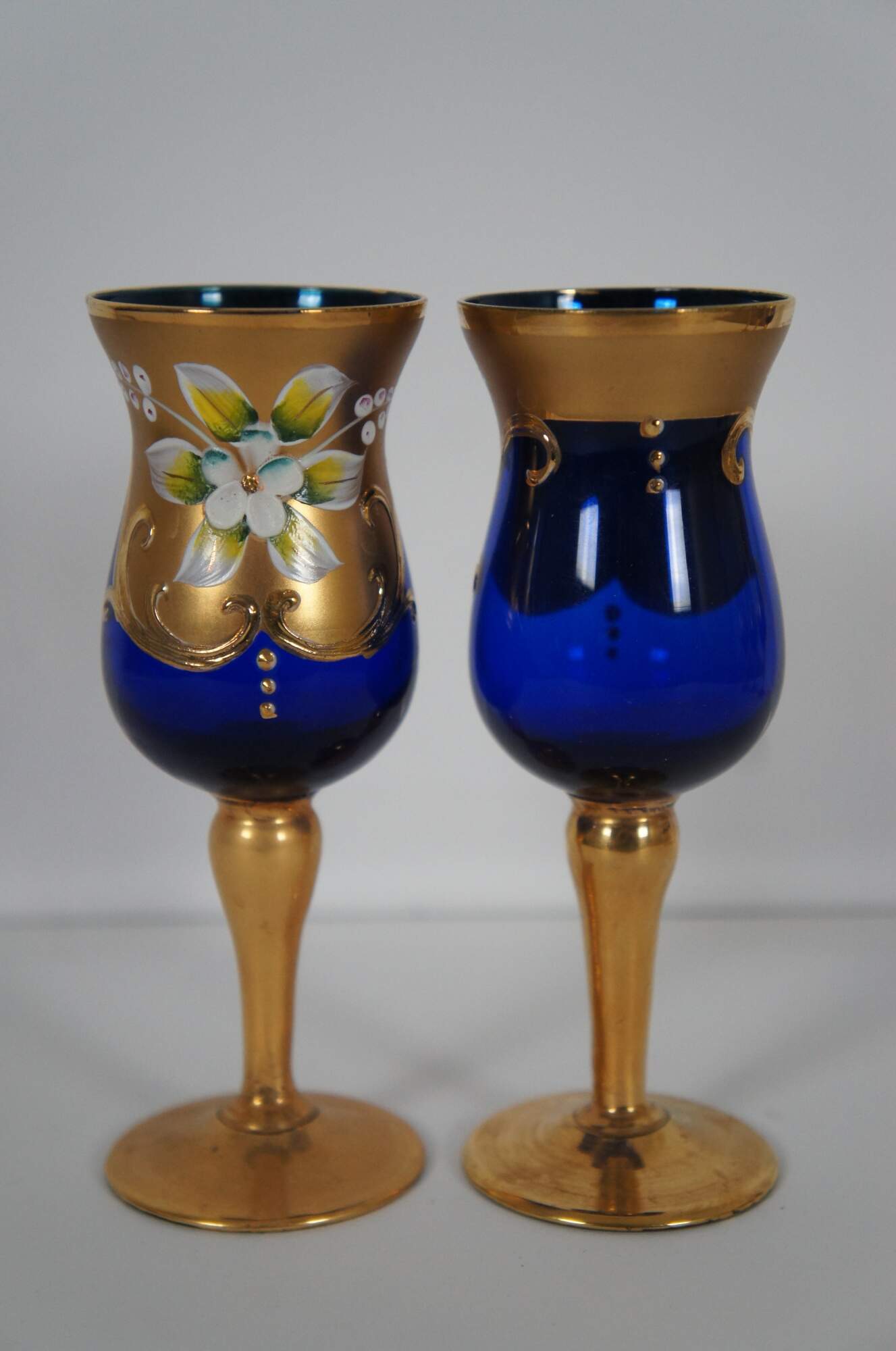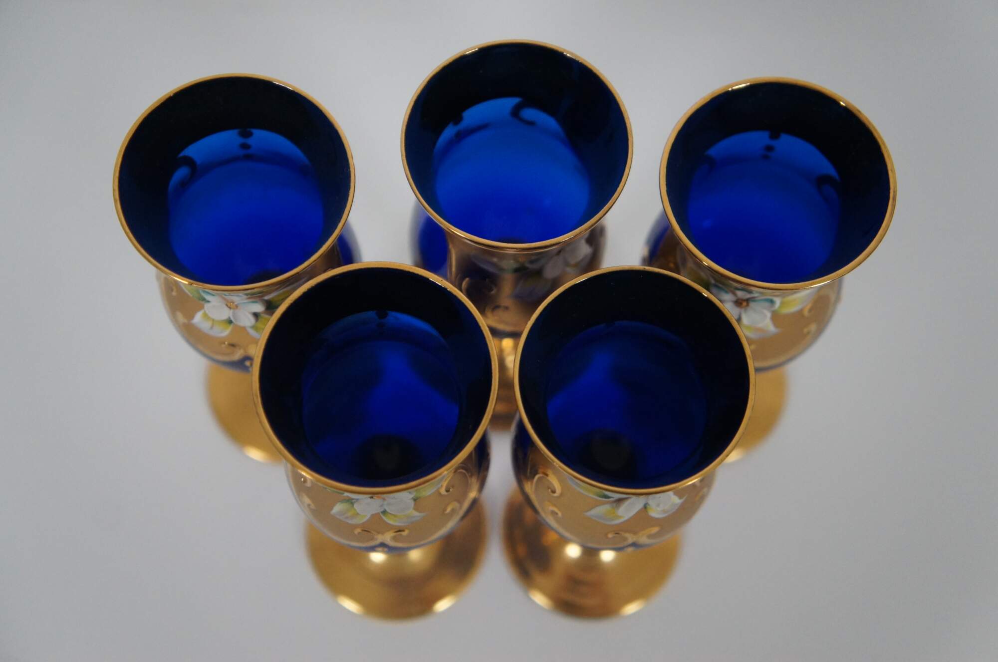 Elegant hand blown Bohemian or Czech art glass bar decanter and cordial goblet set in cobalt blue glass, painted in gold with white and yellow flowers.