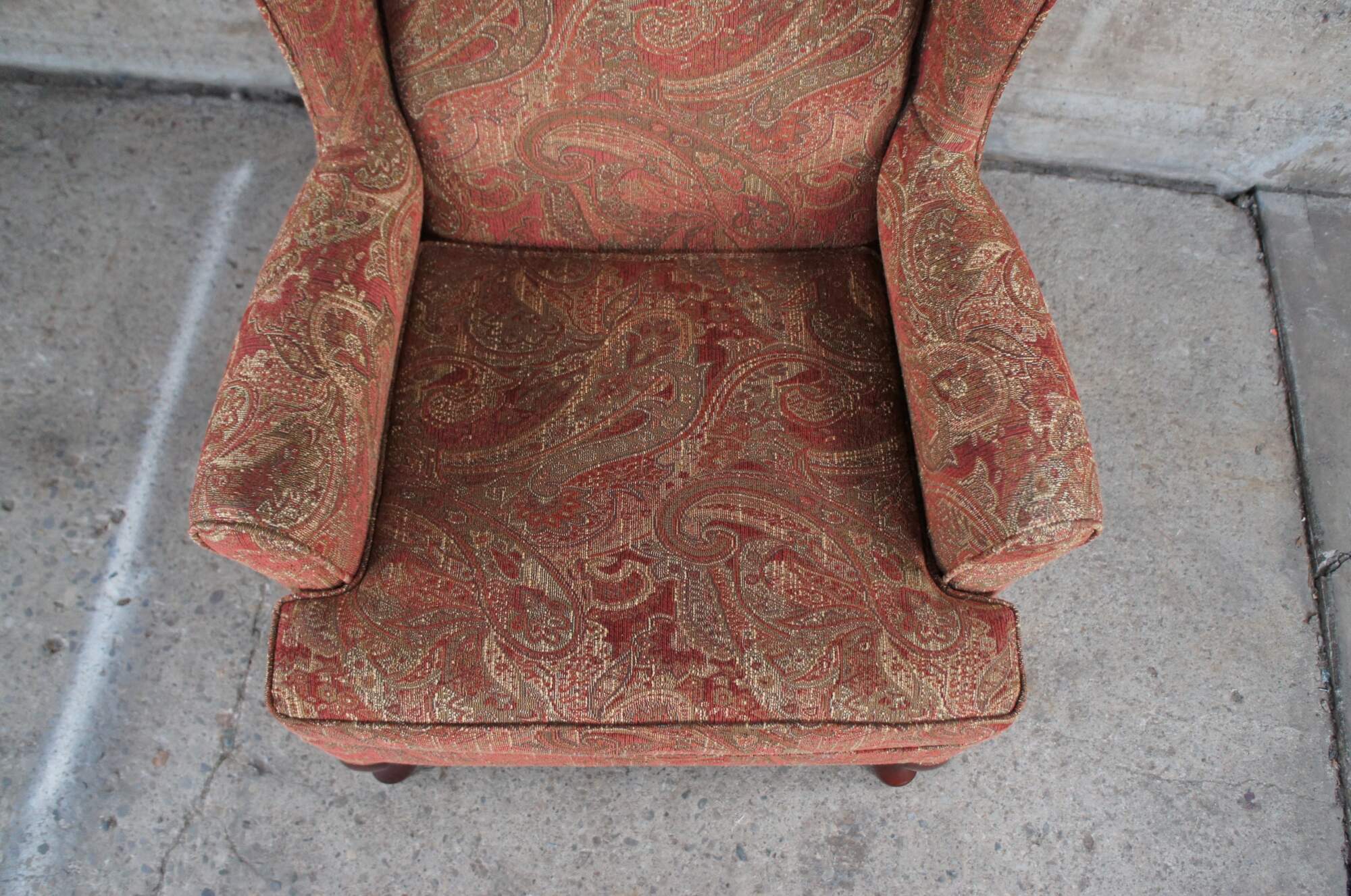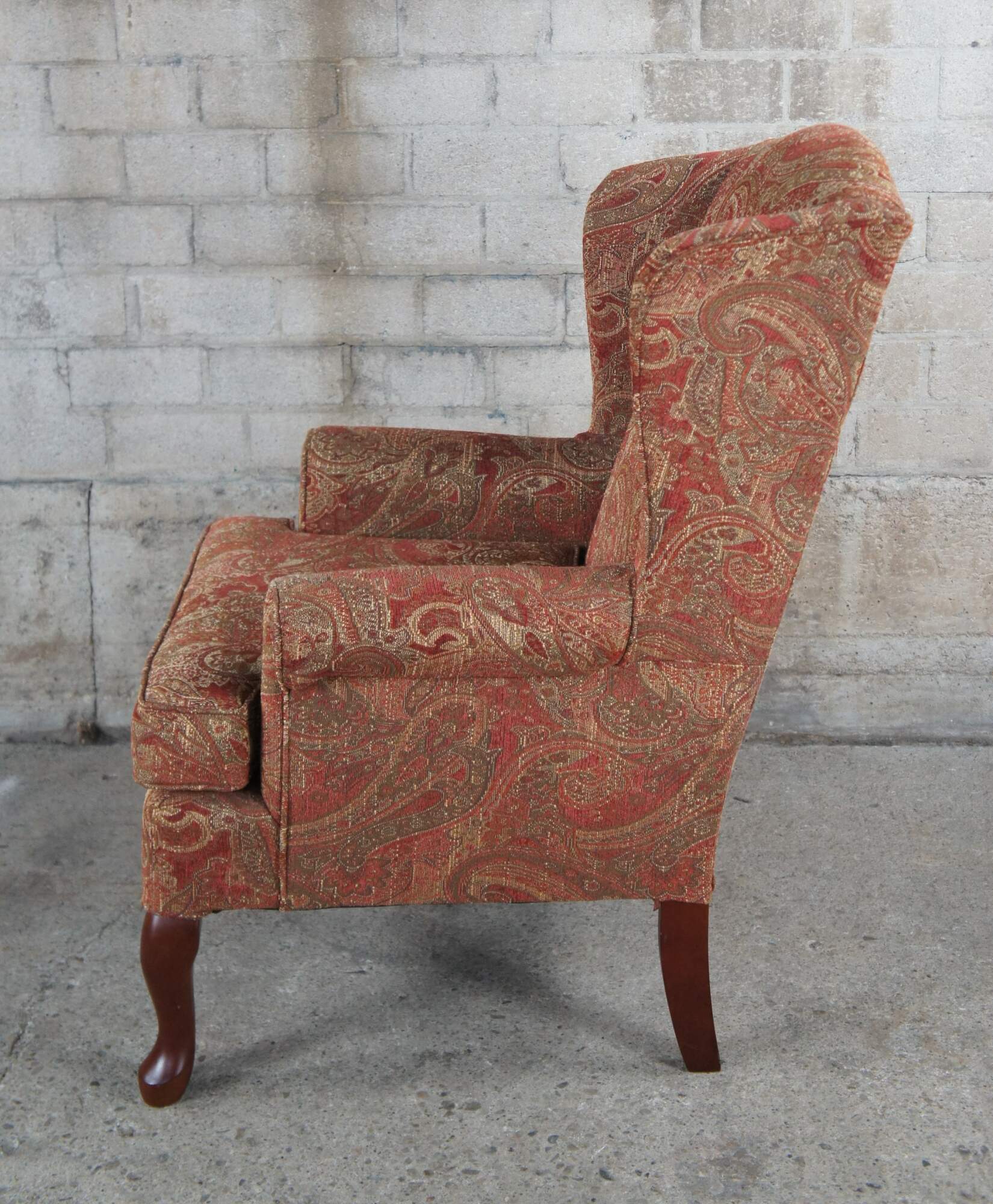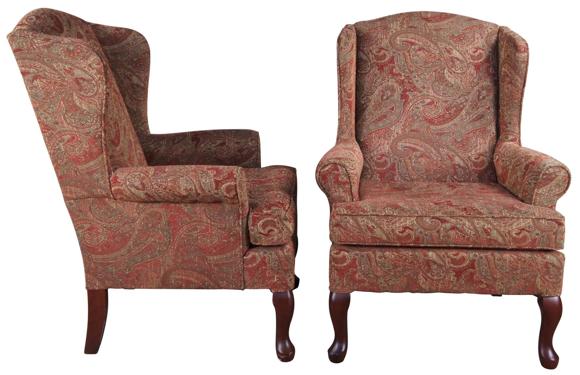 Pair of Best Home Furnishing Wing Chairs. Upholstered in a red and gold fabric with spice finished legs.