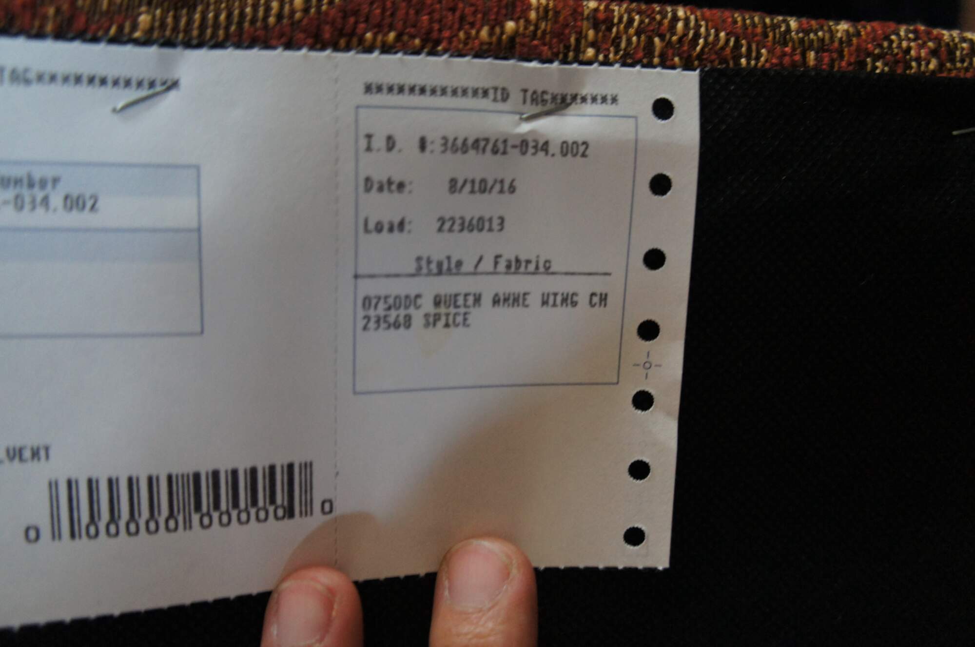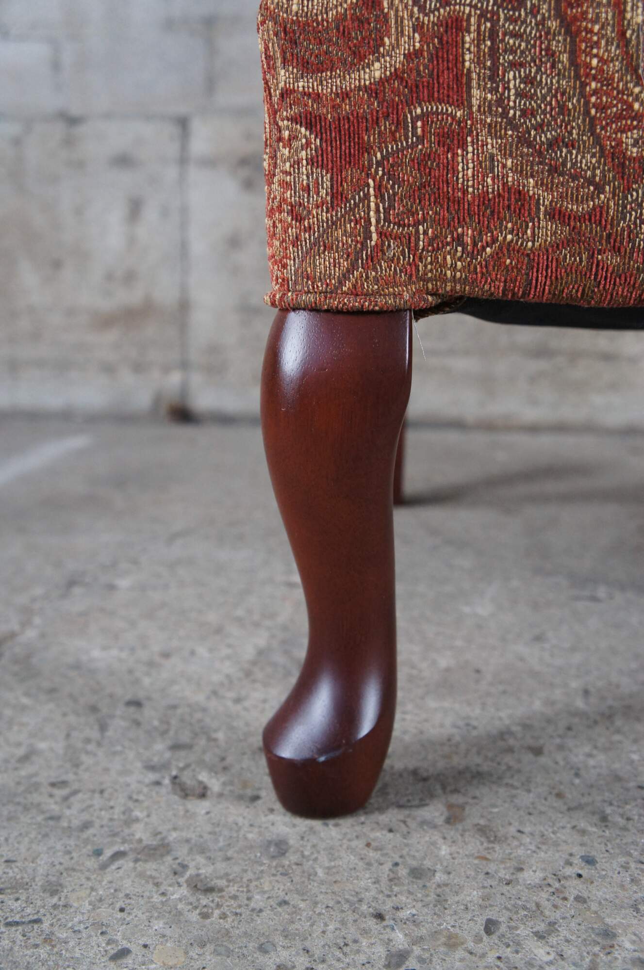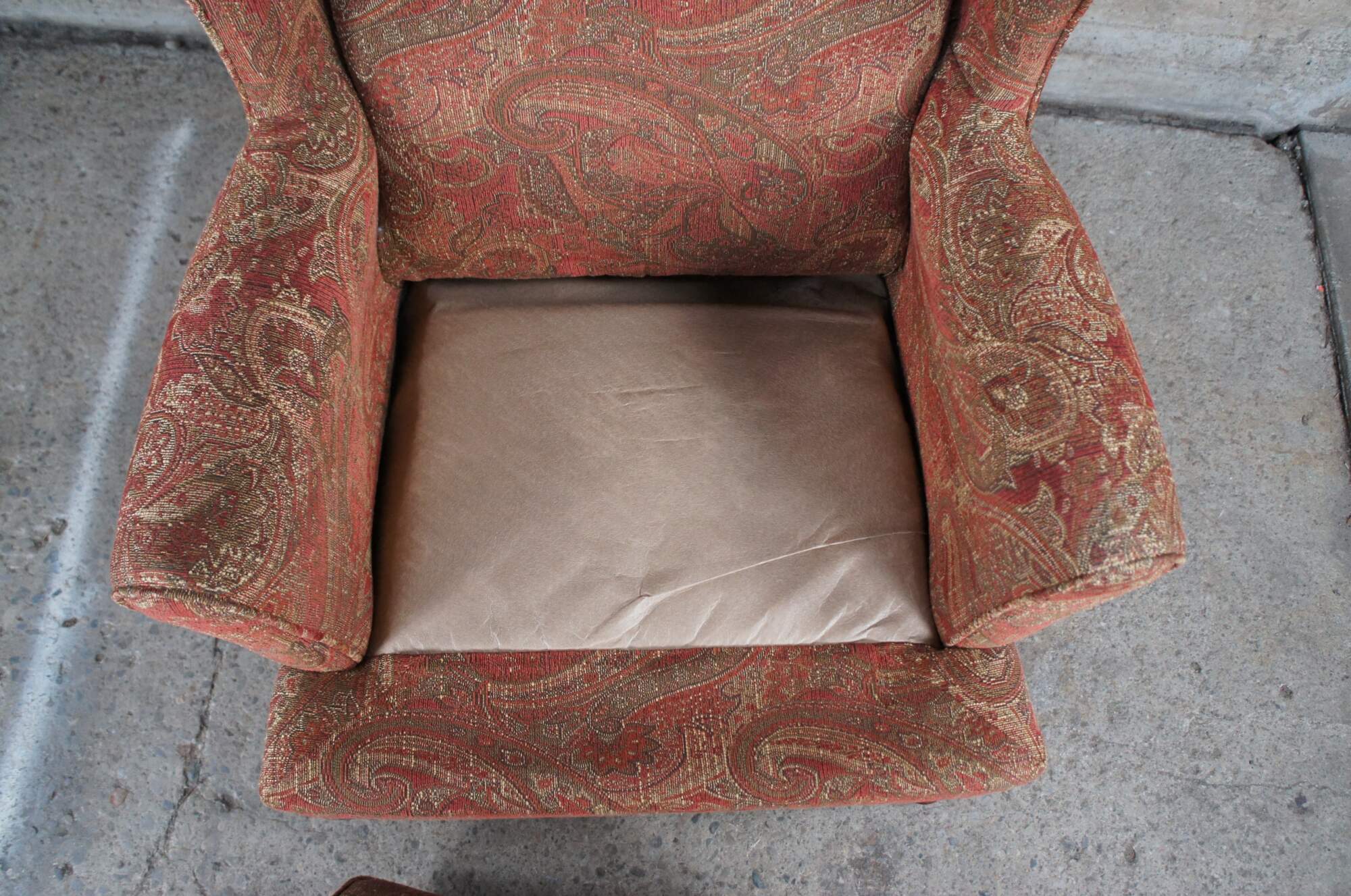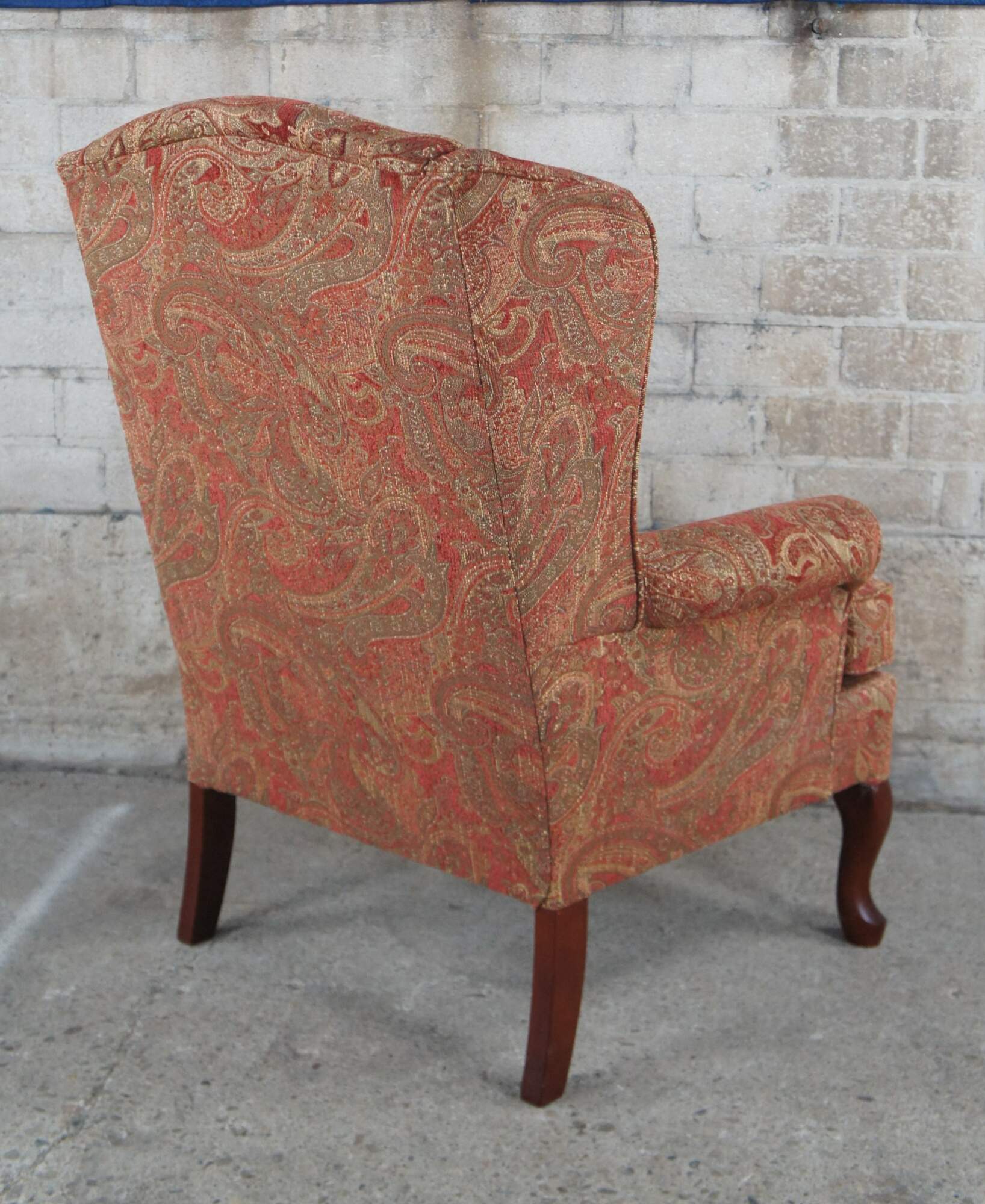 Pair of Best Home Furnishing Wing Chairs. Upholstered in a red and gold fabric with spice finished legs.