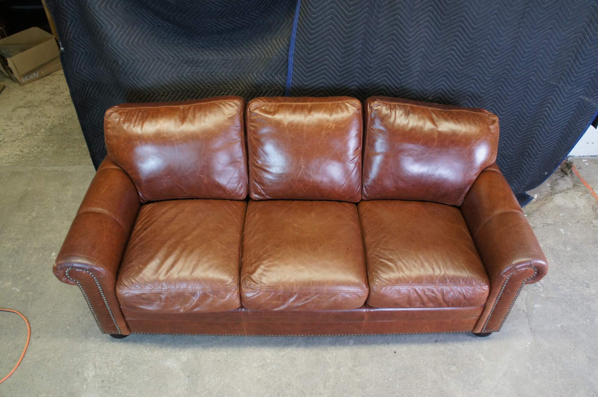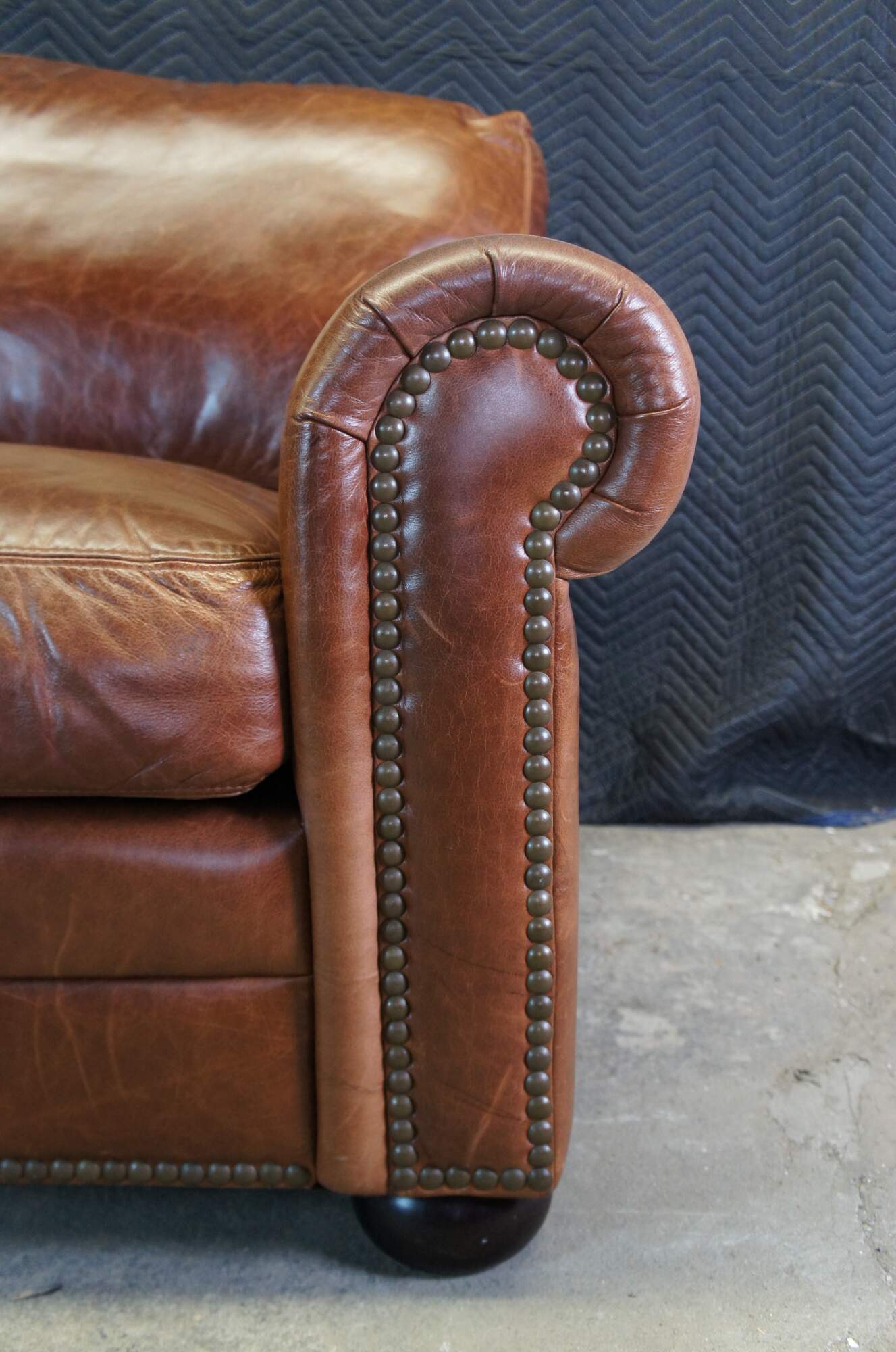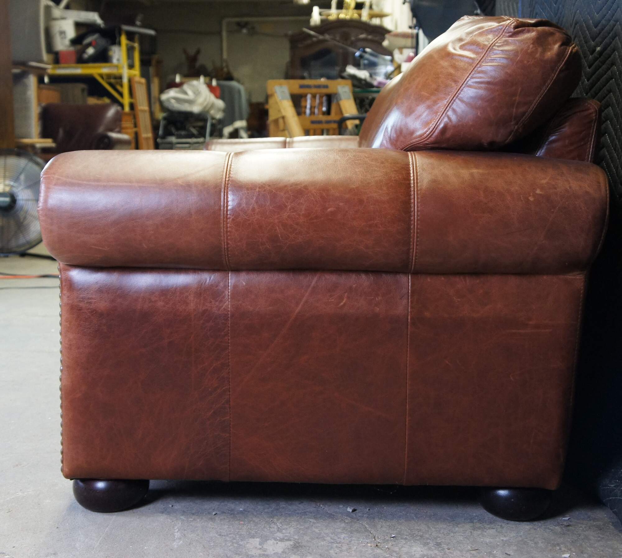 The Omnia Savannah Leather 3 Seat Sofa. Traditional form with rolled arms and bun feet. Features individually placed touching nail heads along the front arm panels and along bottom of front panel. Bun feet finished in Expresso finish. Ideal for TV, Bar and game rooms.