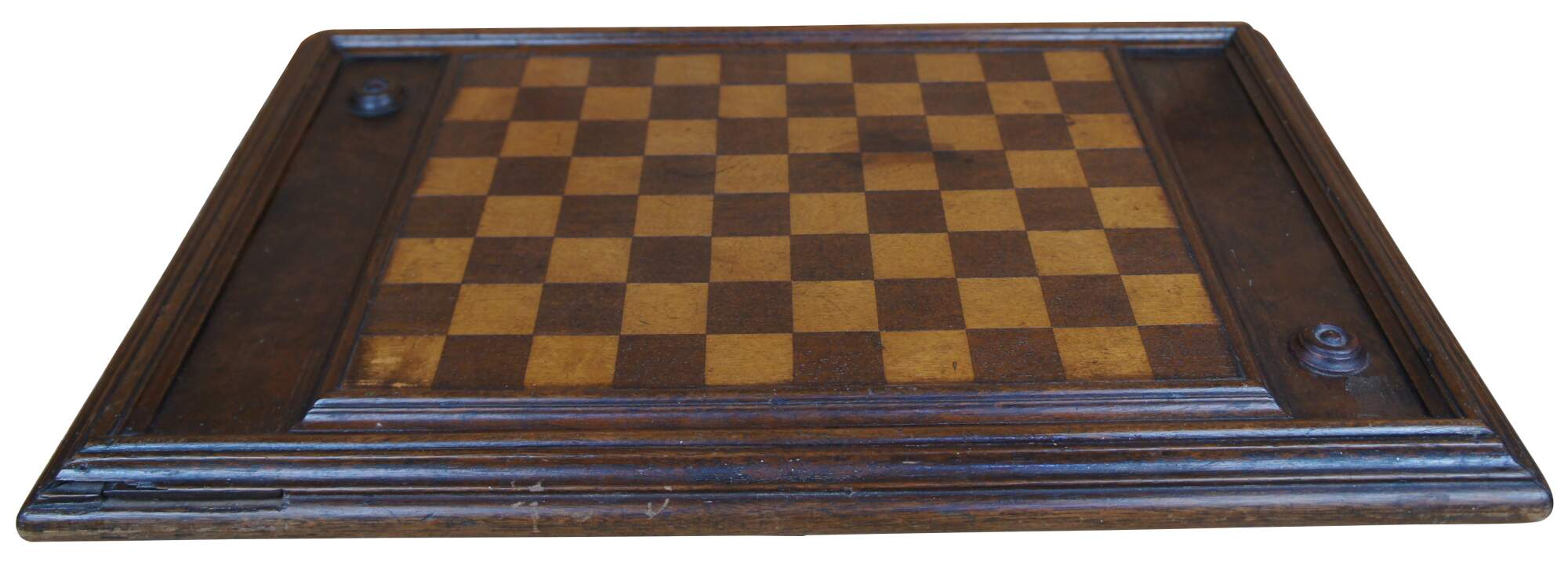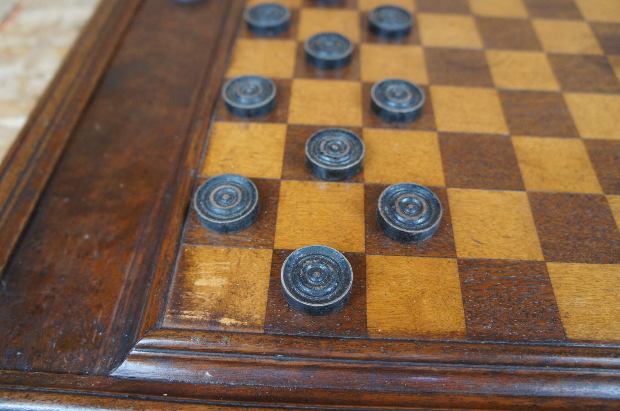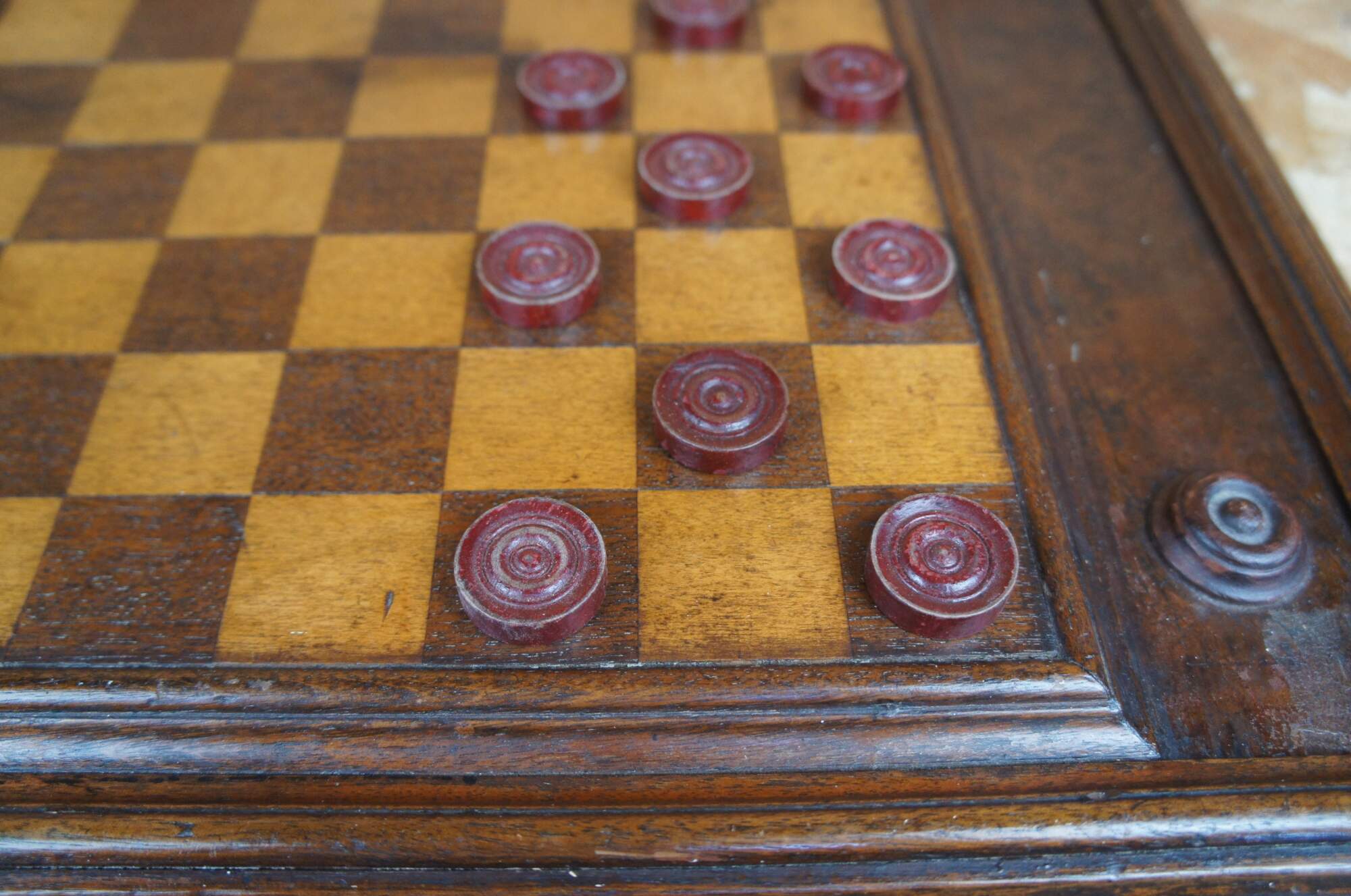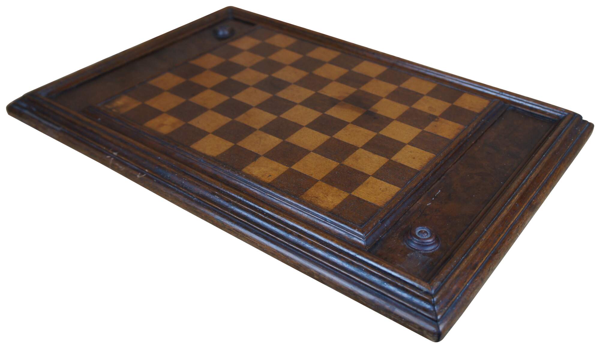 Antique mahogany checkers or draughts set featuring rectangular form with internal storage compartment for pieces and a board on each side.