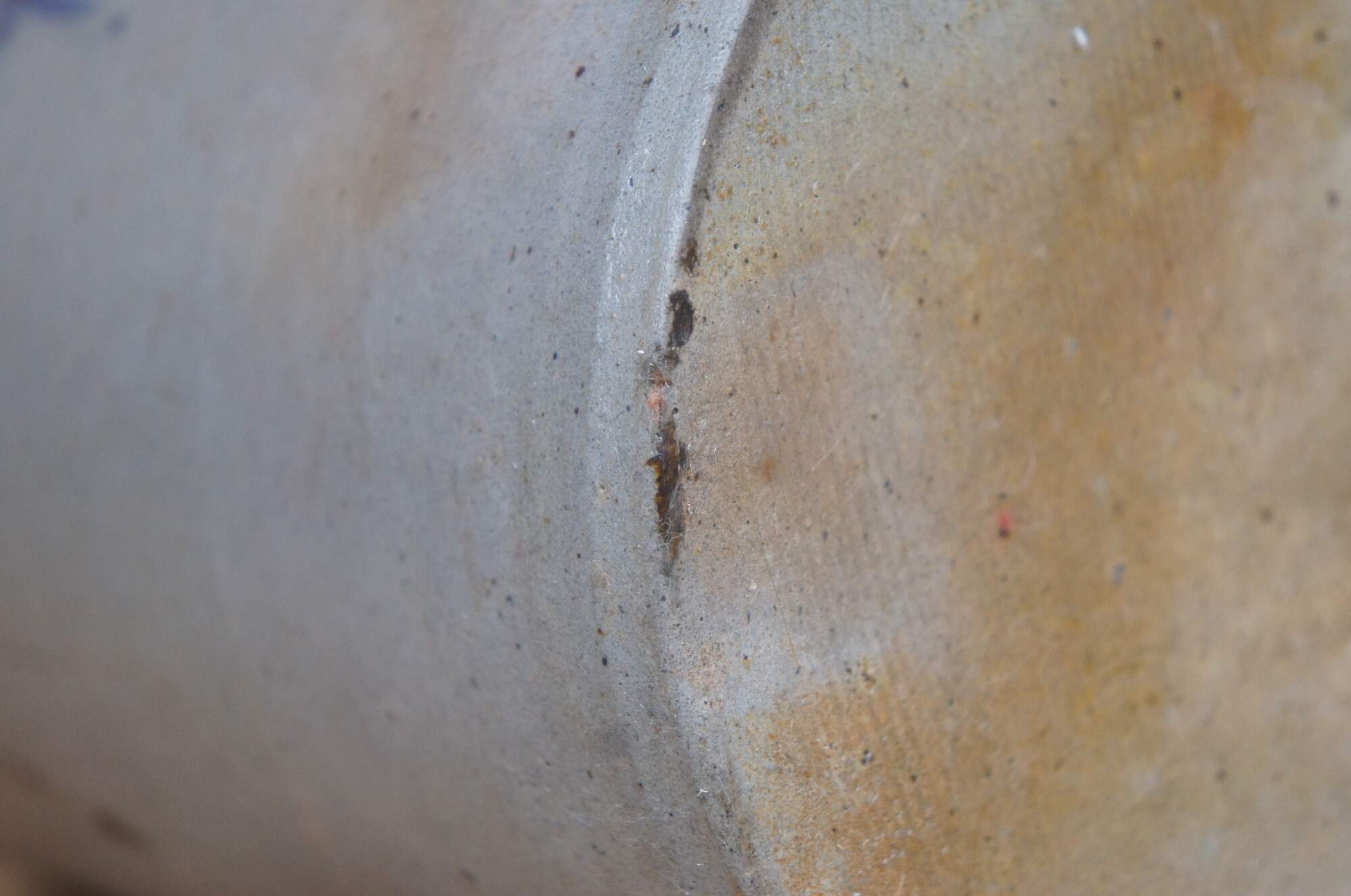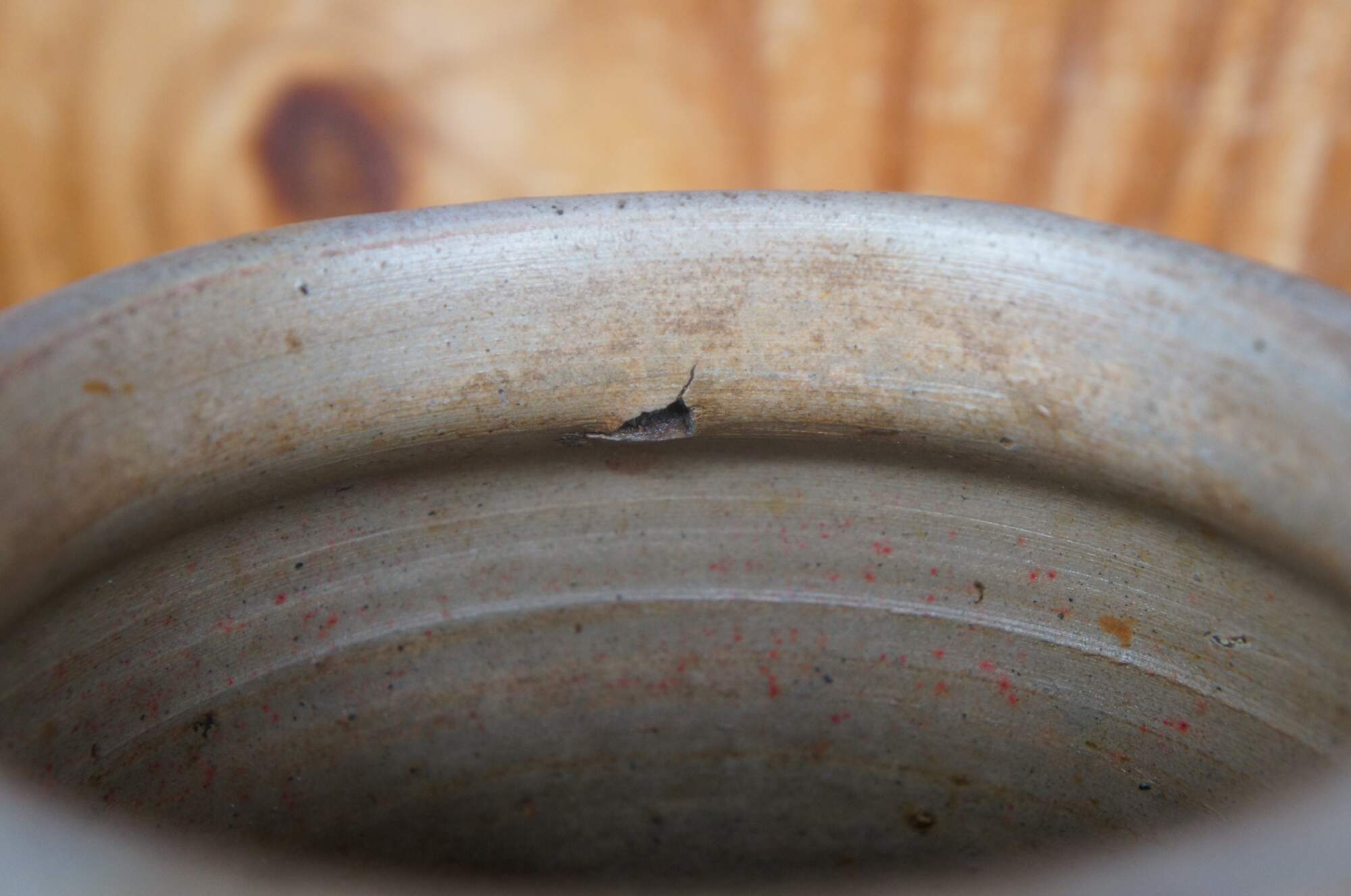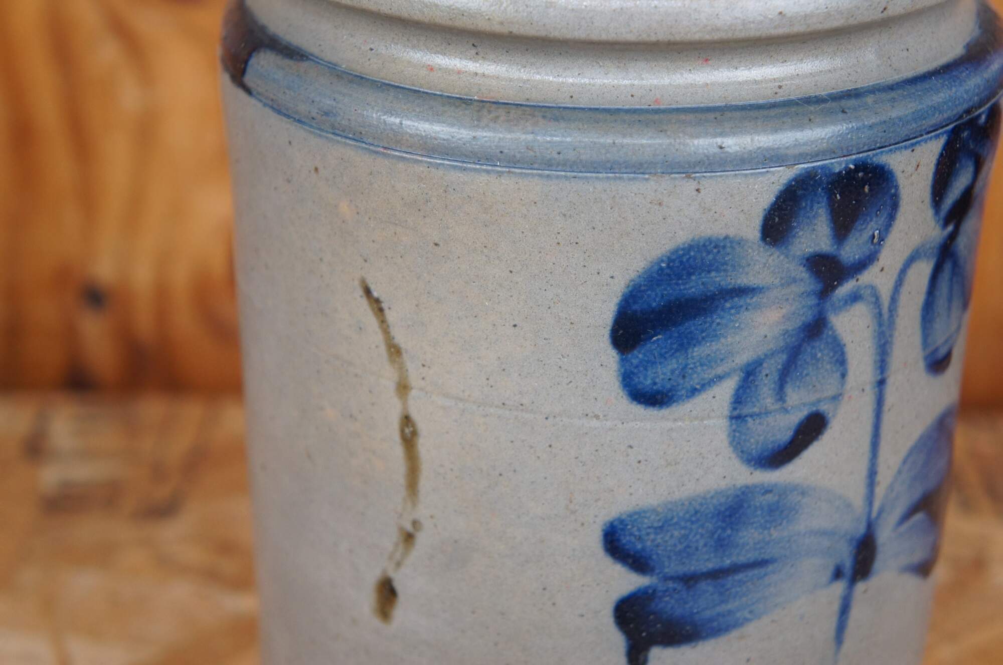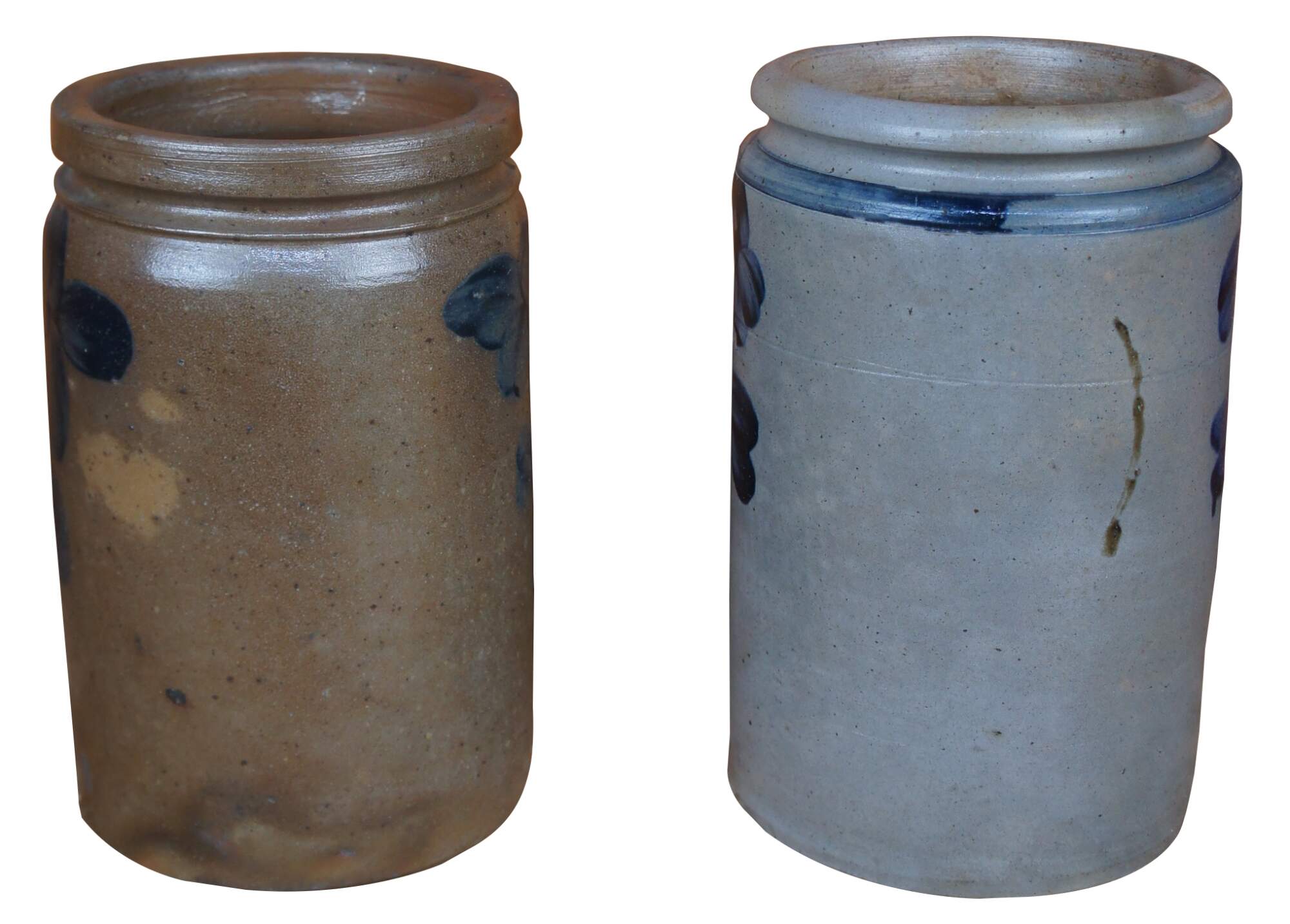 These two antique 19th century stoneware crocks are decorated with the signature double clover in cobalt blue. Made by Peter Herrmann.