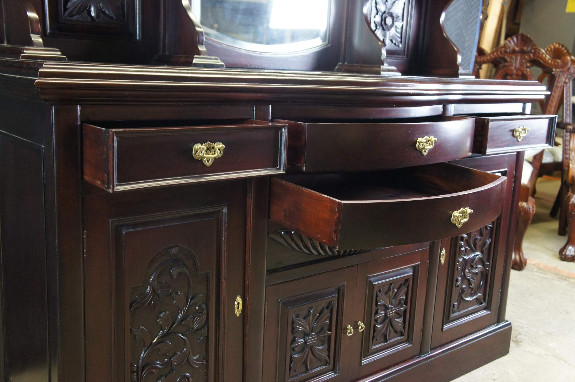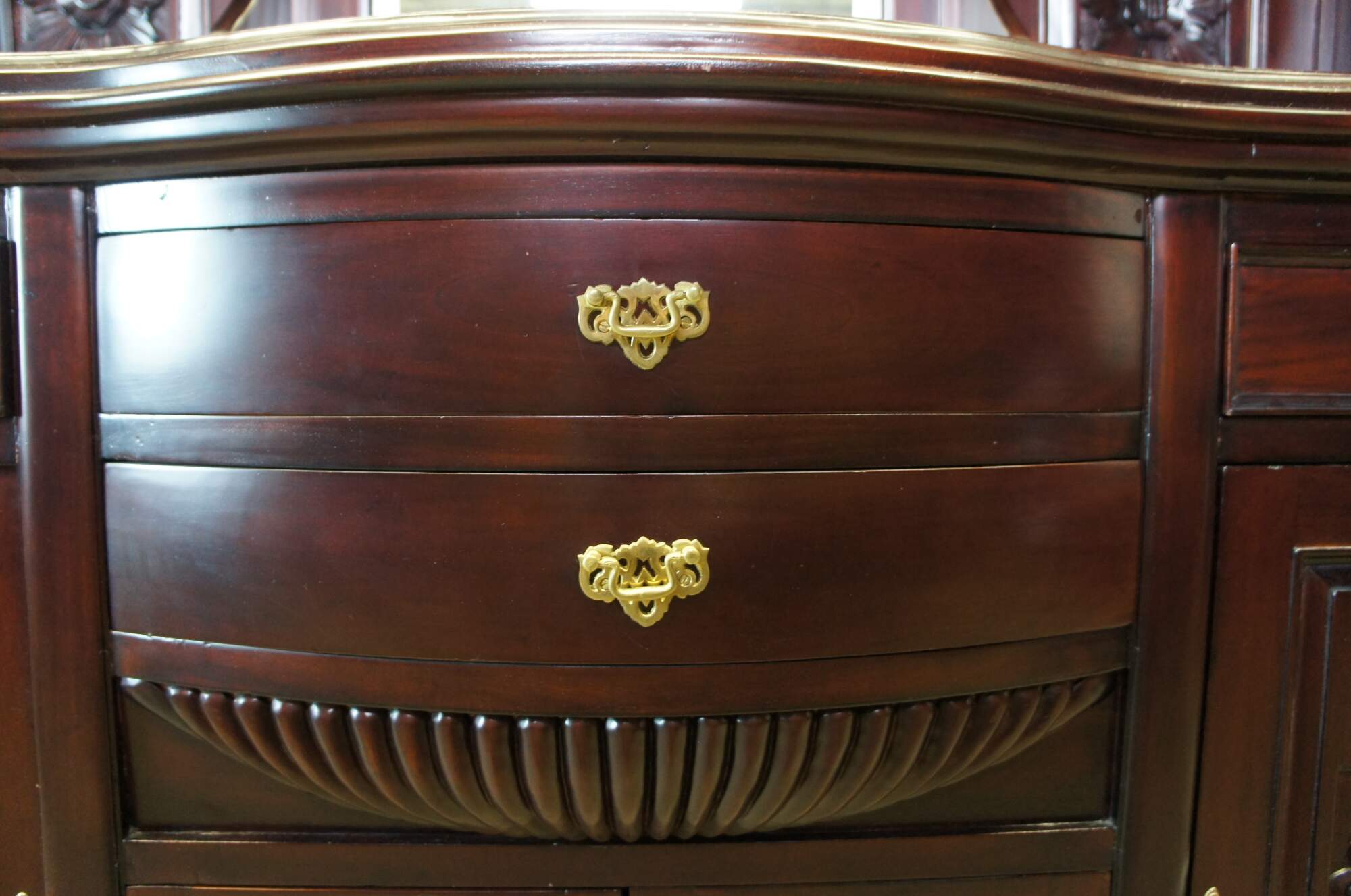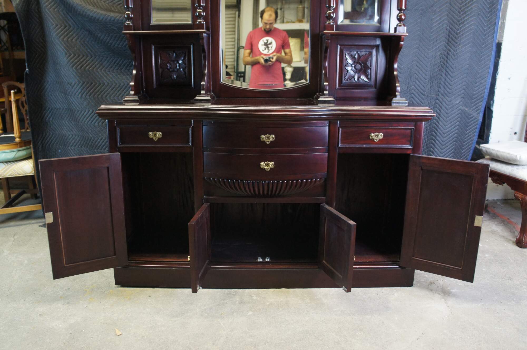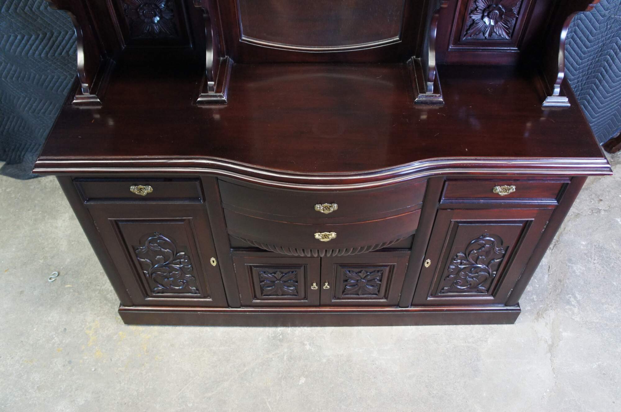 Victorian Revival Buffet and Hutch, circa 1980s. Made from mahogany with a bowfront, 4 dovetailed drawers and lower cabinets for storage. Hutch features beveled mirrors and four full columns with ribbed accents leading to shelves. Includes foliate carving, medallions and gadrooning.