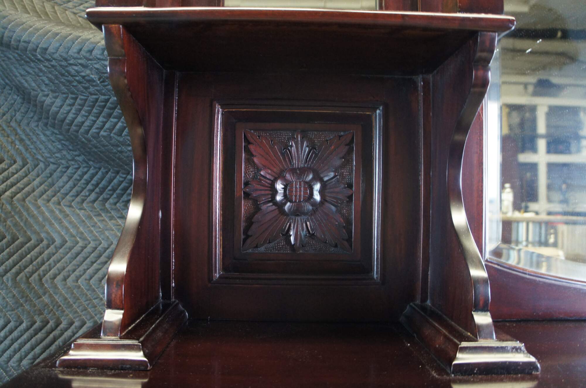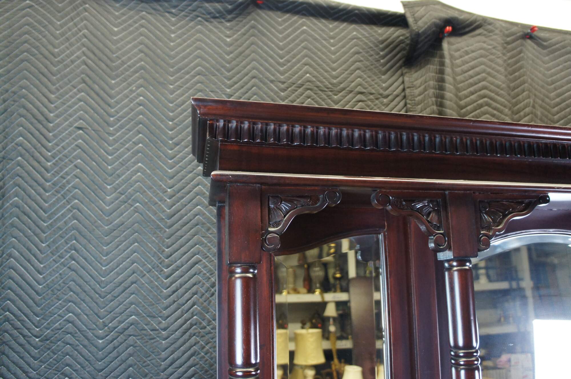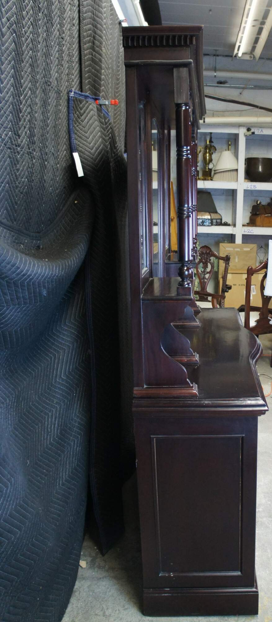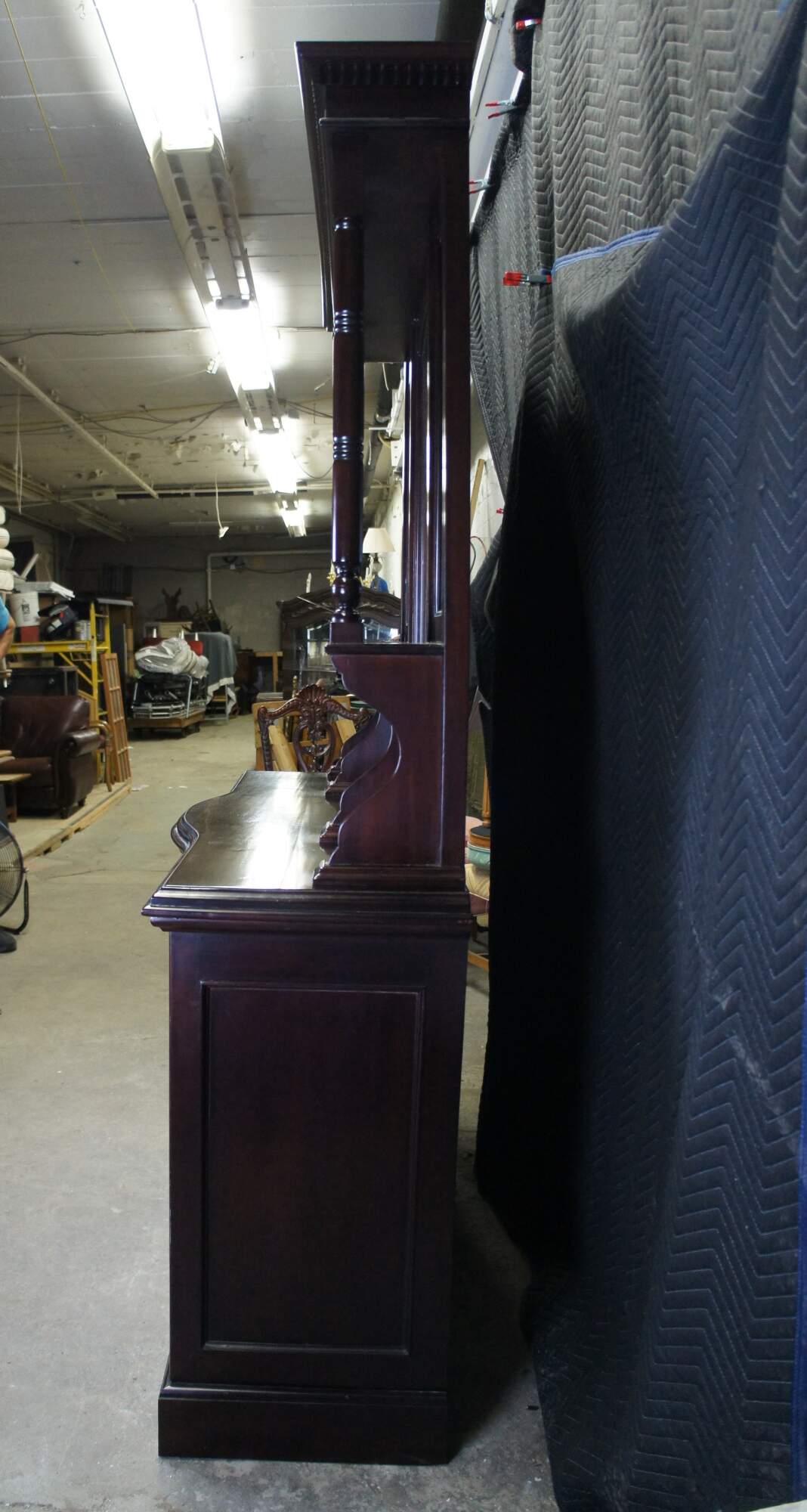 Victorian Revival Buffet and Hutch, circa 1980s. Made from mahogany with a bowfront, 4 dovetailed drawers and lower cabinets for storage. Hutch features beveled mirrors and four full columns with ribbed accents leading to shelves. Includes foliate carving, medallions and gadrooning.