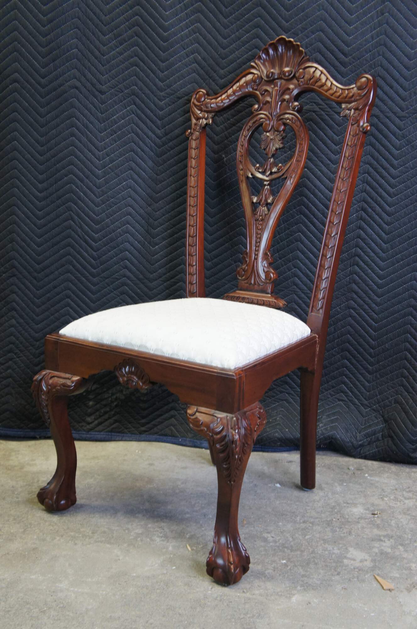 10 beautiful Chippendale style dining chairs, circa 1980s. Made from solid mahogany with a serpentine scalloped crest rail, pierced foliate splat with gadrooned shoe, carved stiles and acanthus carved arms Features fan upholstered slip seats and scallop carved front rails. The chairs are supported by cabriole legs with carved knees leading to Philadelphia ball and claw feet with straight legs along the back.
