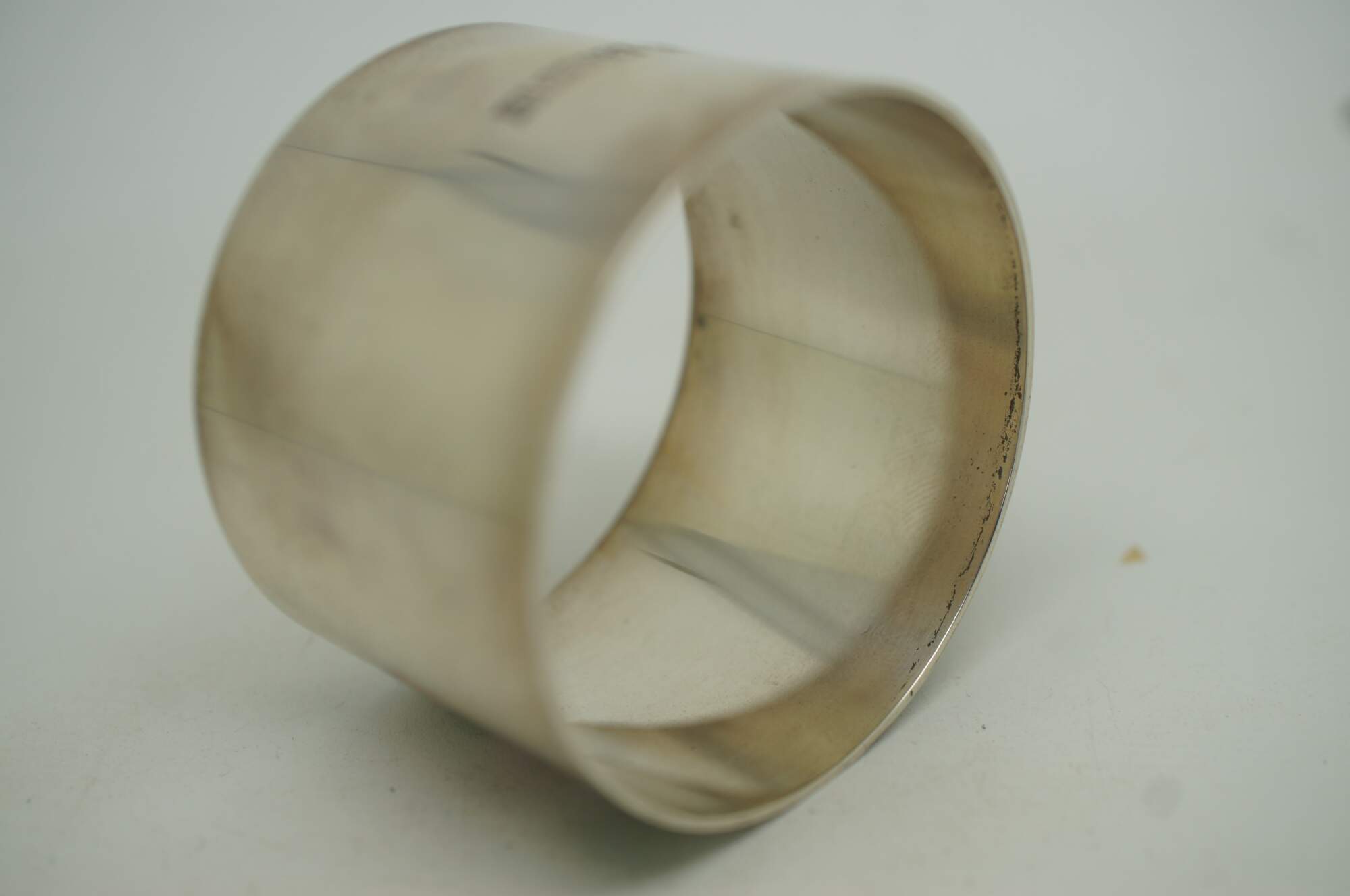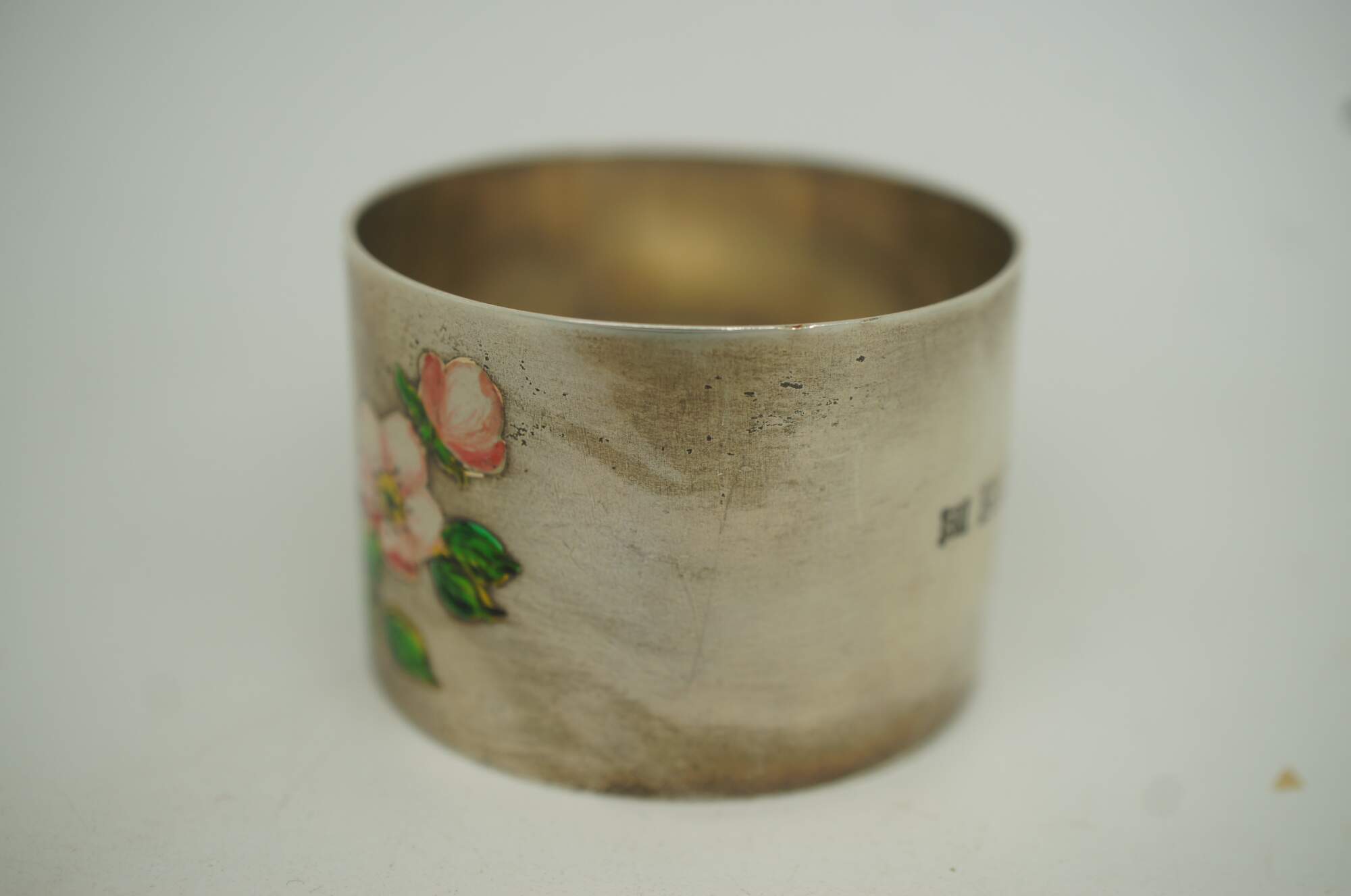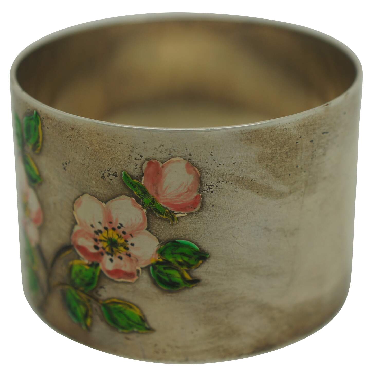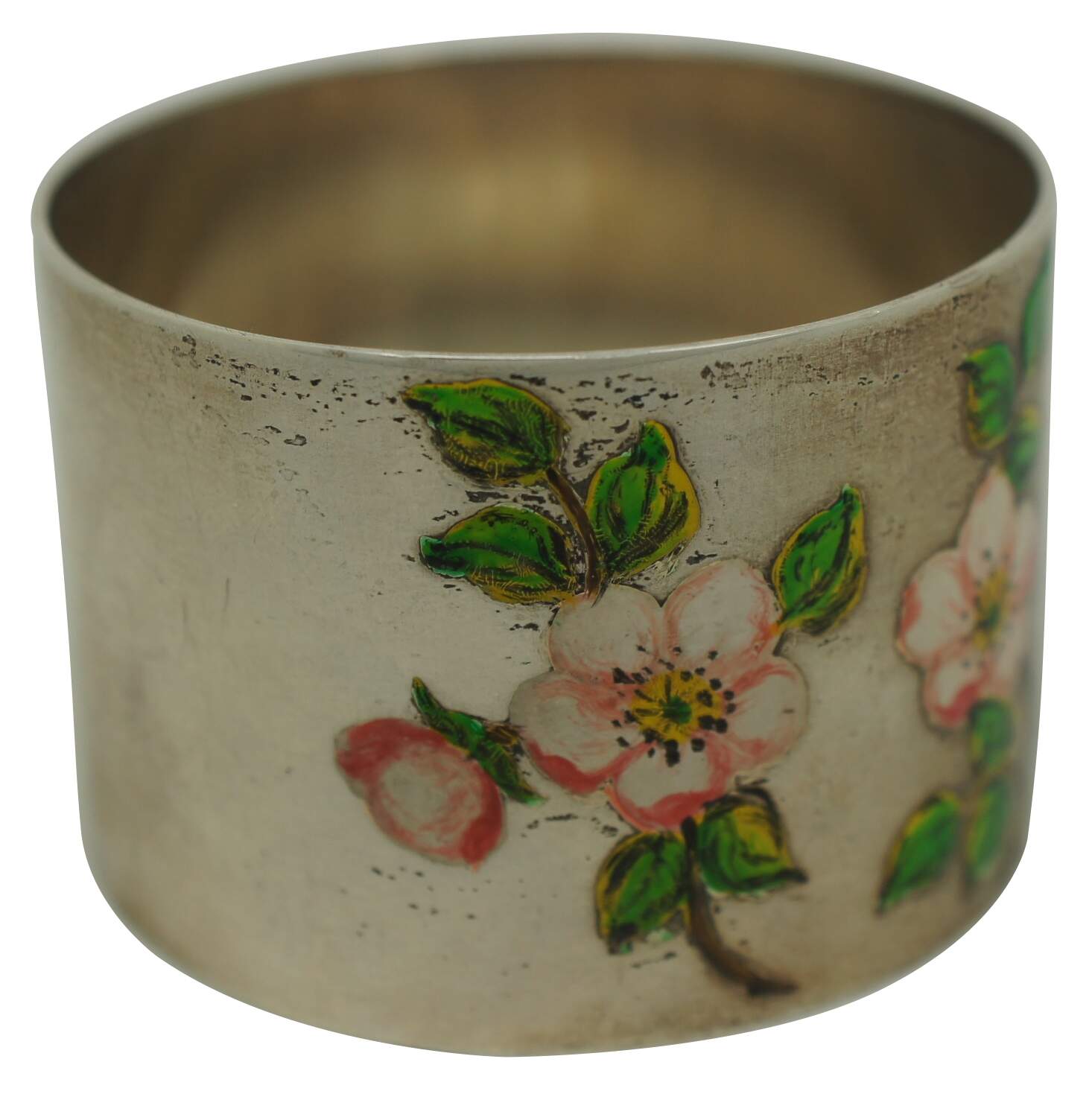 Vintage British sterling silver napkin ring circa 1960s-1970s decorated with enamel painted cherry blossoms and leaves. Marked with the Birmingham anchor, lion and a date letter V. Maker’s mark reads RII.
