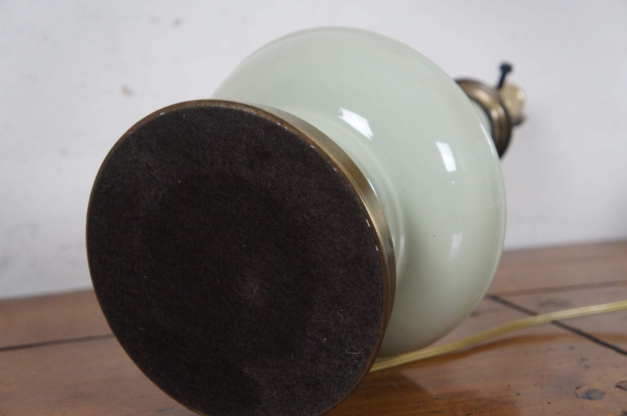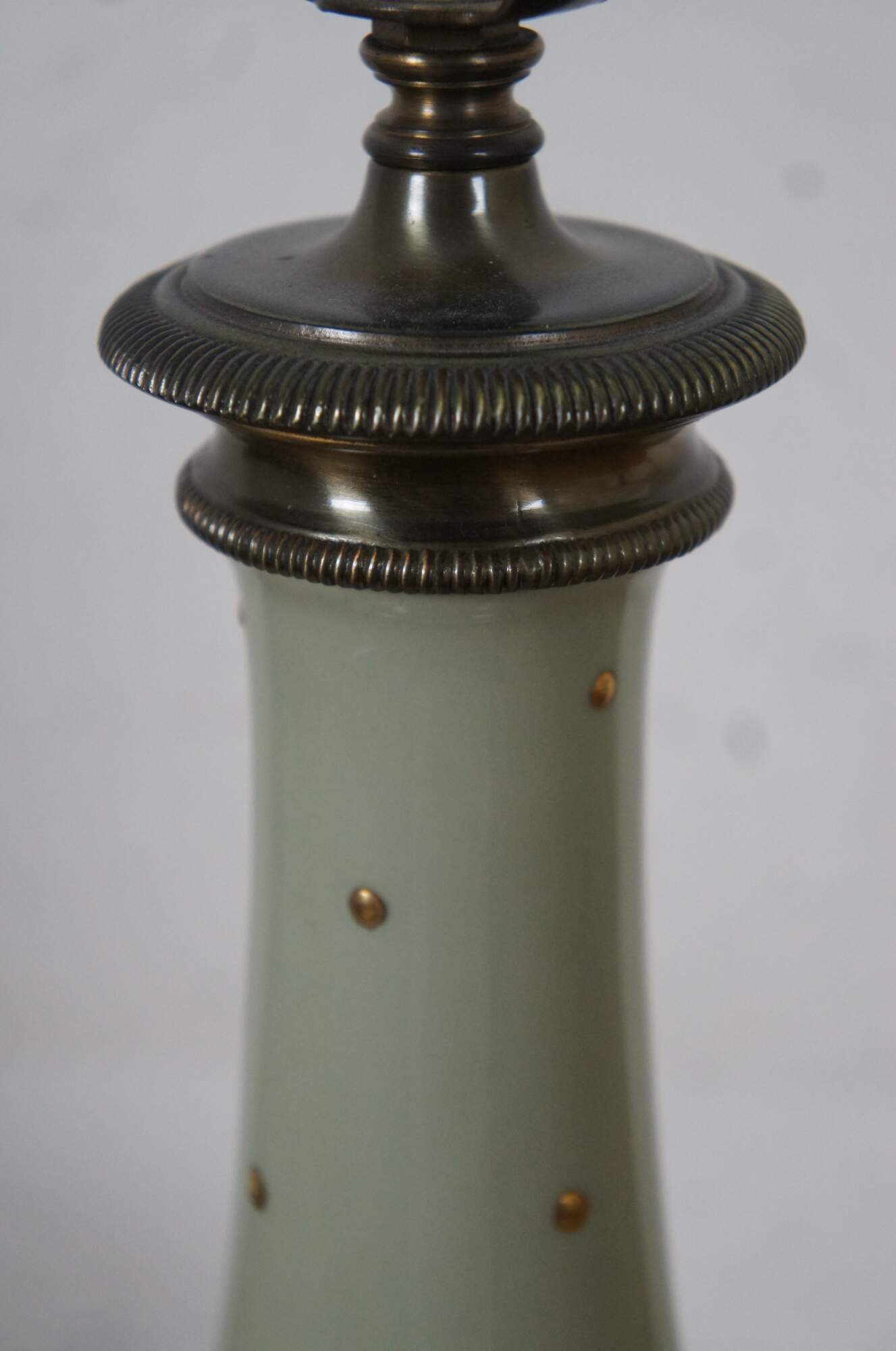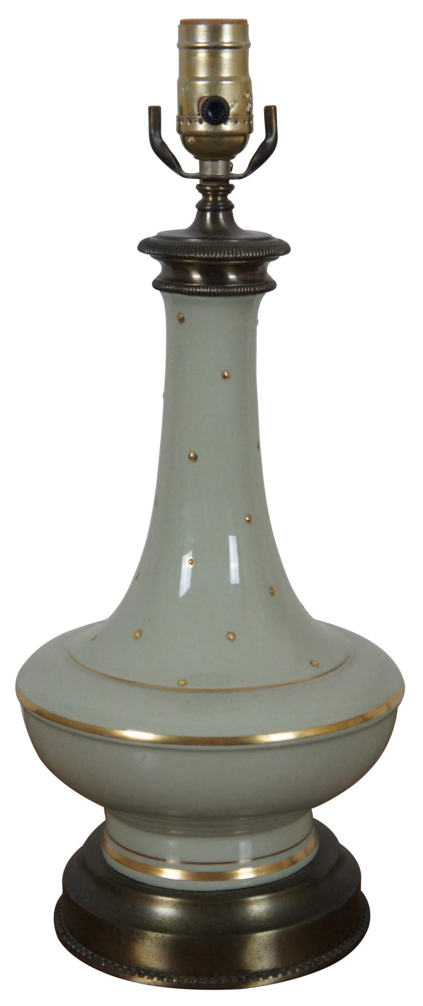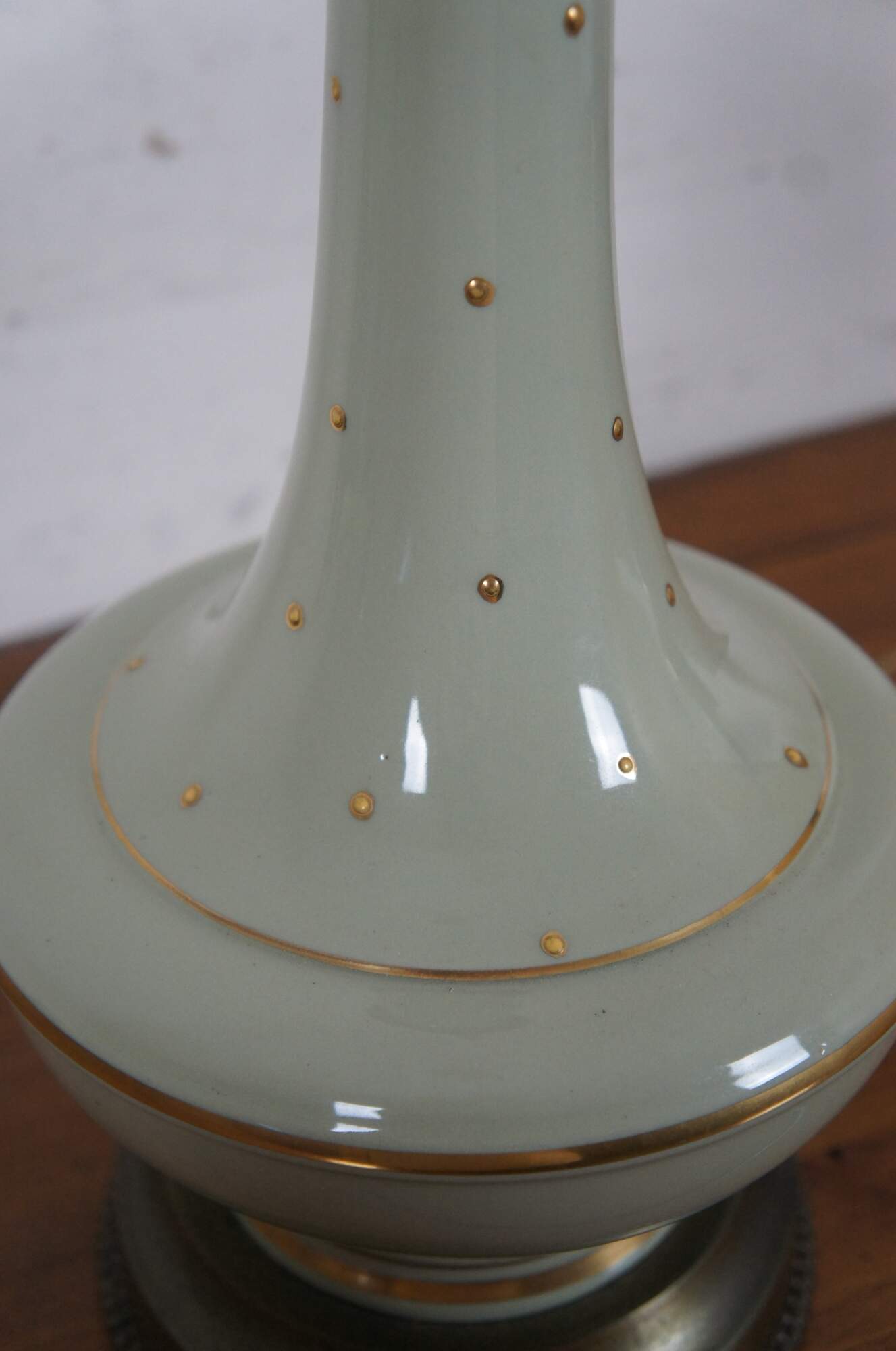Set of two mid century Kichler sage green porcelain table lamps with gilded spots and brass base. Includes white shades.