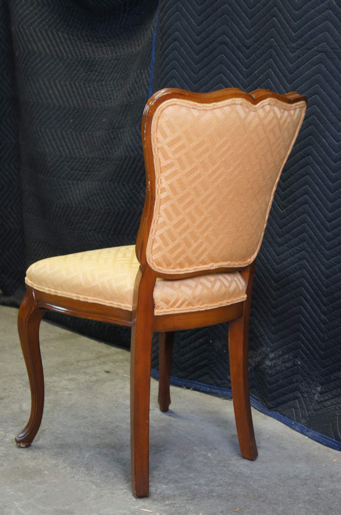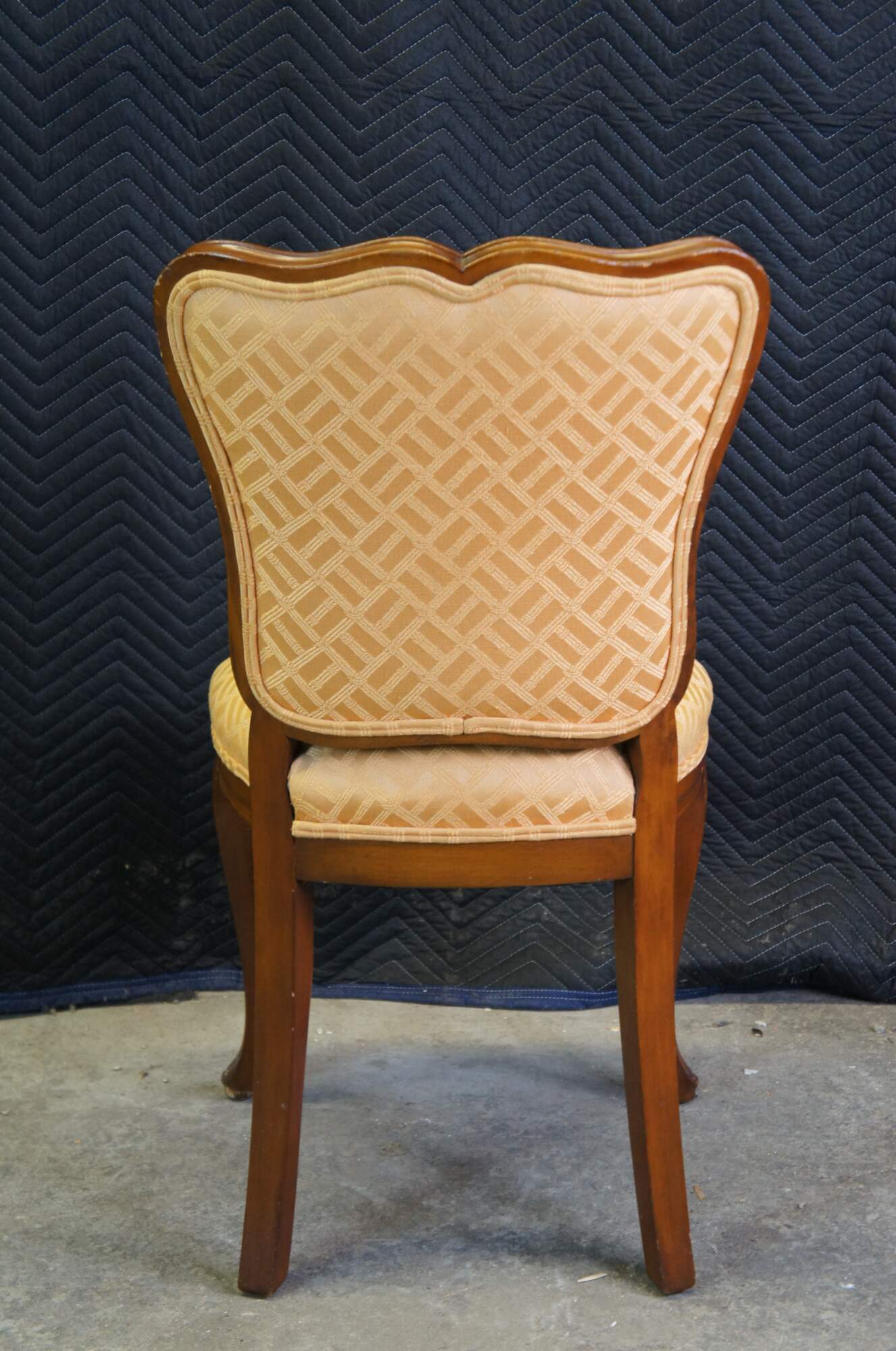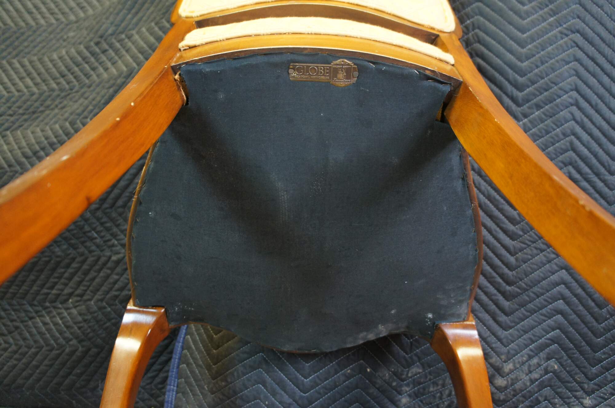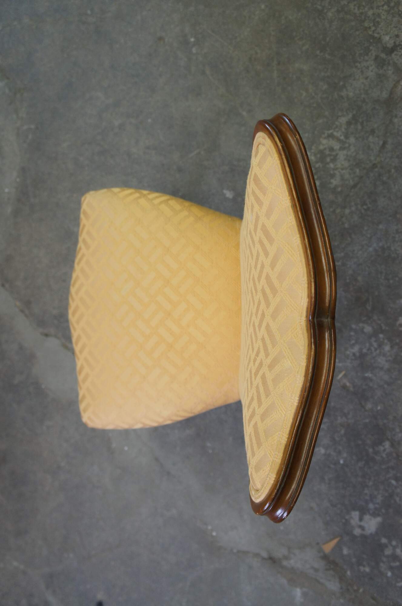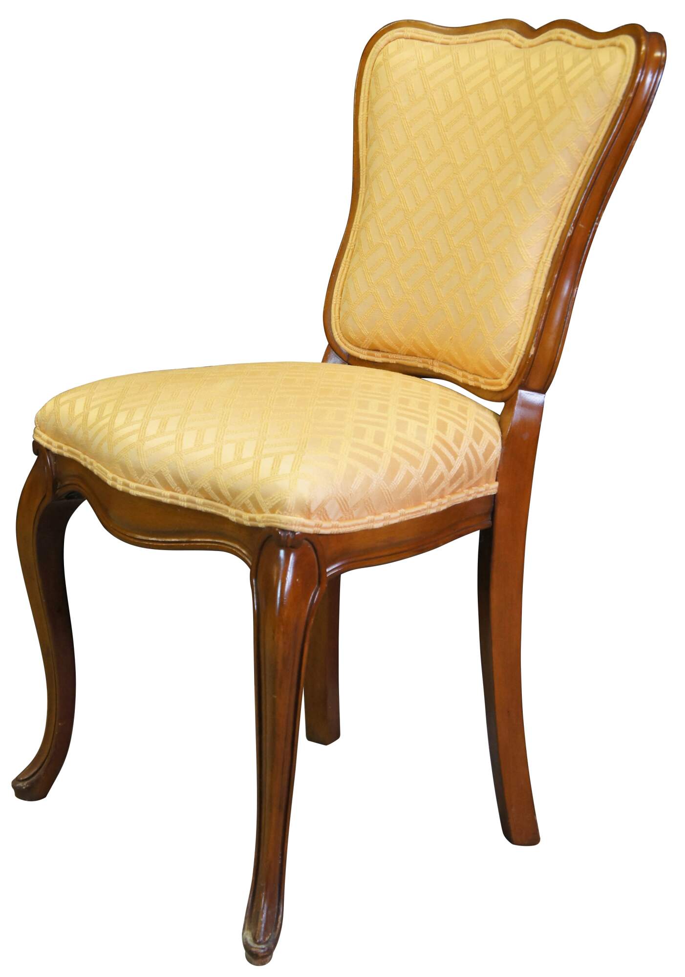 1950s Globe Furniture Colony Court Accent Chair. French inspired with walnut finish. Features a serpentine crest rail, gold bambook design fabric and cabriole legs. Globe Furniture opened in 1906 and operated out of Highpoint North Carolina.