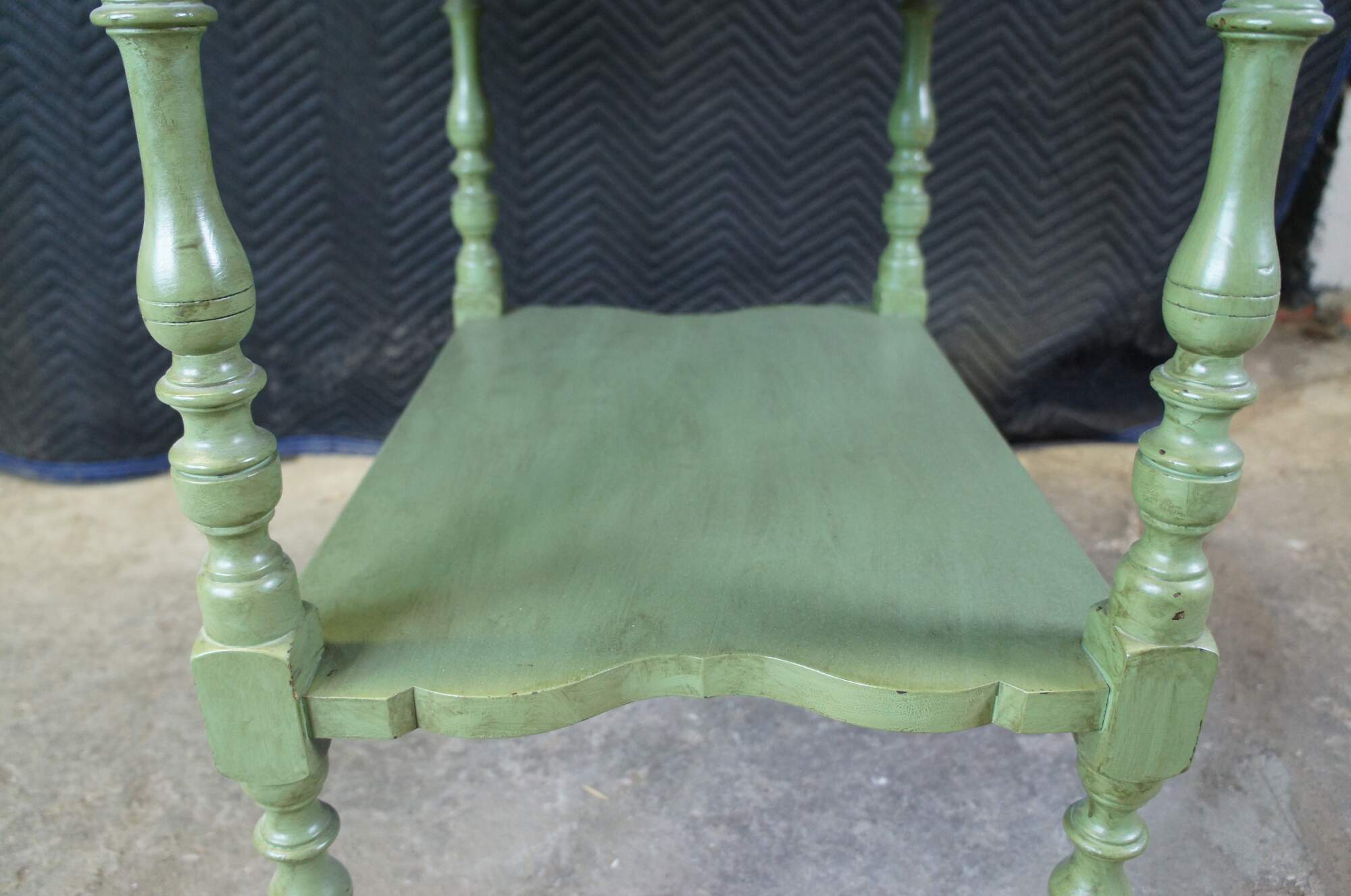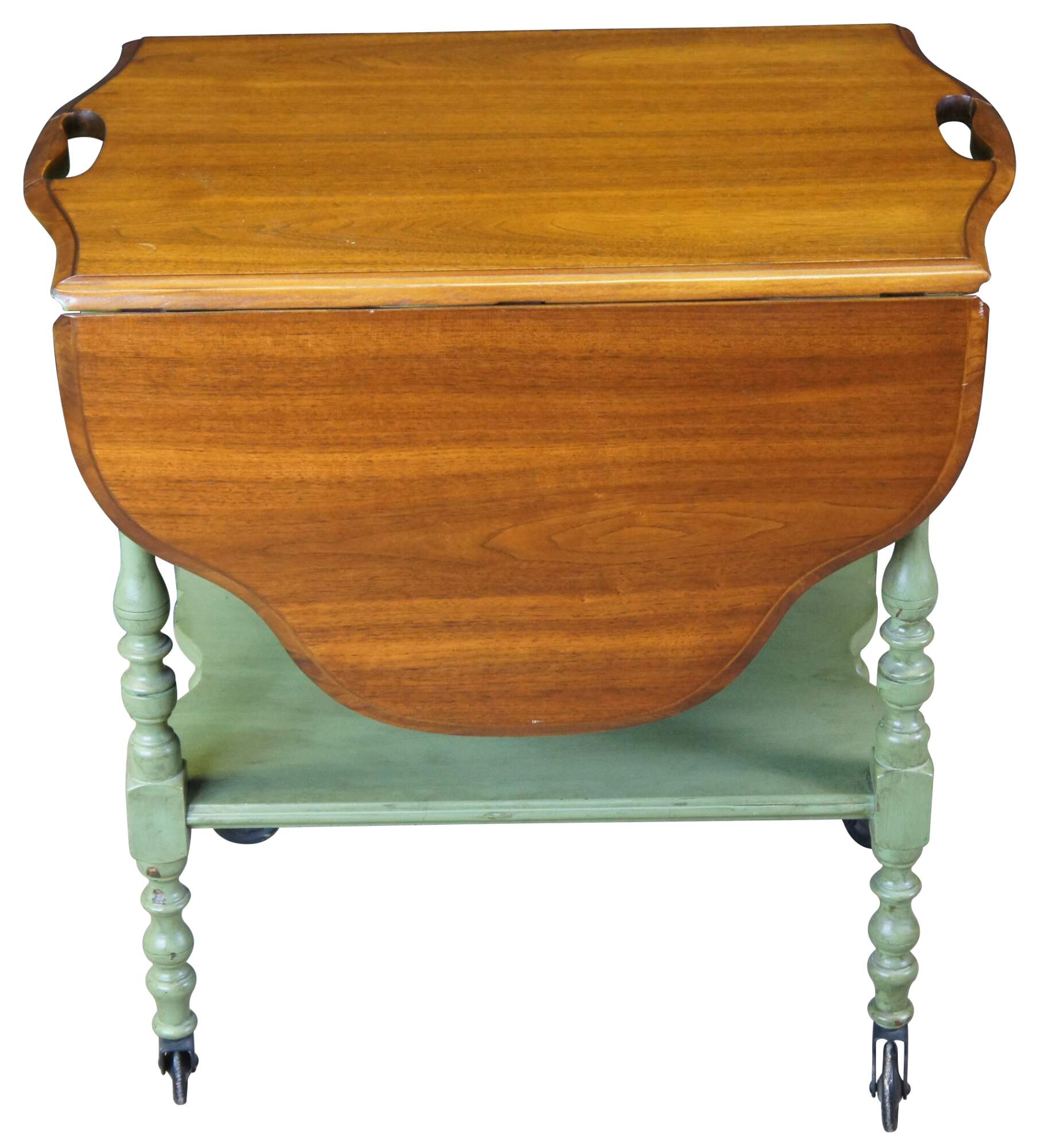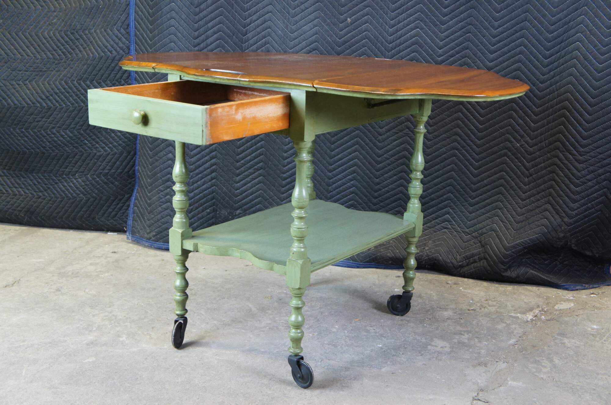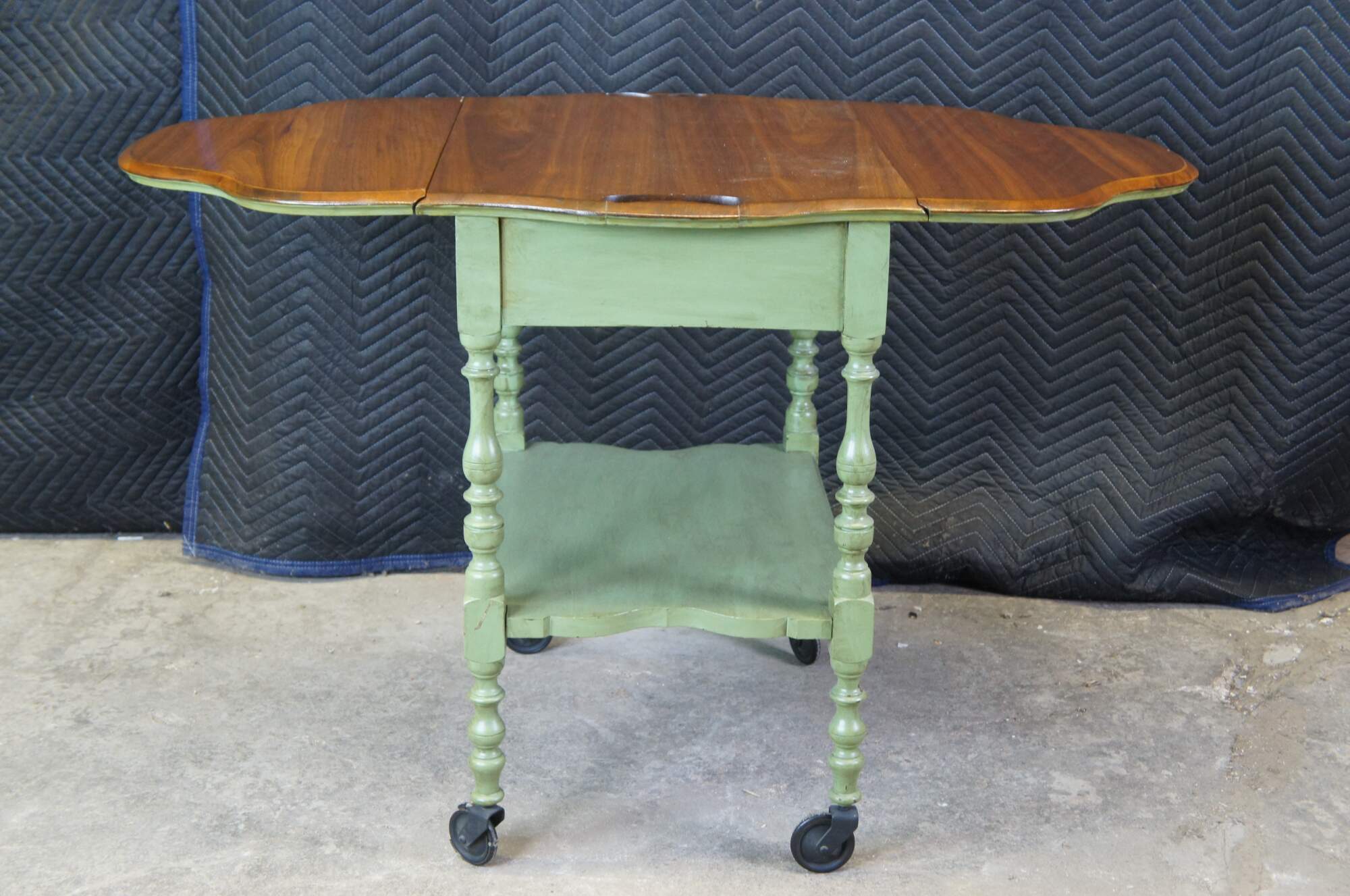 French Country walnut bar cart by Robert W Irwin Furniture Company. Features a serpentine drop leaf top, central drawer and turned legs leading to lower shelf and casters. Base is finished in green. Circa 1928-1940