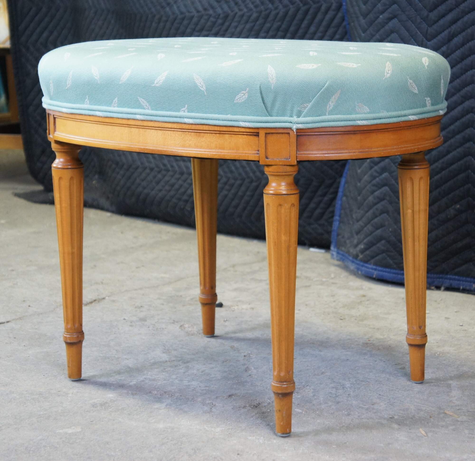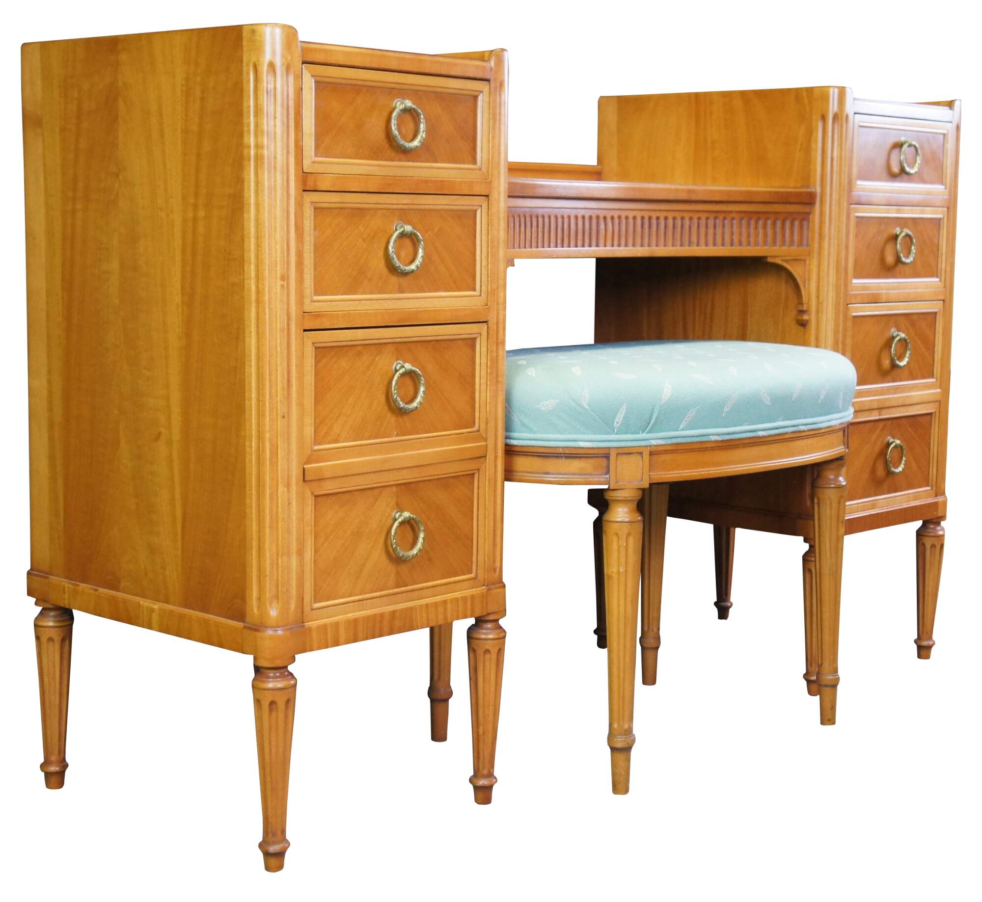An elegant dressing table with pouf/stool by Robert W. Irwin Furniture Company. Crafted from Satinwood in Louis XVI & Neoclassical styling. Features a rectangular form with shaped surface flanked by drawers. Includes inset tops, fluted and rounded stiles, ornate hardware and turned tapered arrow feet. The vanity is outfitted with a matching oval stool upholstered in a teal with leaf pattern. Circa 1928-1940.