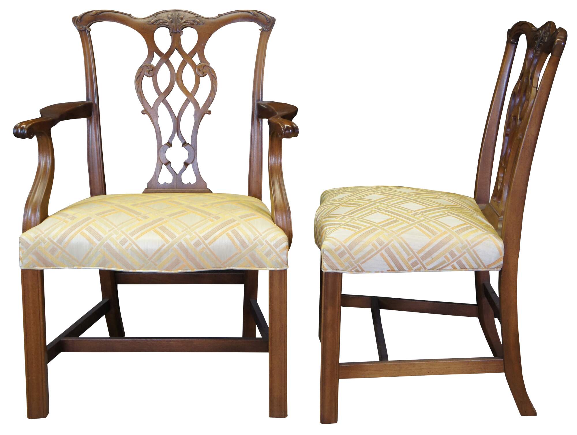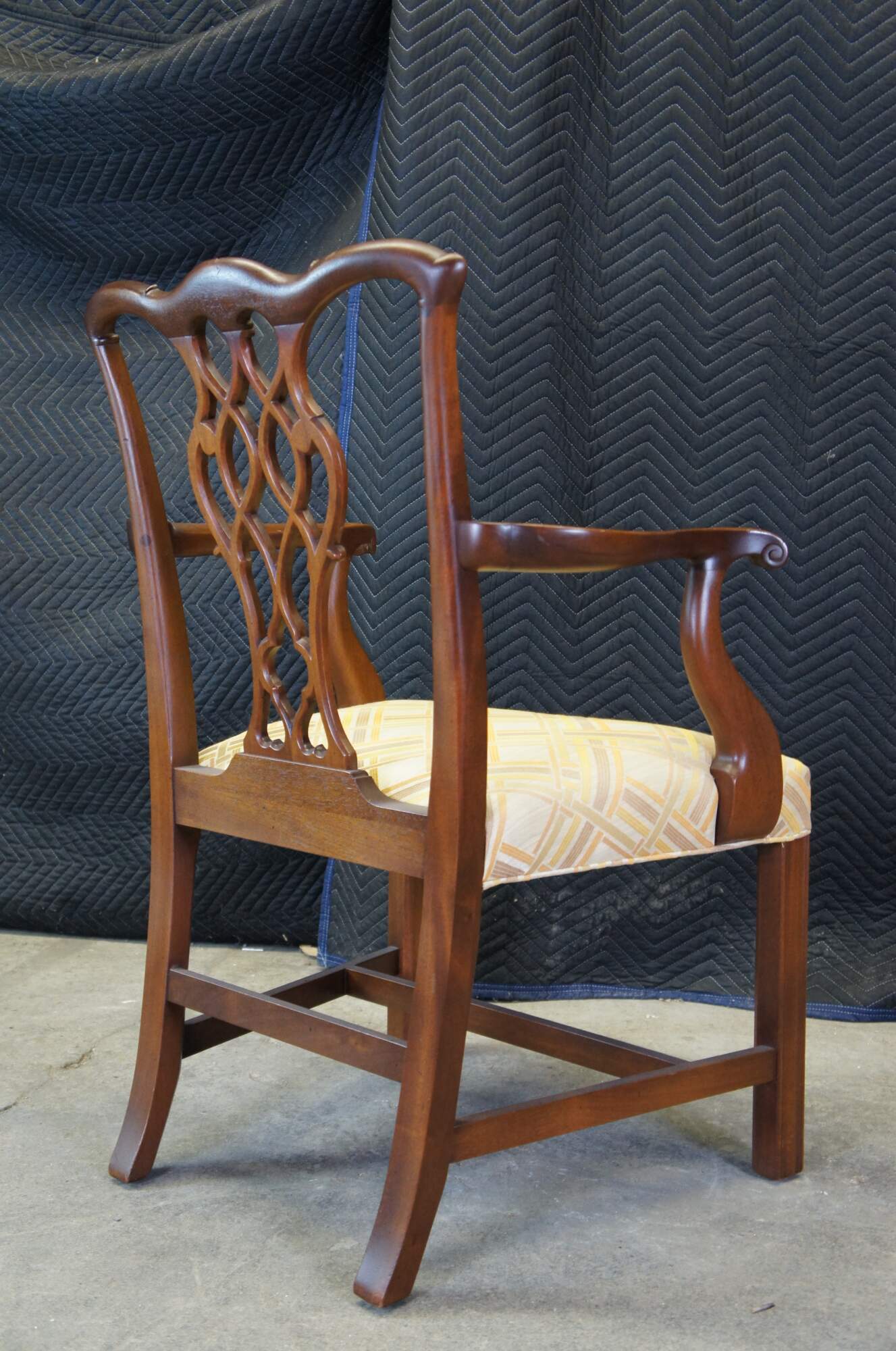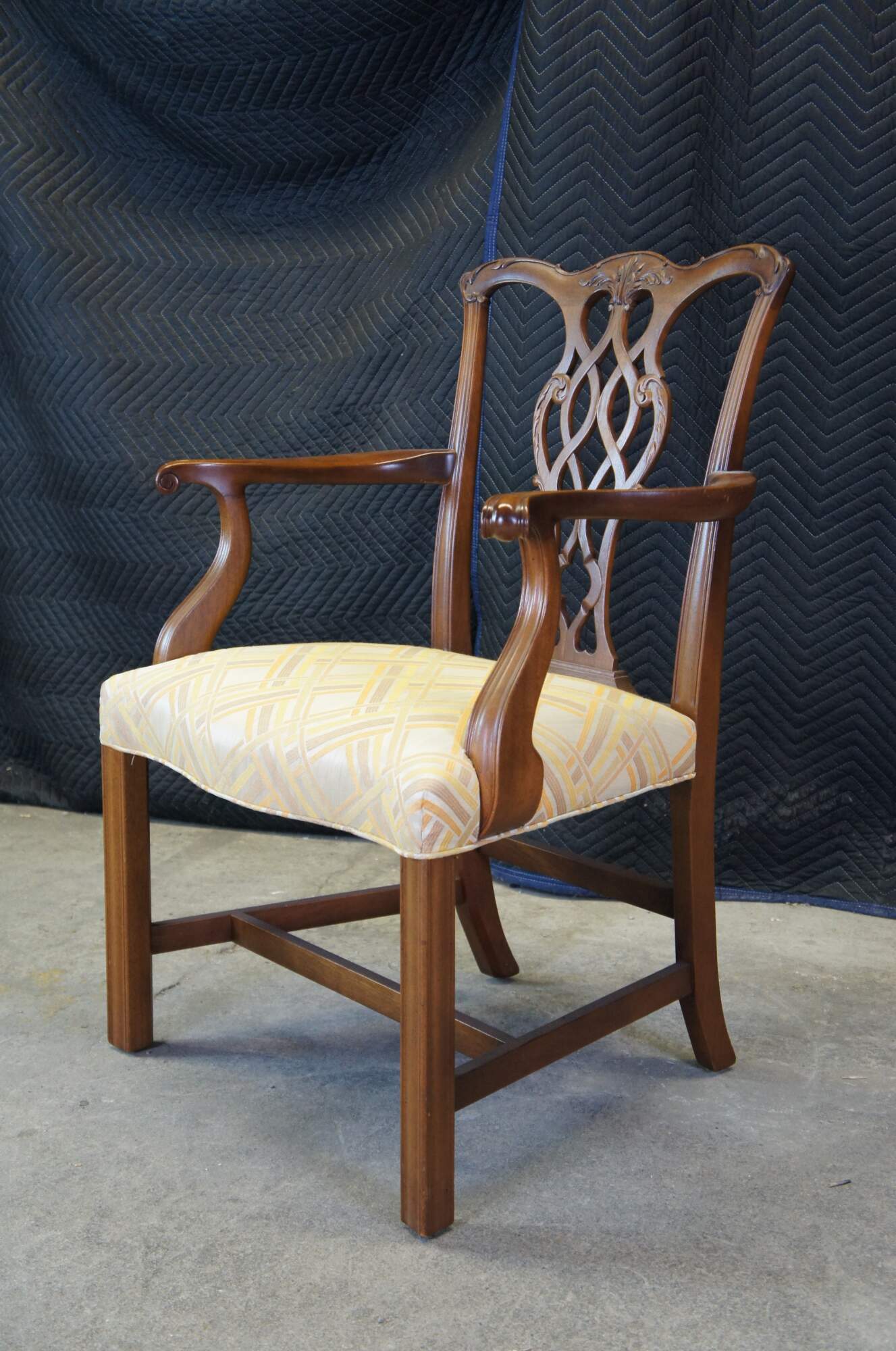 Six English Georgian or chippendale style mahogany dining chairs by Baker Furniture. Features a medium brown finish, serpentine carved crest rail over pierced pretzel back and straight legs connected by an H stretcher. Upholstered in a yellow, brown and beige geometric crossing pattern.