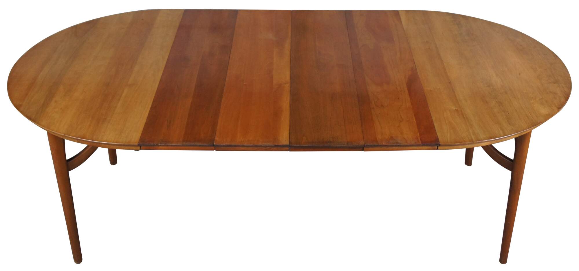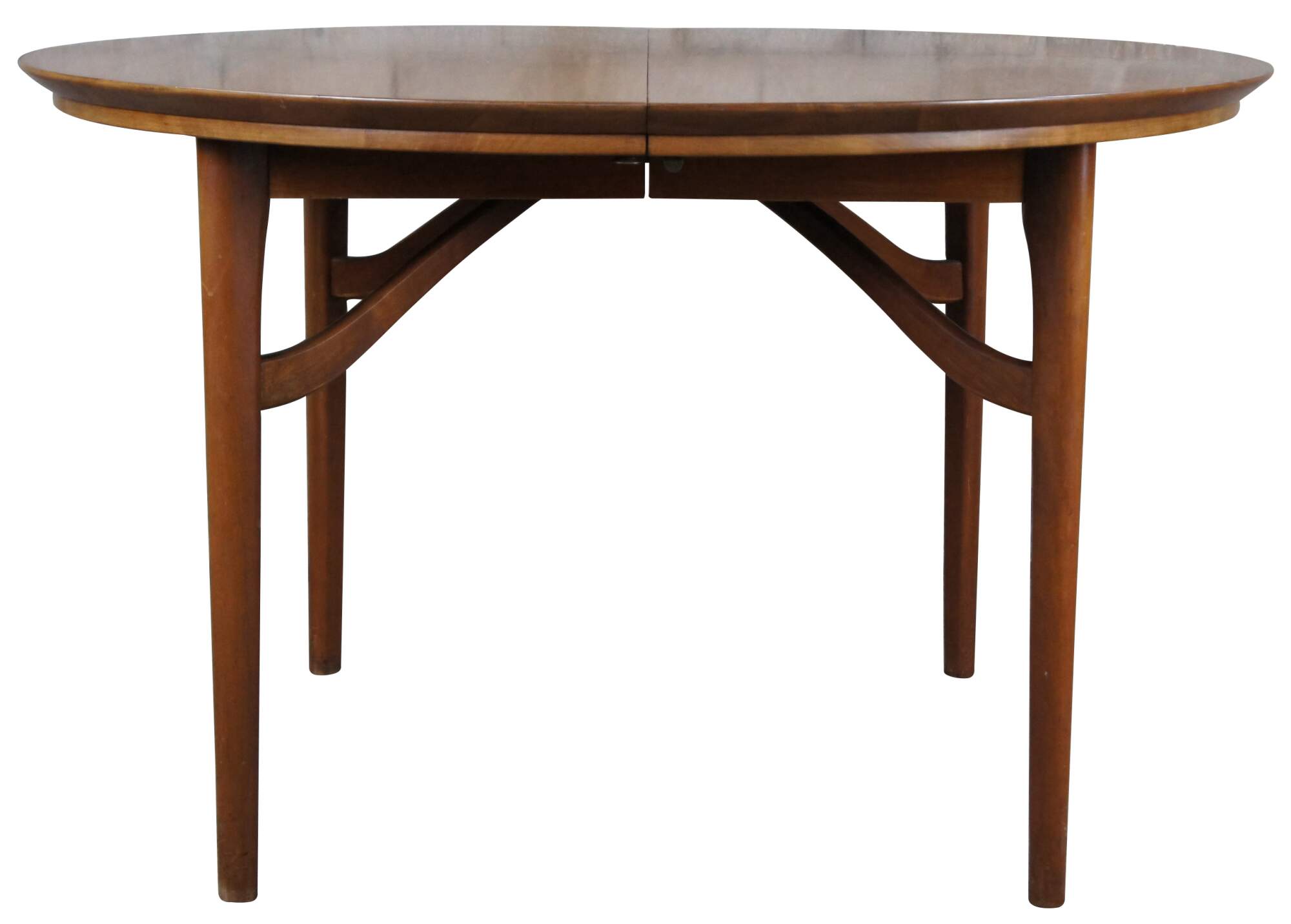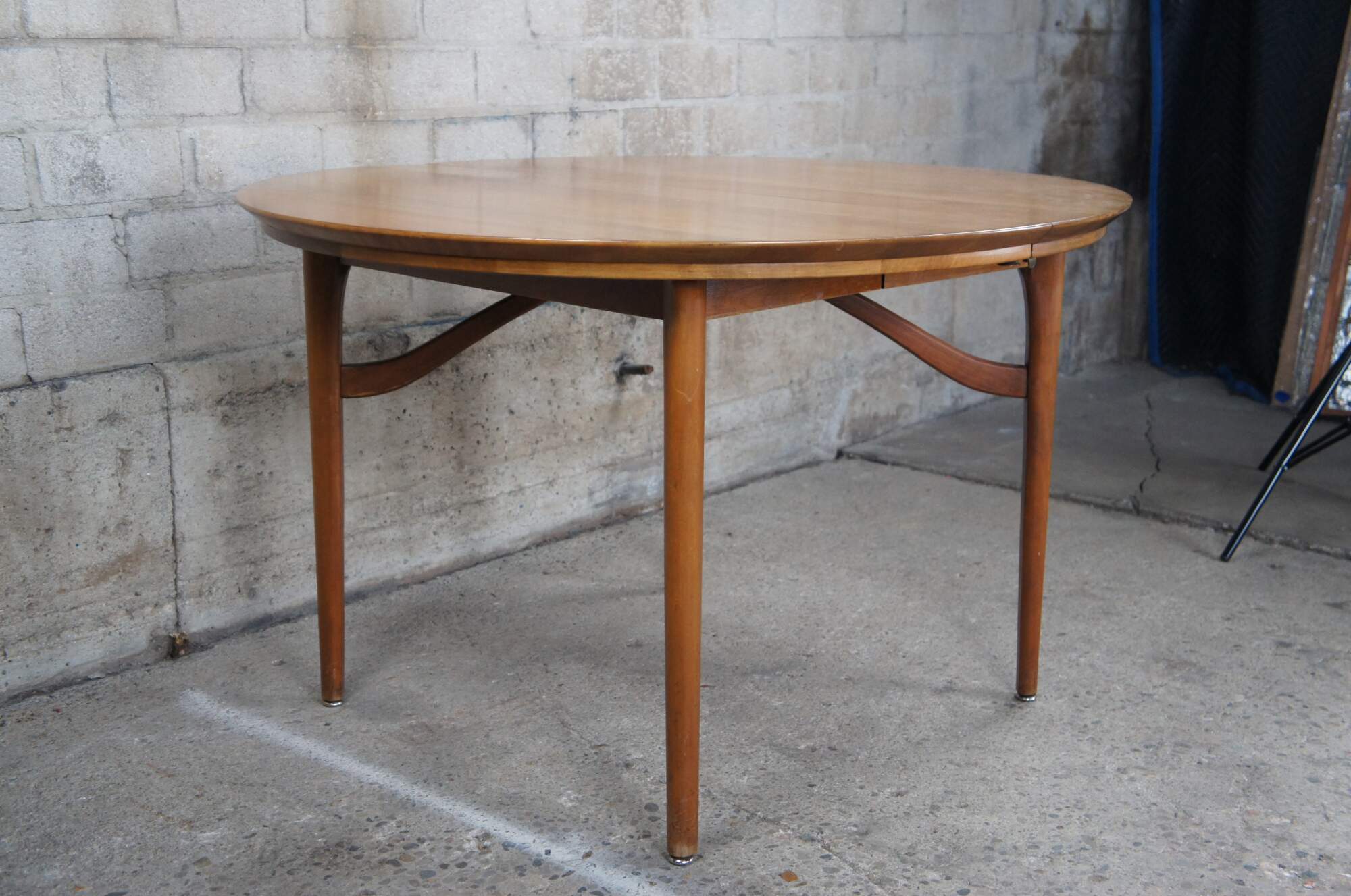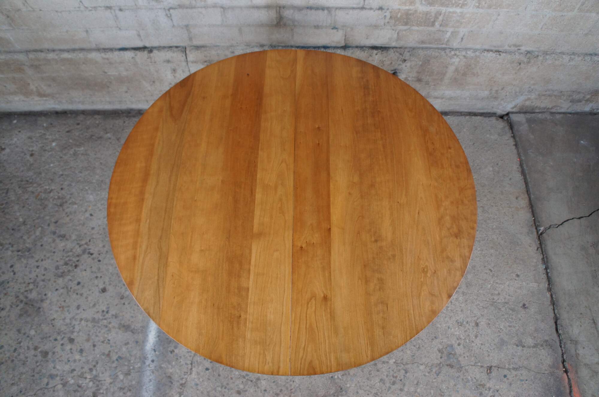 Statton Furniture mid century dining table. A round extendable form made from solid cherry with danish form. Sleek minimalist lines with a stunning wood grain. Great for use as a breakfast table or game table.