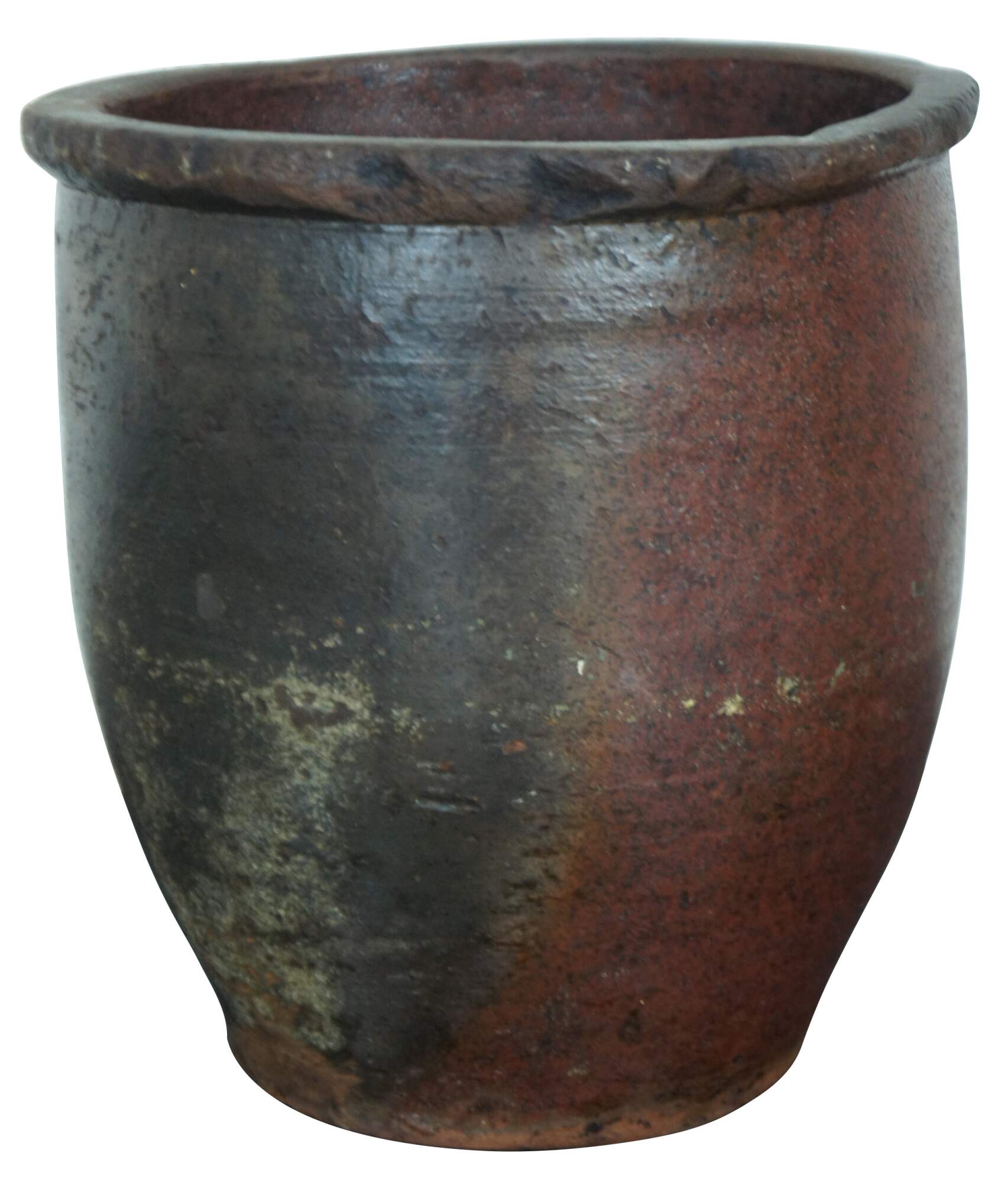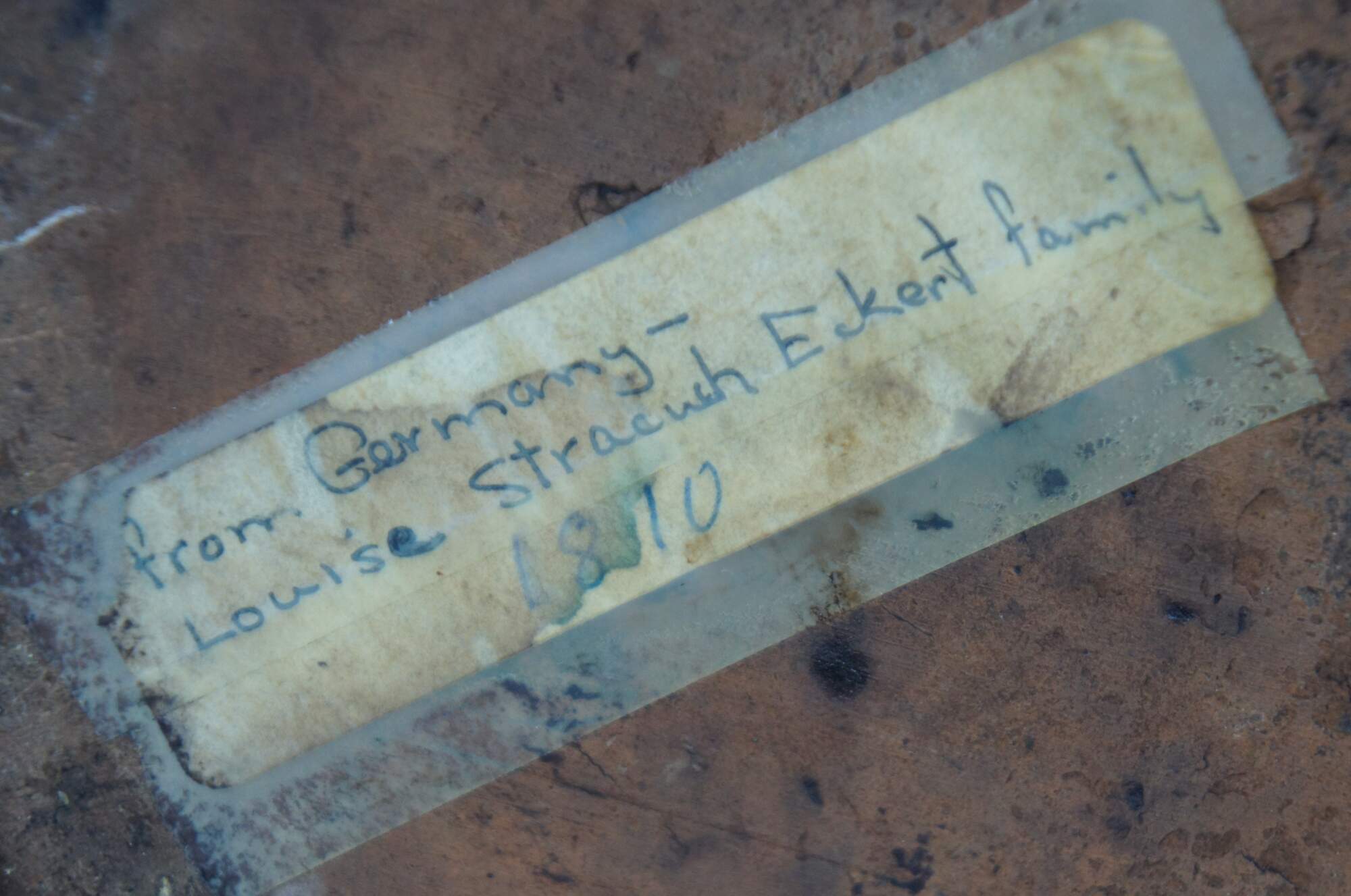 Antique early 19th century brown stoneware crock, labeled on base “from Germany – Louise Stracuch Eckert family 1810.” The Eckert Family came to America in 1872 from Prussia which is now part of Germany.