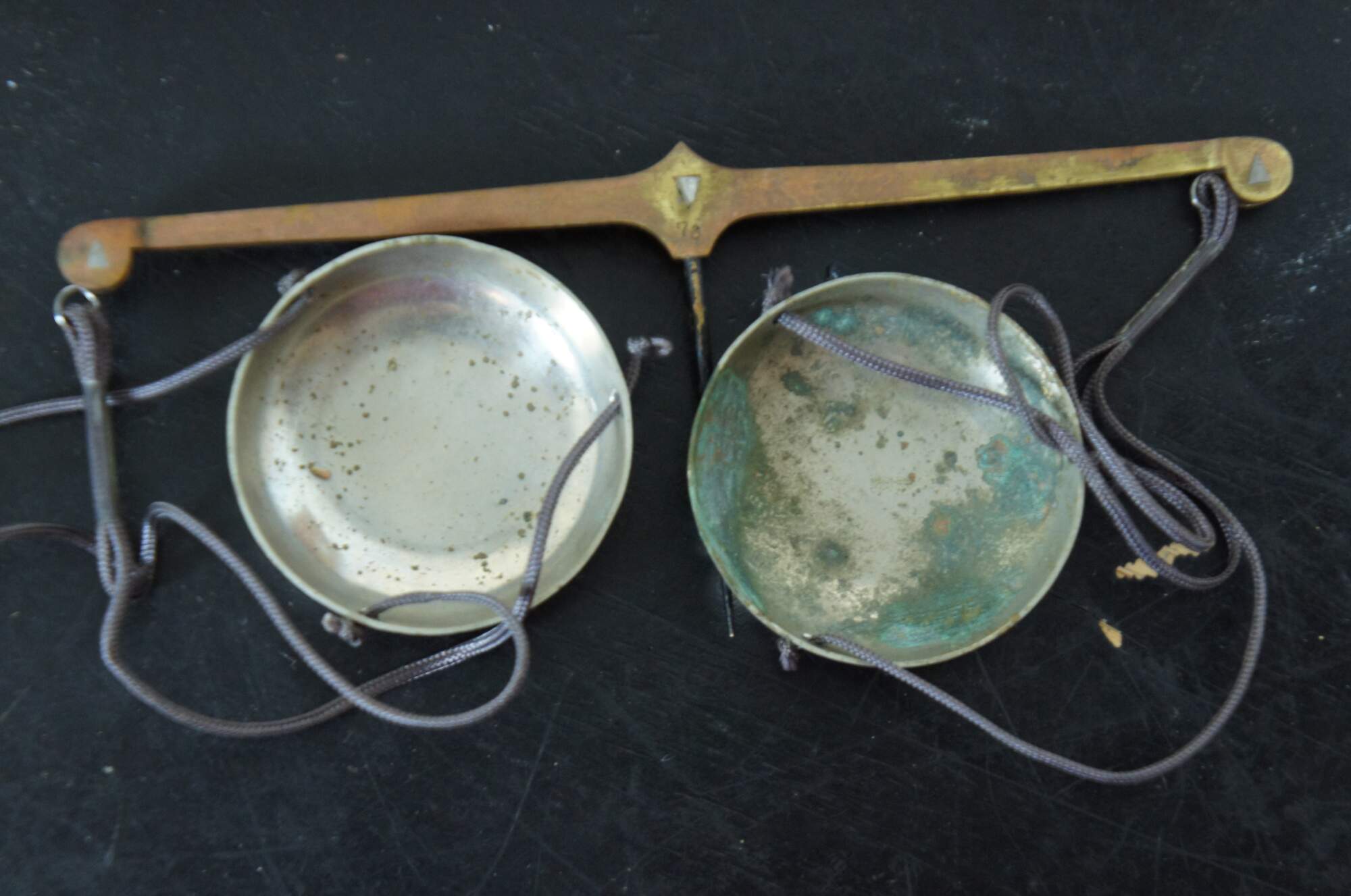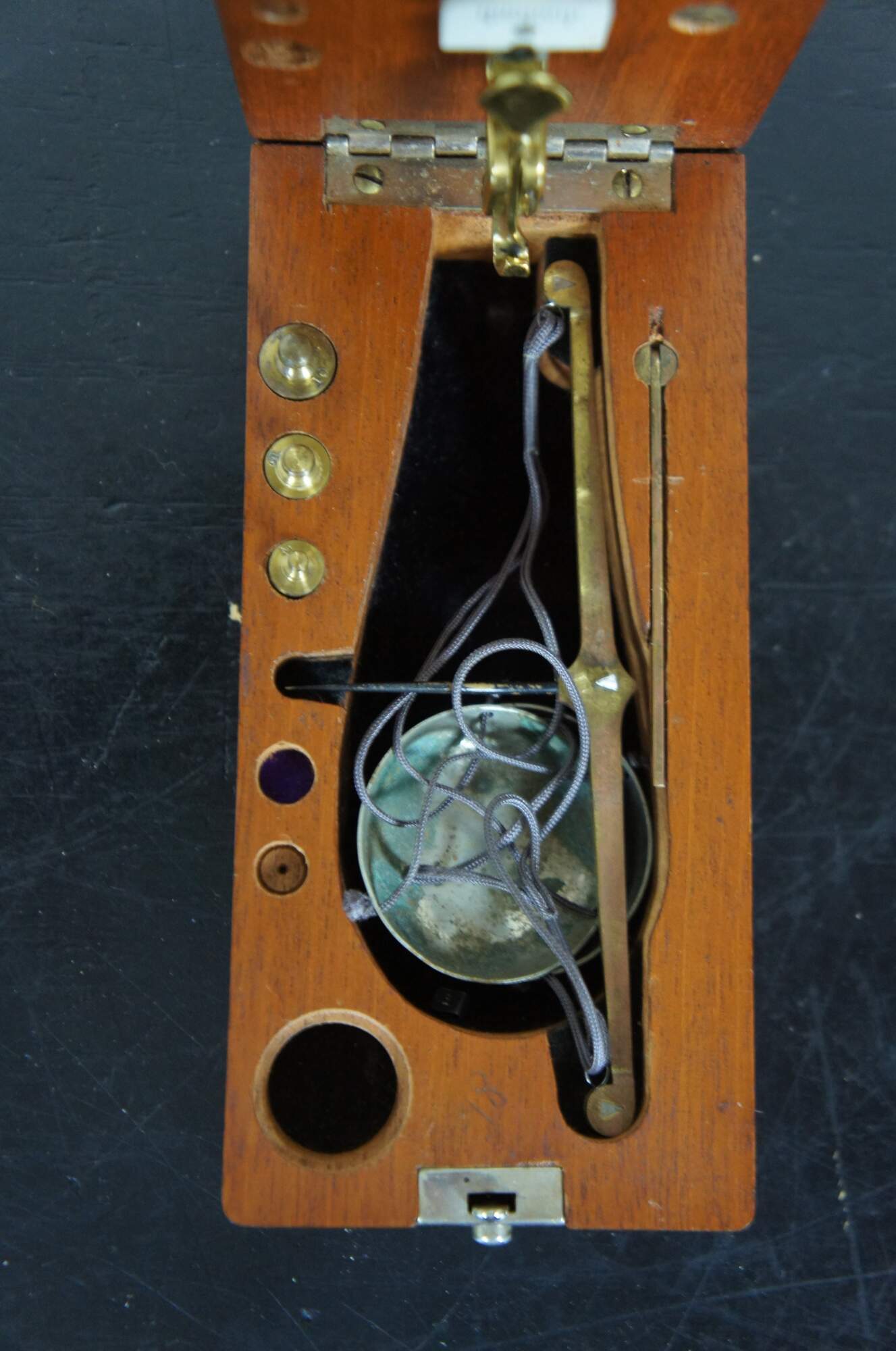 Vintage small Fisher Scientific Company apothecary balance in wooden case. Includes 2, 5, and 10 gram weights. circa mid 20th century