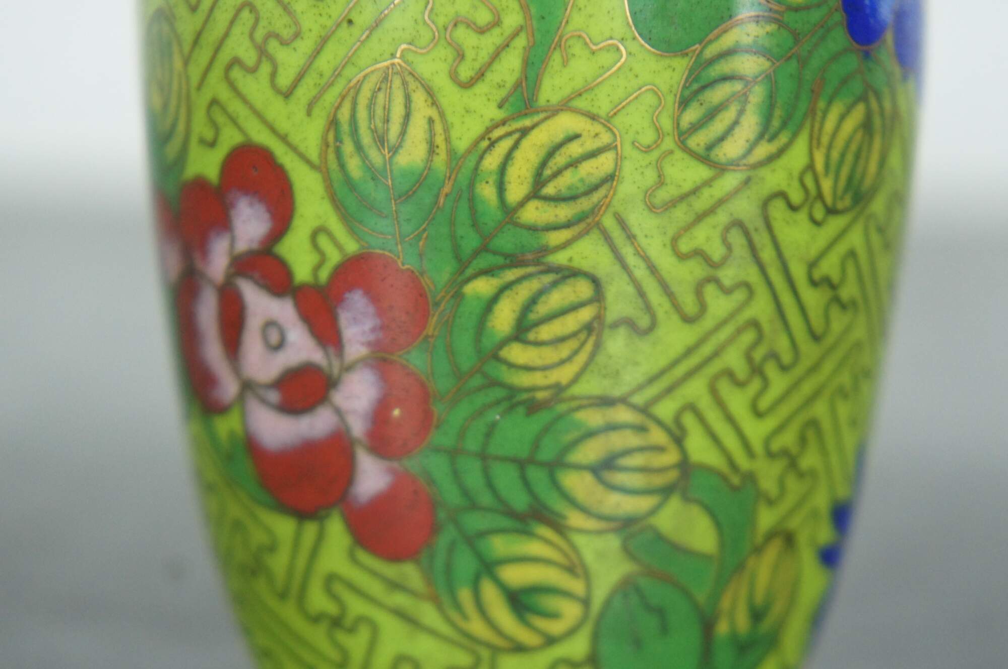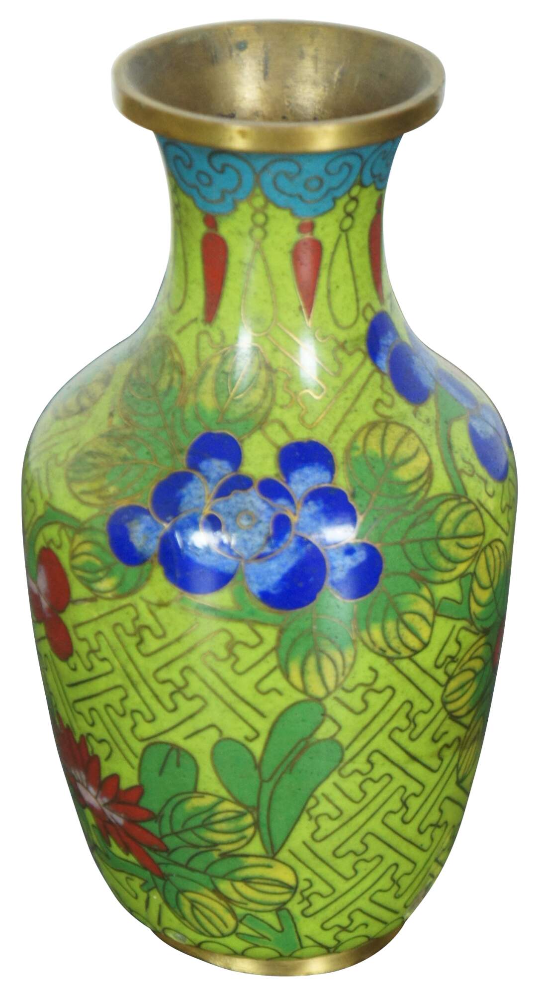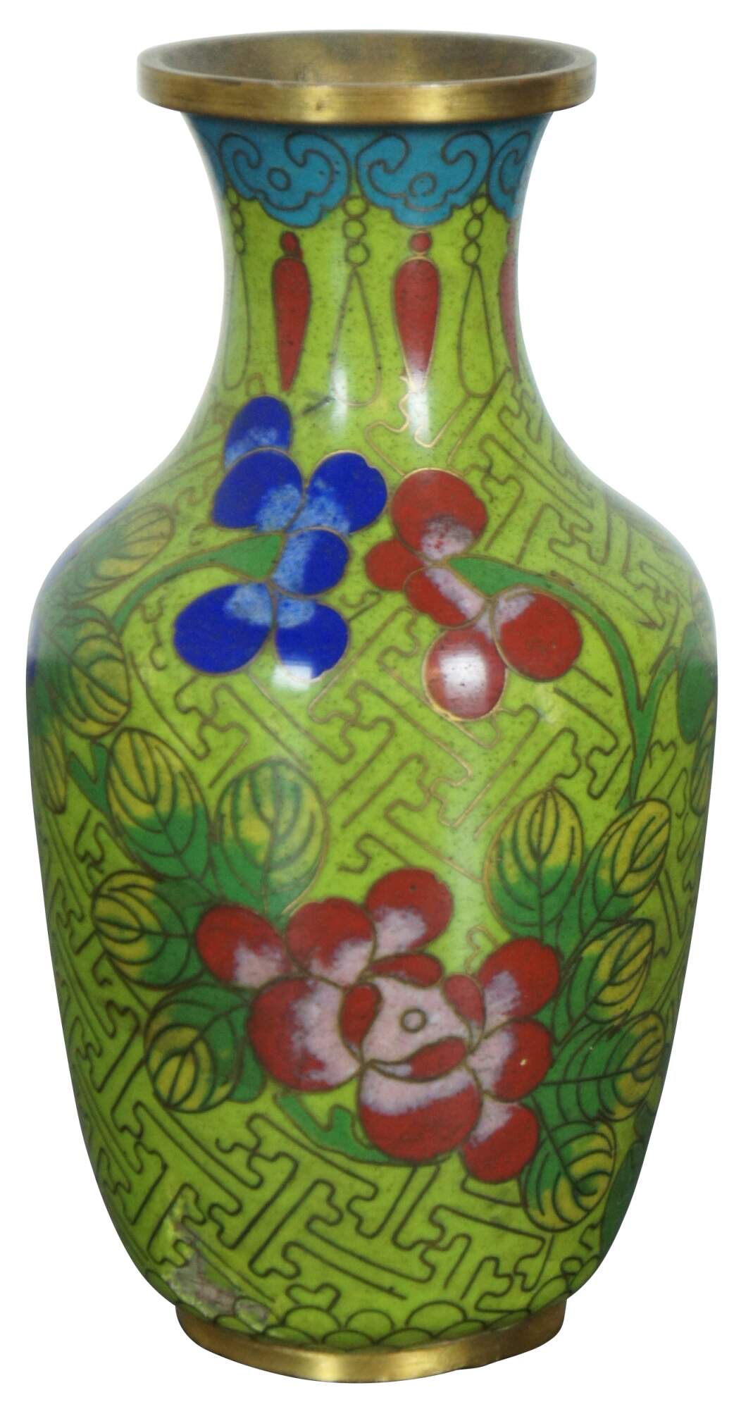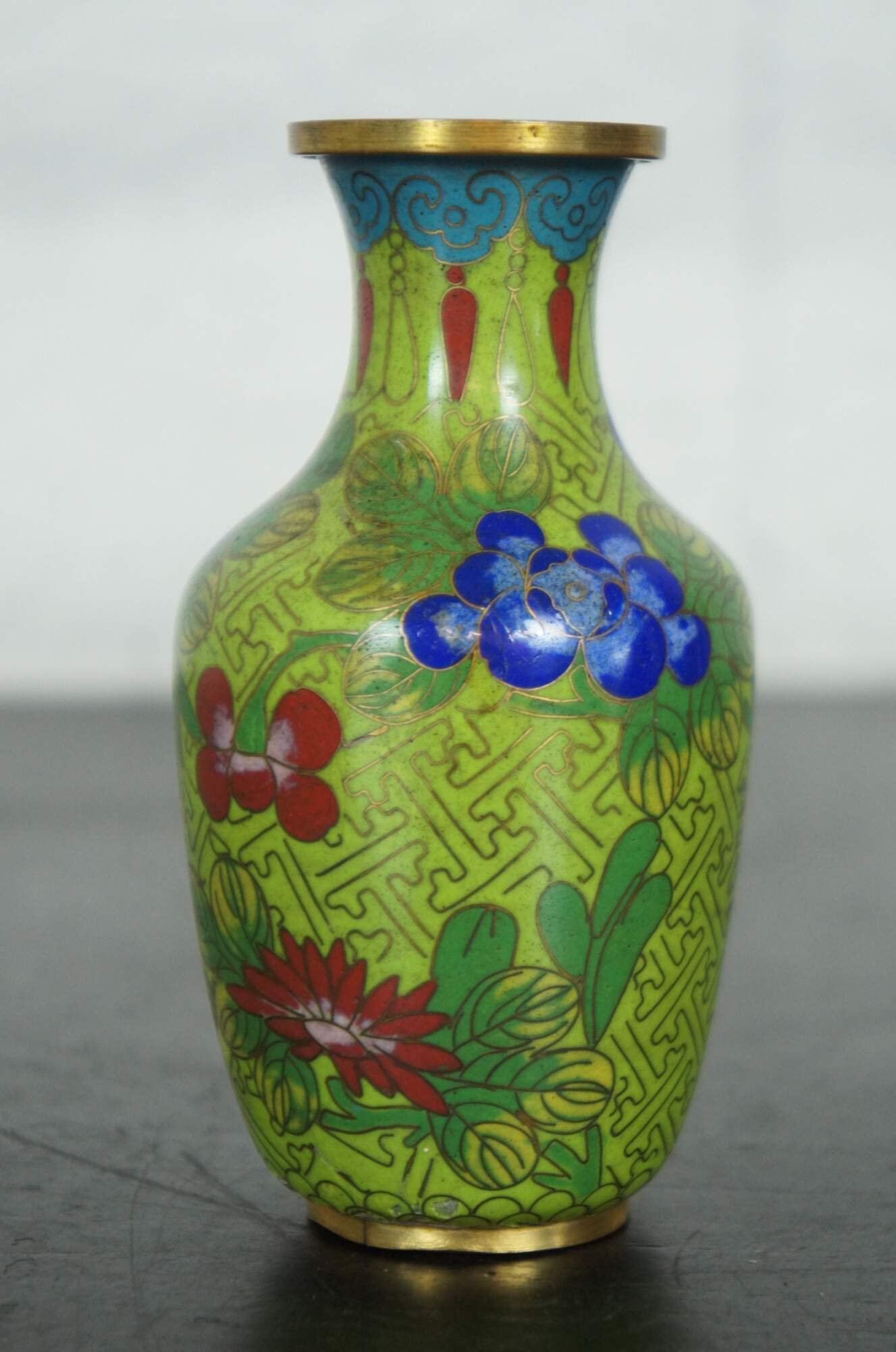 Vintage Chinese cloisonne enamel bud vase featuring red and blue flowers on a lime green ground.