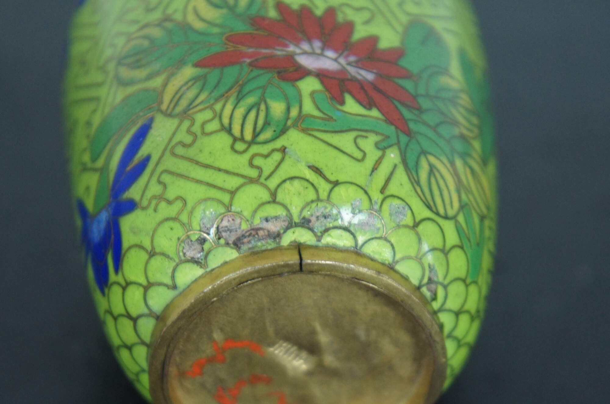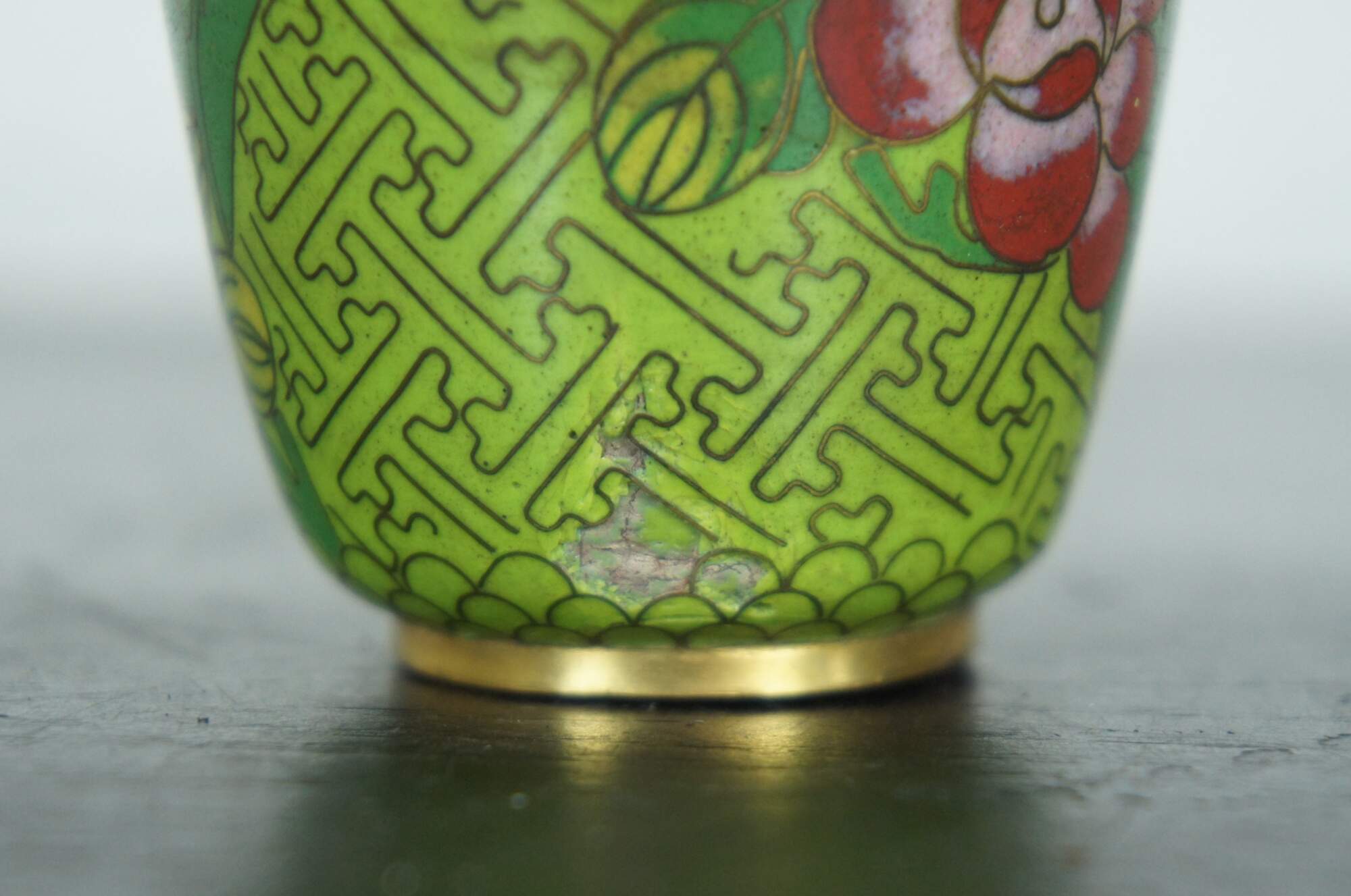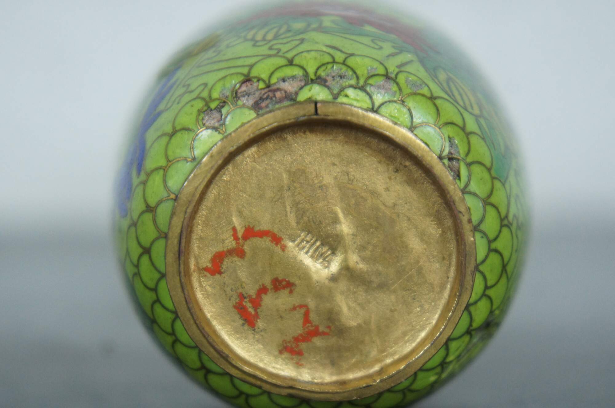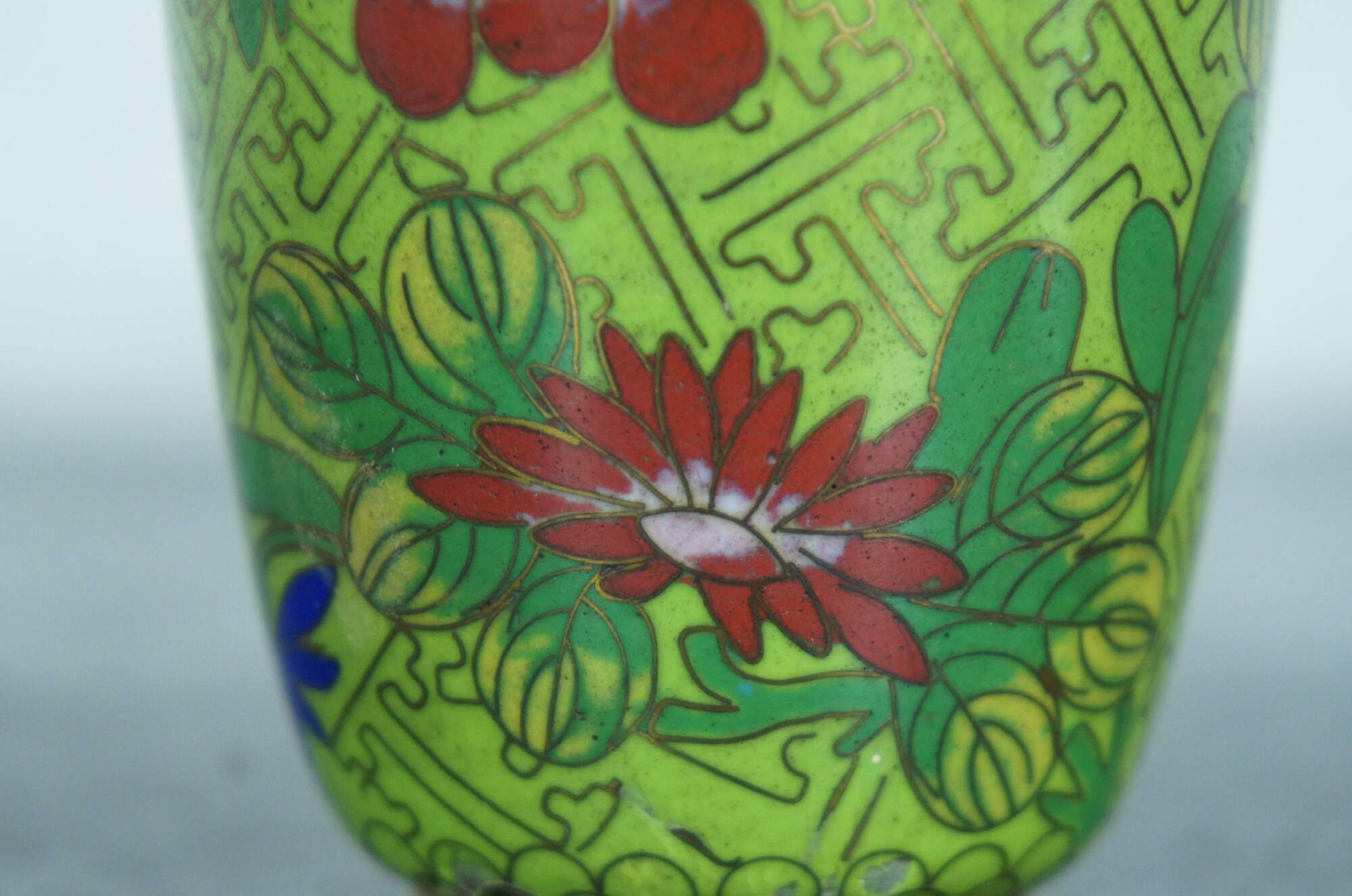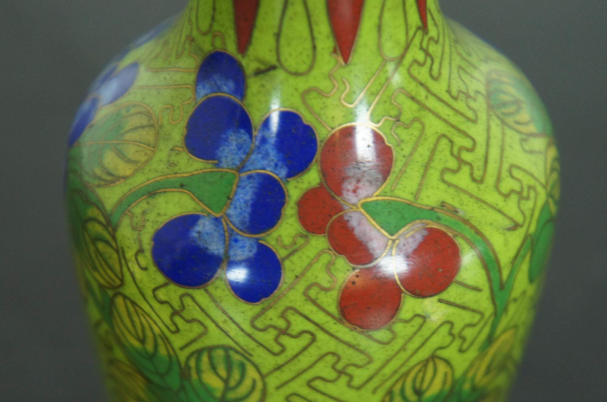 Vintage Chinese cloisonne enamel bud vase featuring red and blue flowers on a lime green ground.