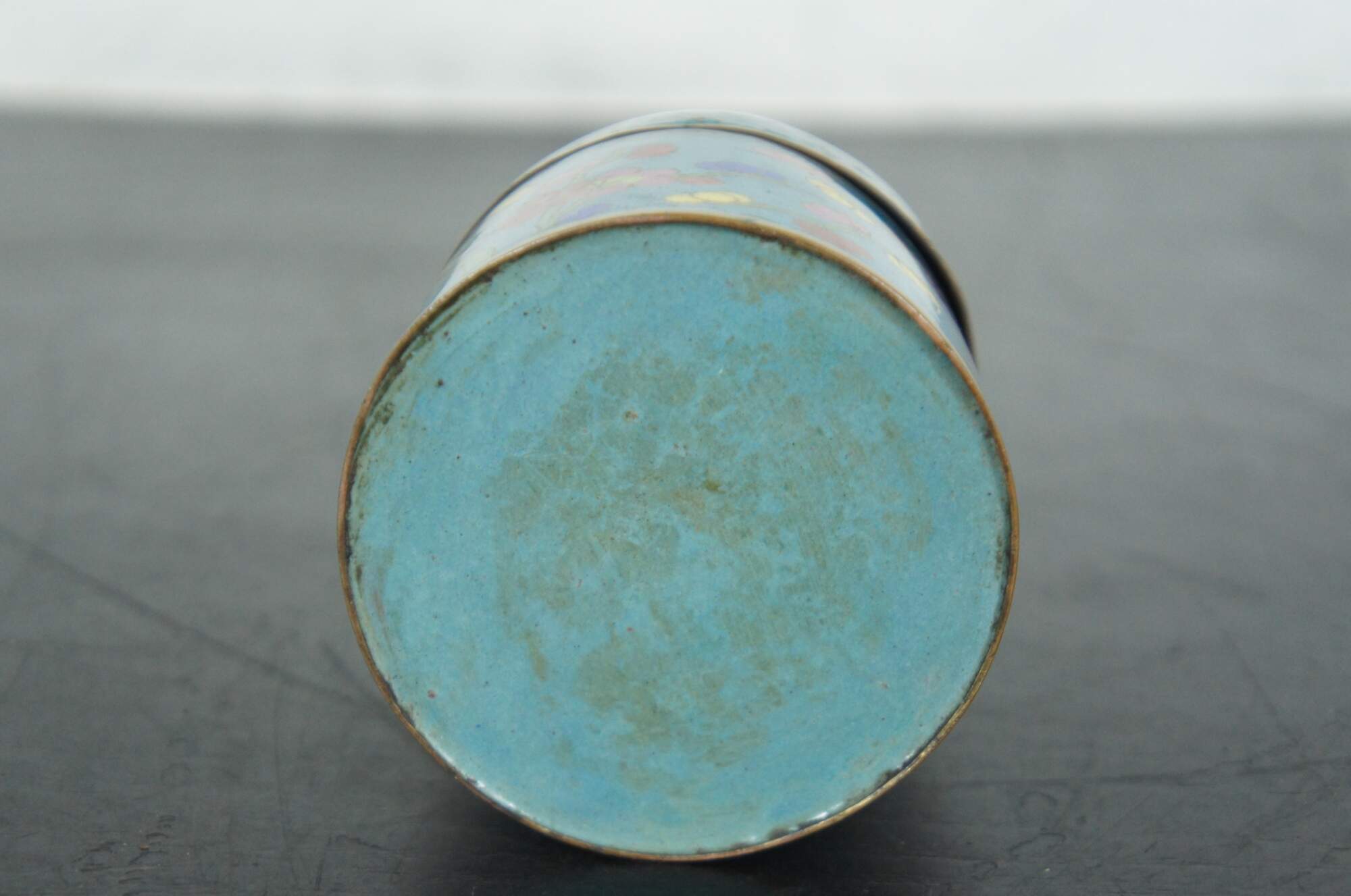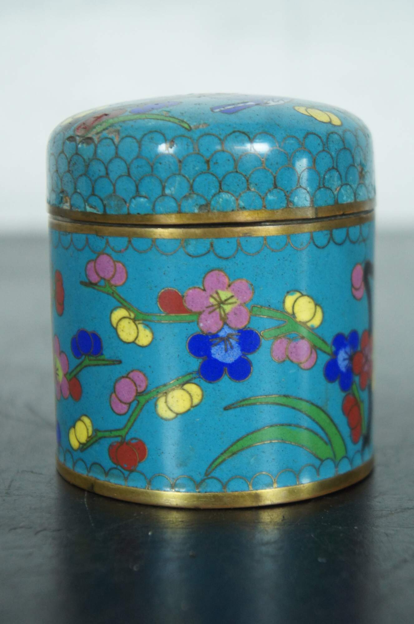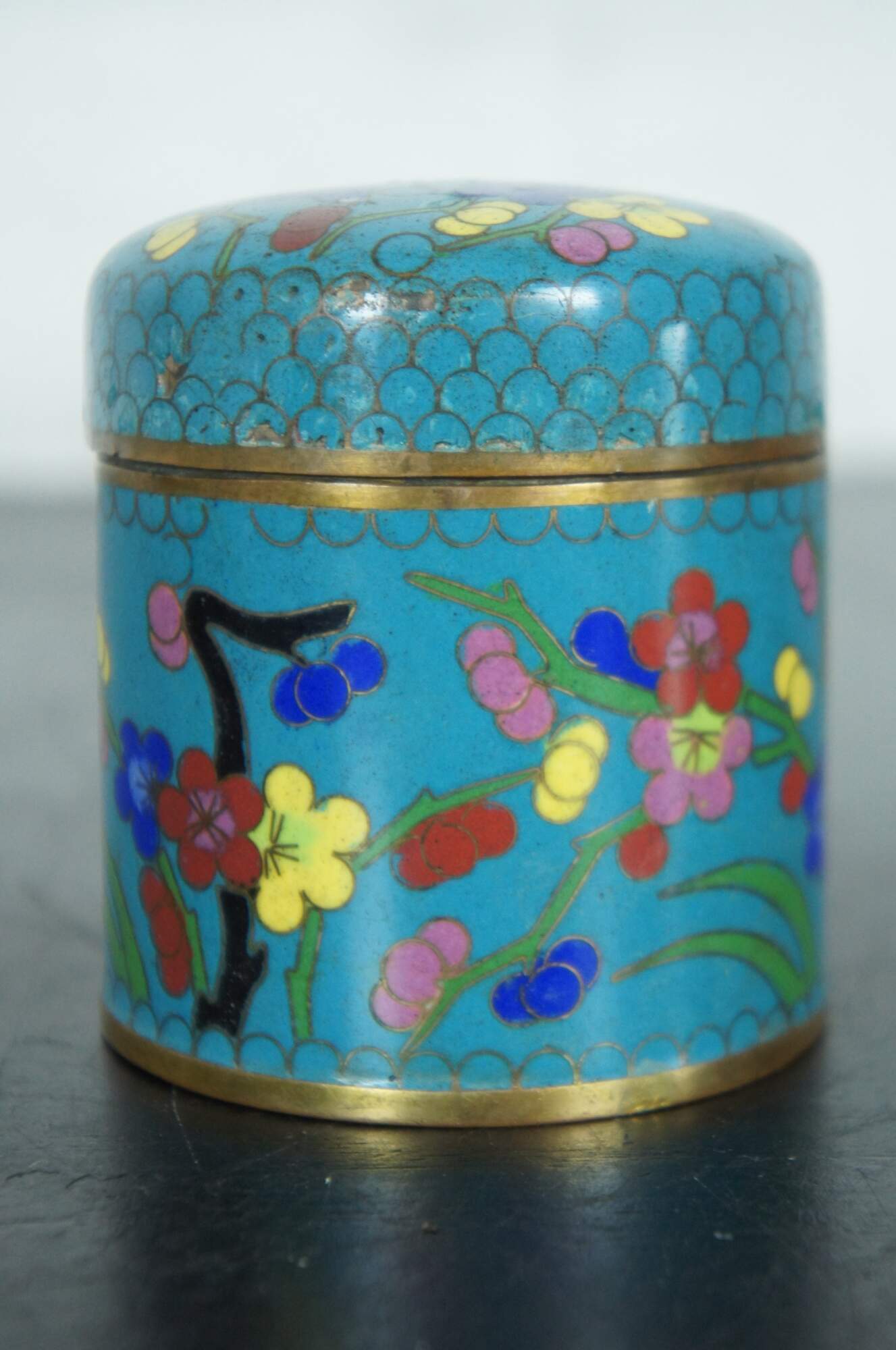 Vintage Chinese cloisonne enamel small tea caddy or canister featuring red and yellow flowers with blue birds on a turquoise ground.