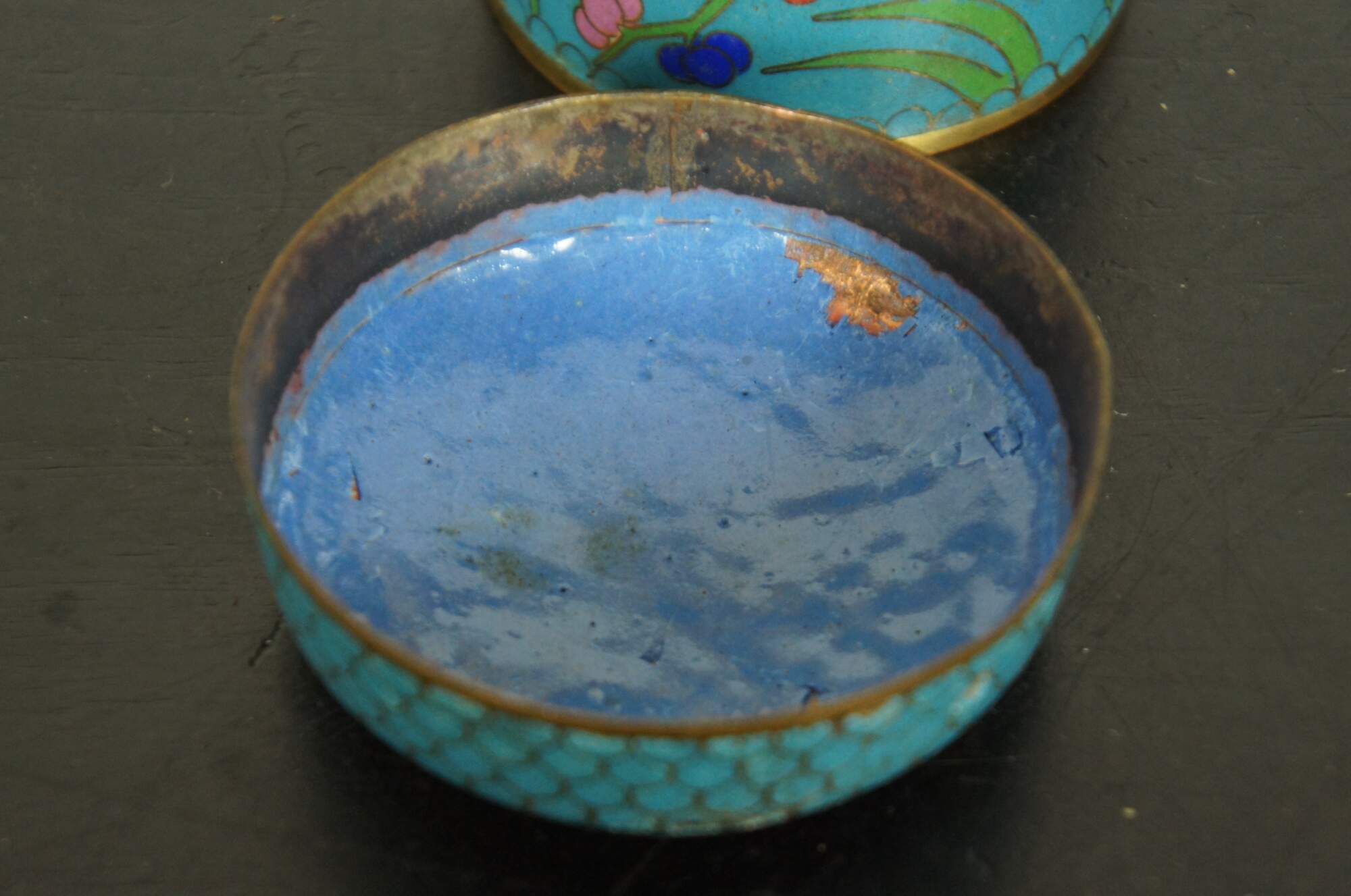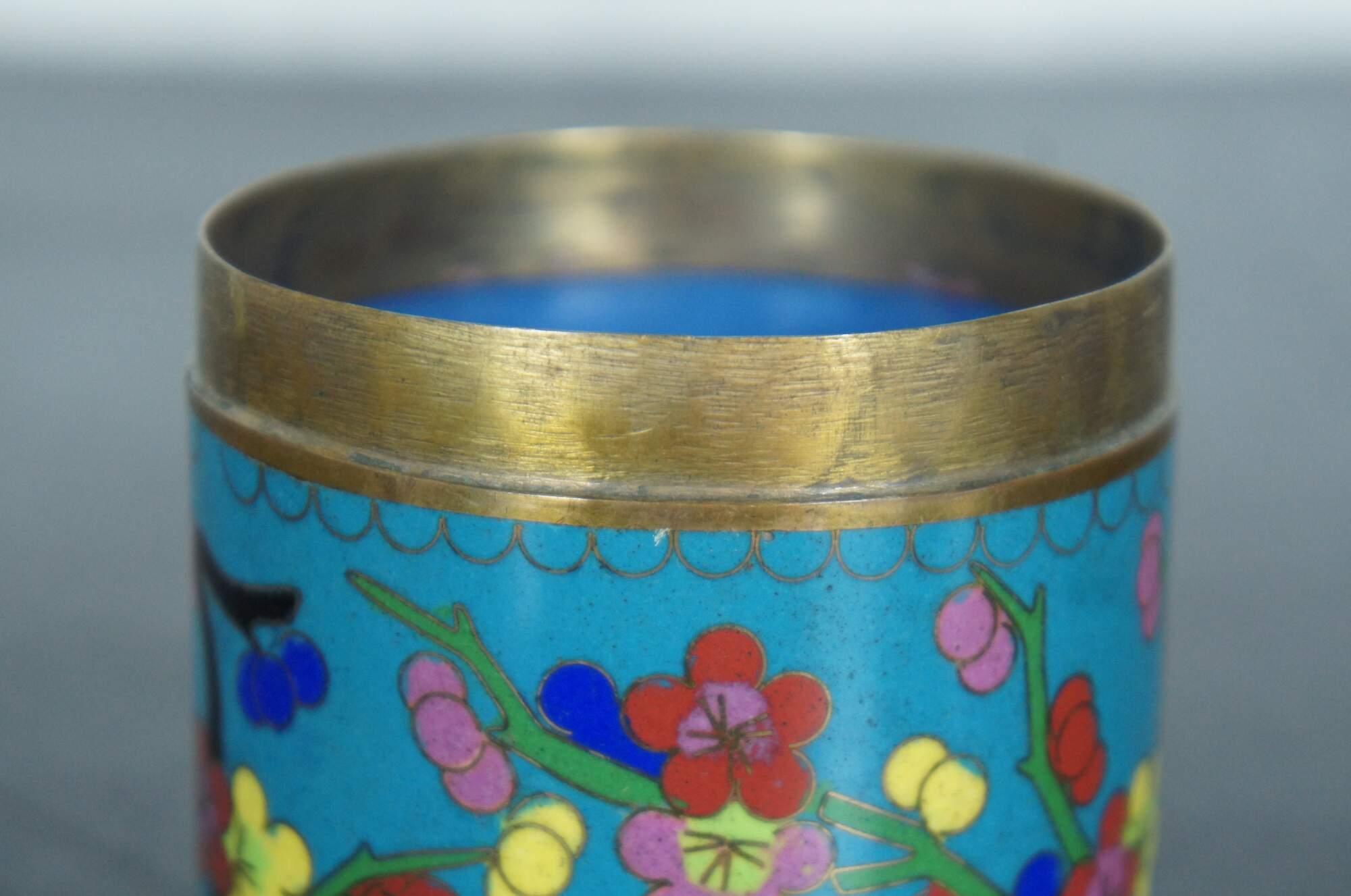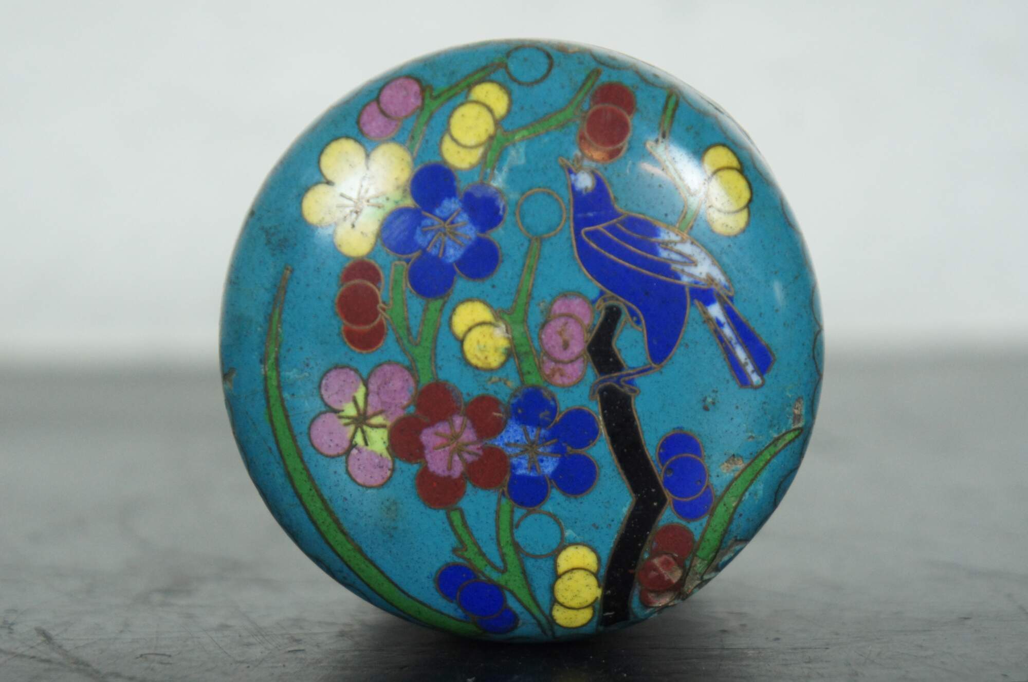 Vintage Chinese cloisonne enamel small tea caddy or canister featuring red and yellow flowers with blue birds on a turquoise ground.